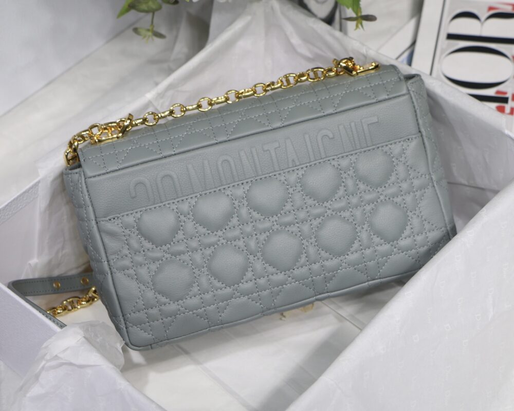 Medium Dior Caro in Grey color The Caro bag combines elegance and modernity. Crafted in supple calfskin, it’s finished with cannage topstitching. The flap is finished with a metal “CD” clasp with antiqued gold finish, inspired by the closure of a Christian Dior perfume bottle. Mini shape with a detachable and adjustable chain shoulder strap for day or evening looks. Carry it in the hand, over the shoulder or across the body Dimensions: 25.5cm x 15.5cm x 8cm