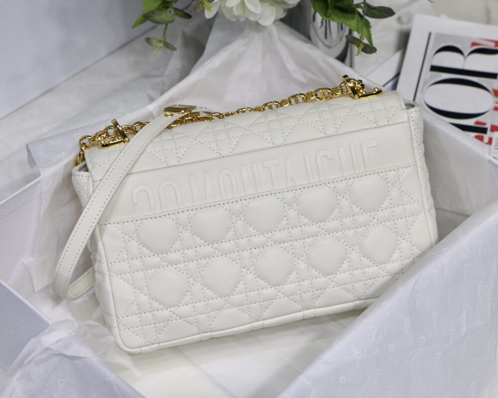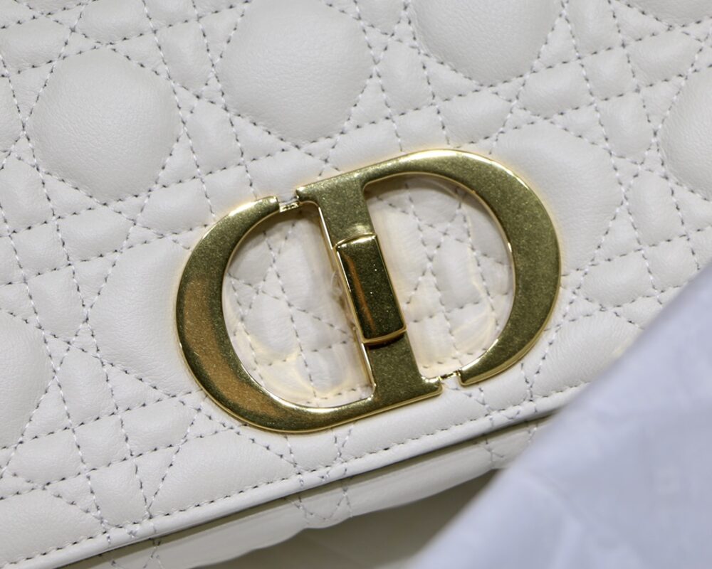 Medium Dior Caro in White color The Caro bag combines elegance and modernity. Crafted in supple calfskin, it’s finished with cannage topstitching. The flap is finished with a metal “CD” clasp with antiqued gold finish, inspired by the closure of a Christian Dior perfume bottle. Mini shape with a detachable and adjustable chain shoulder strap for day or evening looks. Carry it in the hand, over the shoulder or across the body Dimensions: 25.5cm x 15.5cm x 8cm