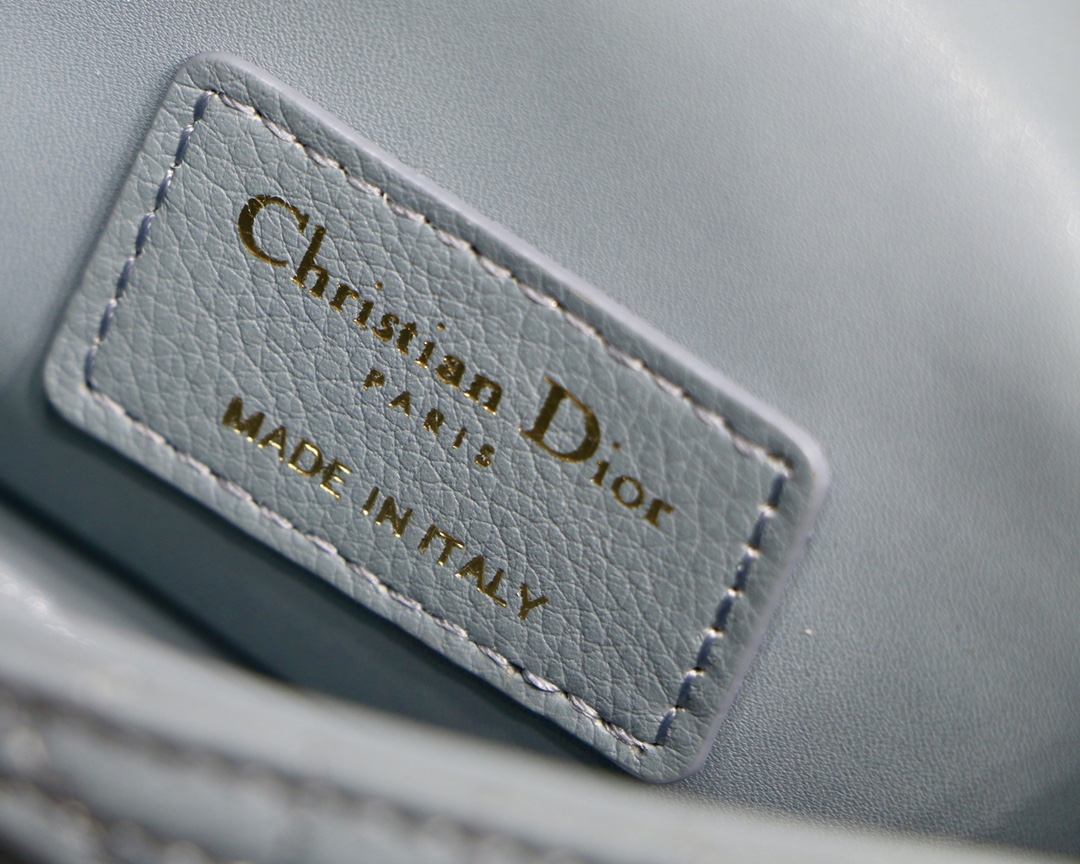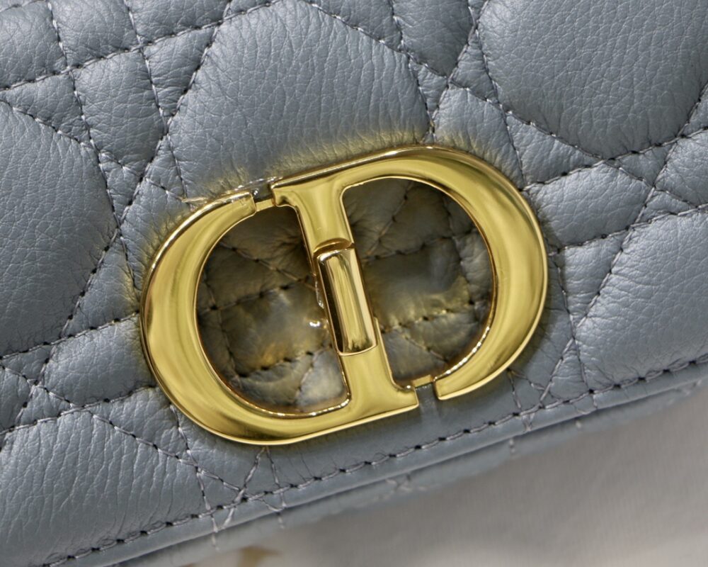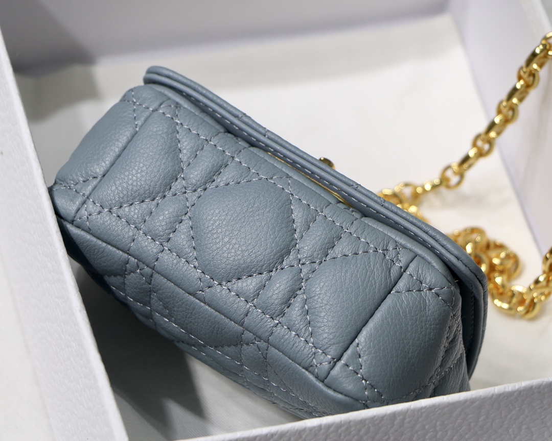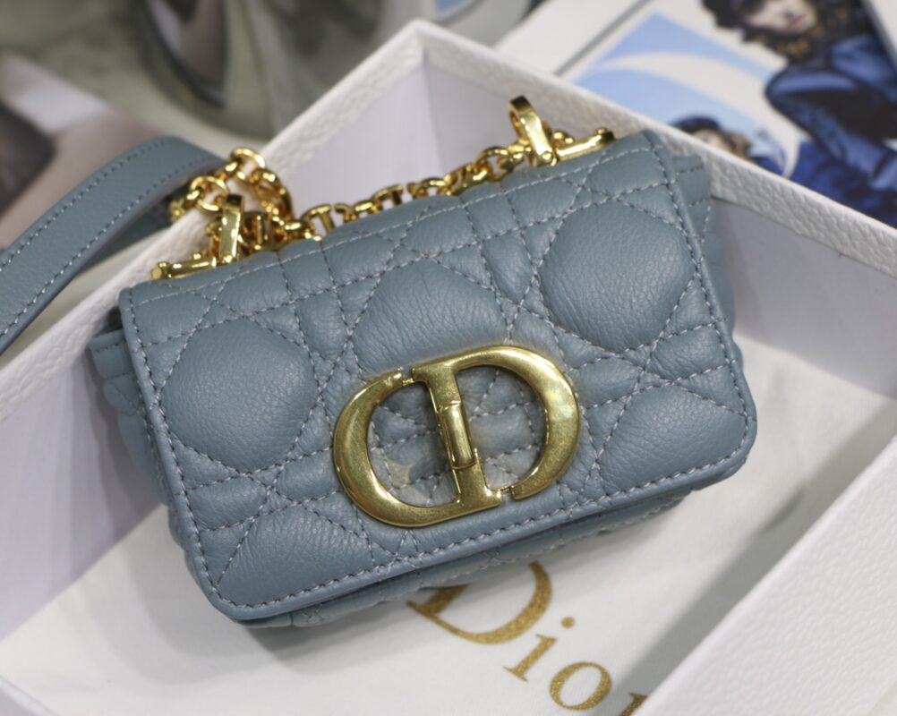 Dior Caro Super Mini Series S8016 Light Blue The Caro bag combines elegance and modernity. Crafted in supple calfskin, it’s finished with cannage topstitching. The flap is finished with a metal “CD” clasp with antiqued gold finish, inspired by the closure of a Christian Dior perfume bottle. Mini shape with a detachable and adjustable chain shoulder strap for day or evening looks. Dimensions: 13 x 8 x 4 cm Holds AirPods Pro, lipstick and keys