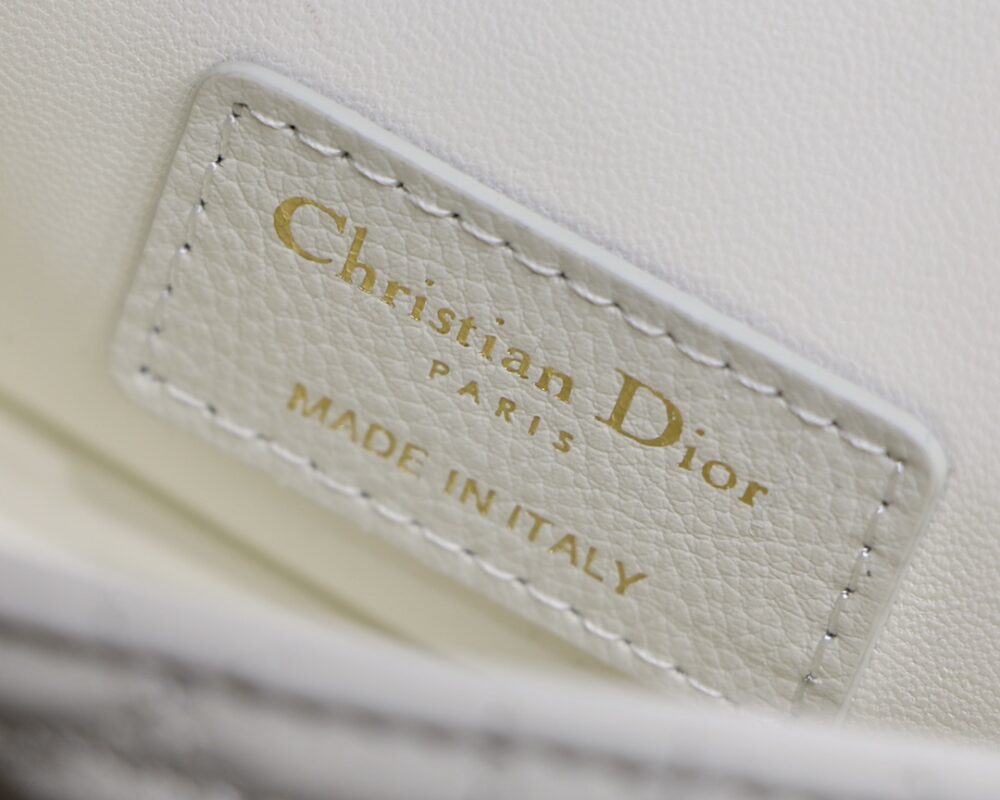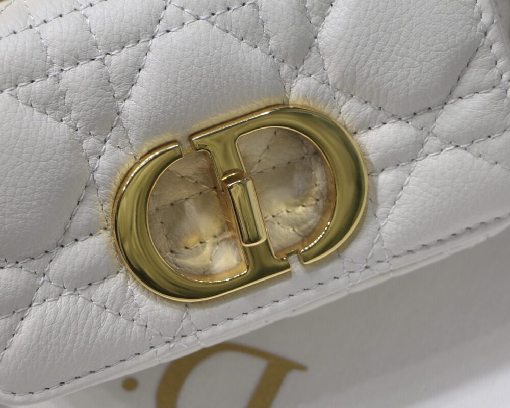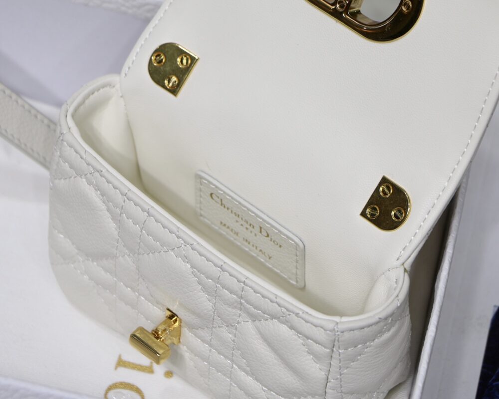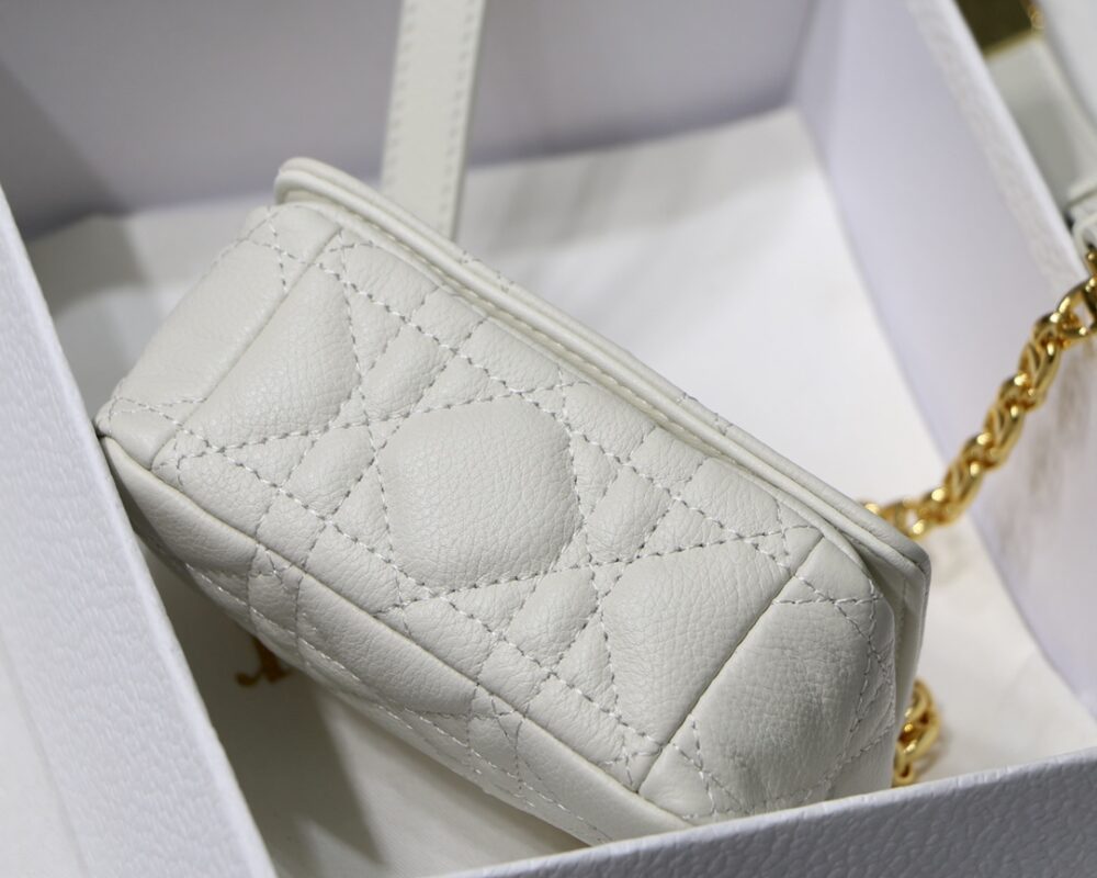 Dior Caro Super Mini Series S8016 White The Caro bag combines elegance and modernity. Crafted in supple calfskin, it’s finished with cannage topstitching. The flap is finished with a metal “CD” clasp with antiqued gold finish, inspired by the closure of a Christian Dior perfume bottle. Mini shape with a detachable and adjustable chain shoulder strap for day or evening looks. Dimensions: 13 x 8 x 4 cm Holds AirPods Pro, lipstick and keys