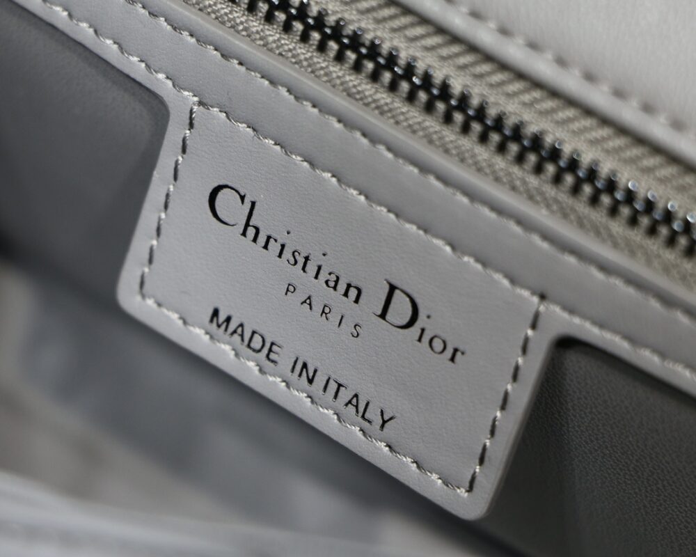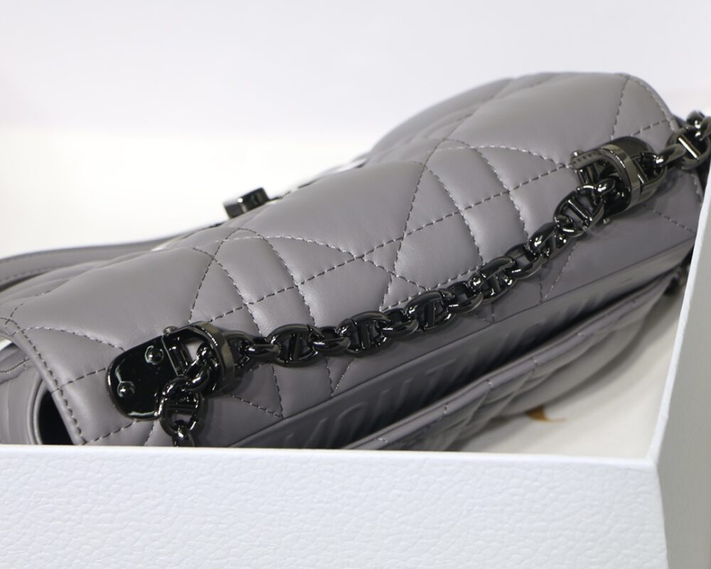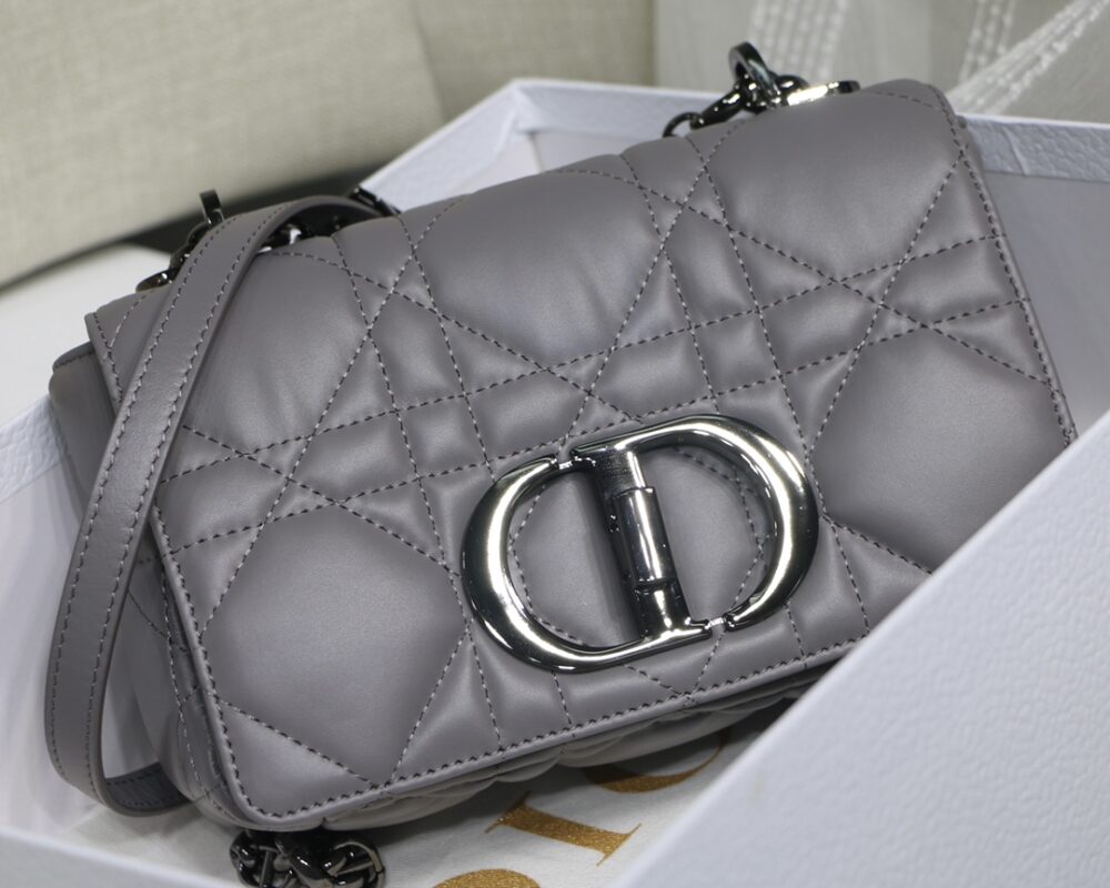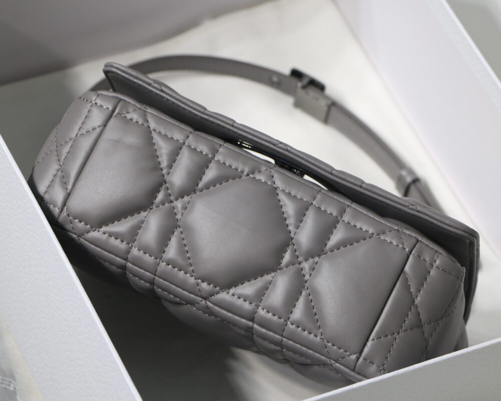 Dior Grey Caro Small Rattan Plaid Series The Caro bag combines elegance and modernity. Meticulously crafted from calfskin, it features an original quilted-effect oversized cannage topstitching for a distinctive look. The flap is decorated with a metal clad knob “CD” clasp, inspired by the closure of a perfume bottle, with a detachable “CD” logo chain shoulder strap, which can be carried by hand or on the shoulder, or can be replaced with a wide shoulder strap embroidered with D for everyday looks or evening ensembles.Small size: 20 x 12 x 7 cm