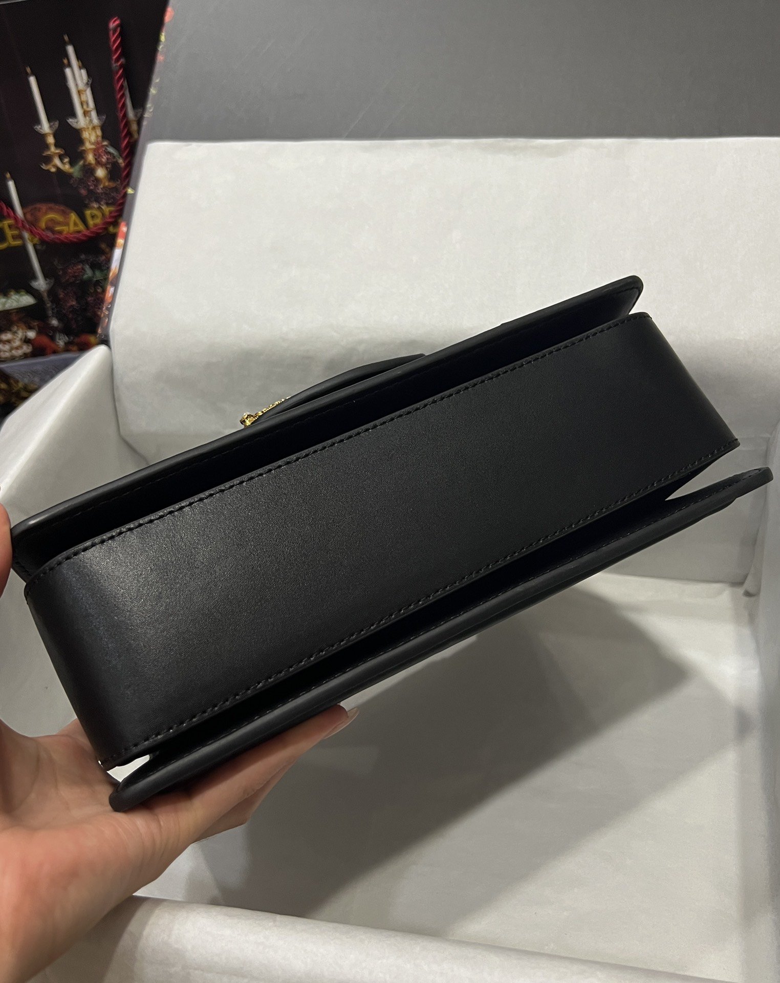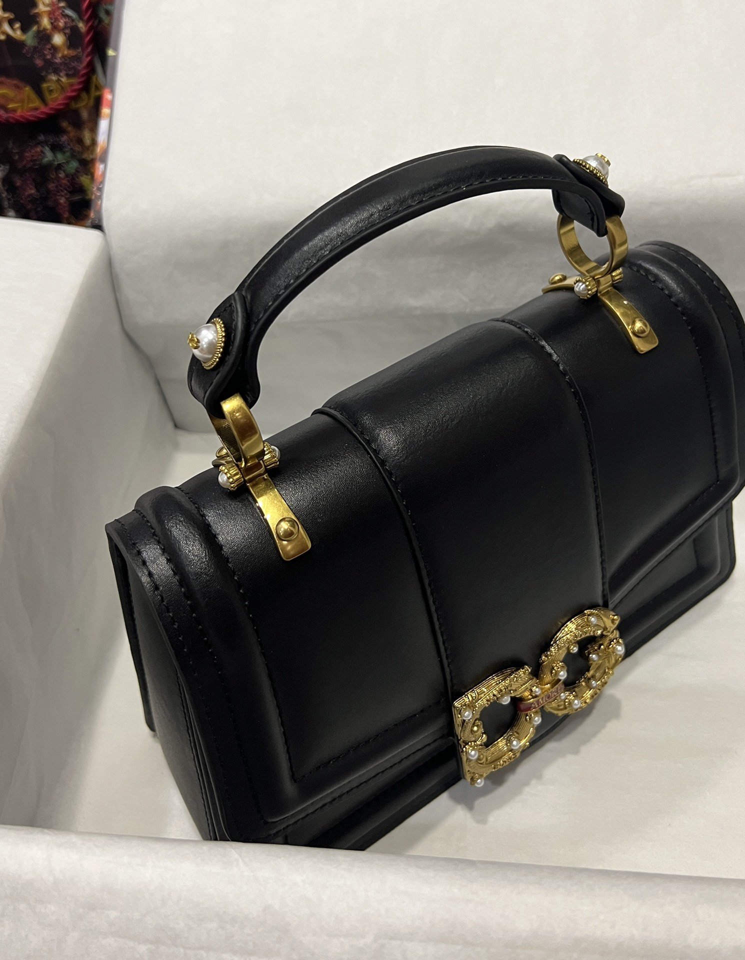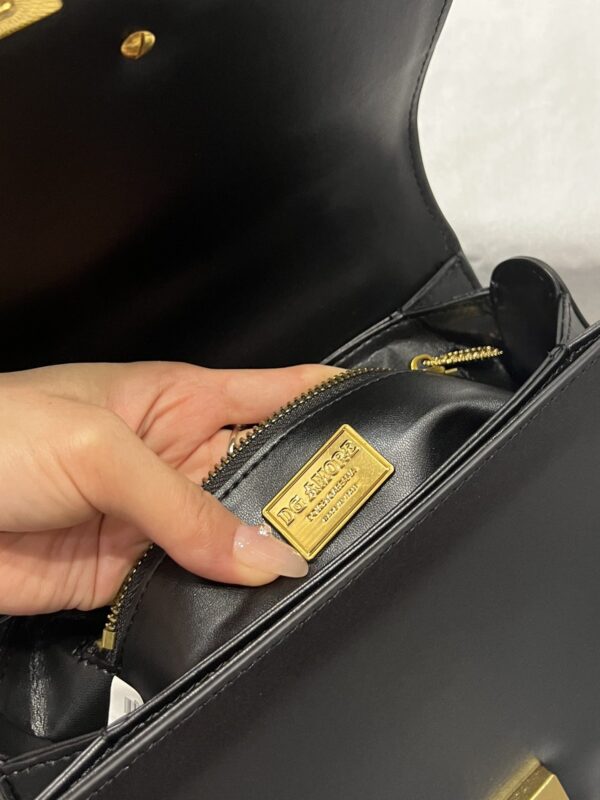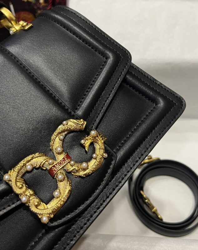 Dolce & Gabbana 27 DG Amore Bag in Black Calfskin unique, highlighting the baroque style of “Amore” formed on the red scroll with antique plated brass decorated with pearls and “Amore” letter scrolls connecting the two letters of DG Metal DG logo, concealed press-stud closure, top calfskin handle with pearl logo details on sides, adjustable and detachable calfskin shoulder strap, interior contrasting nappa calfskin construction, zipped pocket with branded slide and The two compartments in the middle divider delicate and handmade. The top of the bag is hand-painted.
