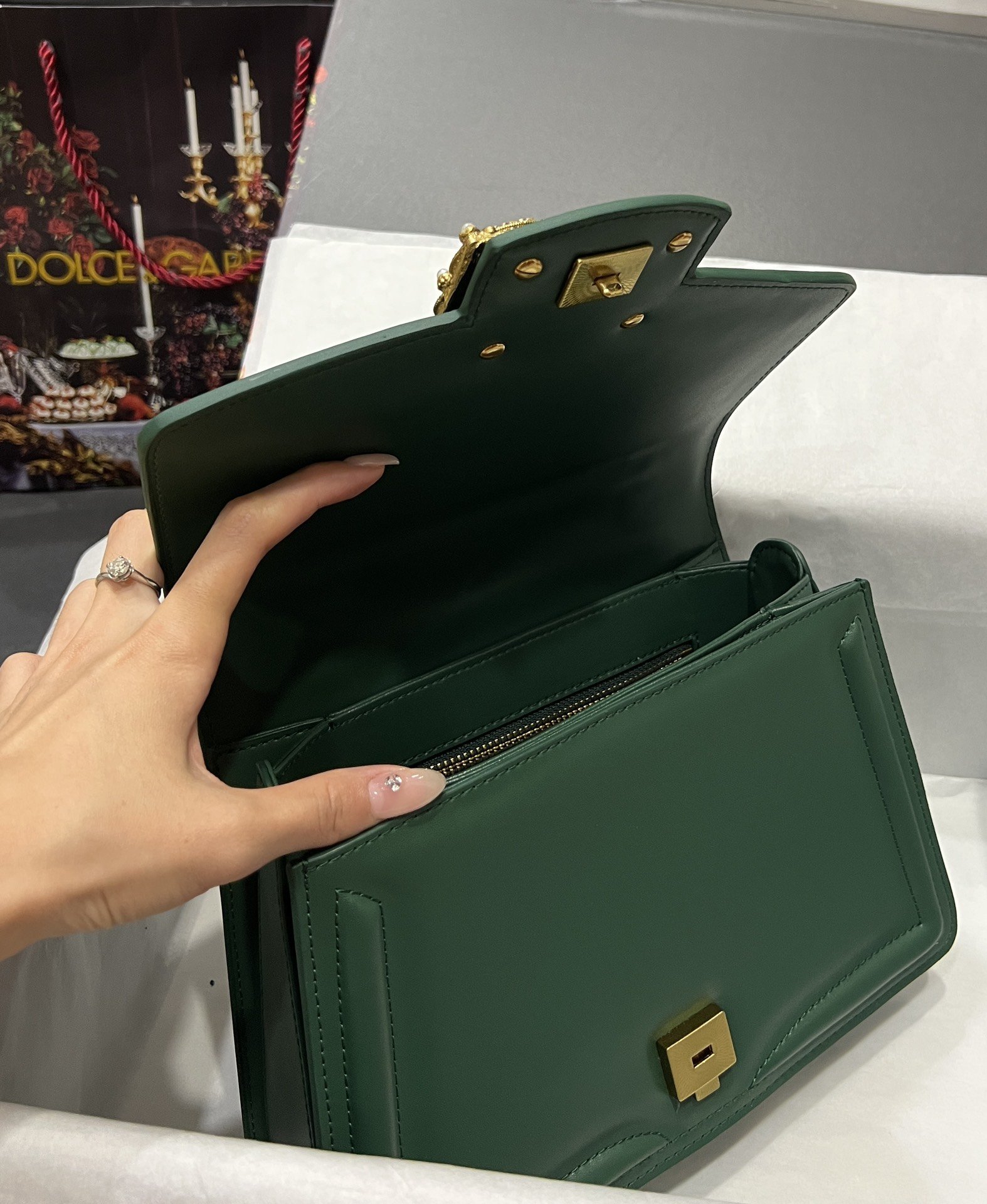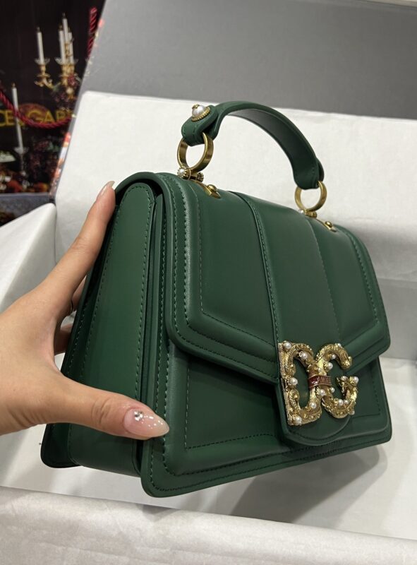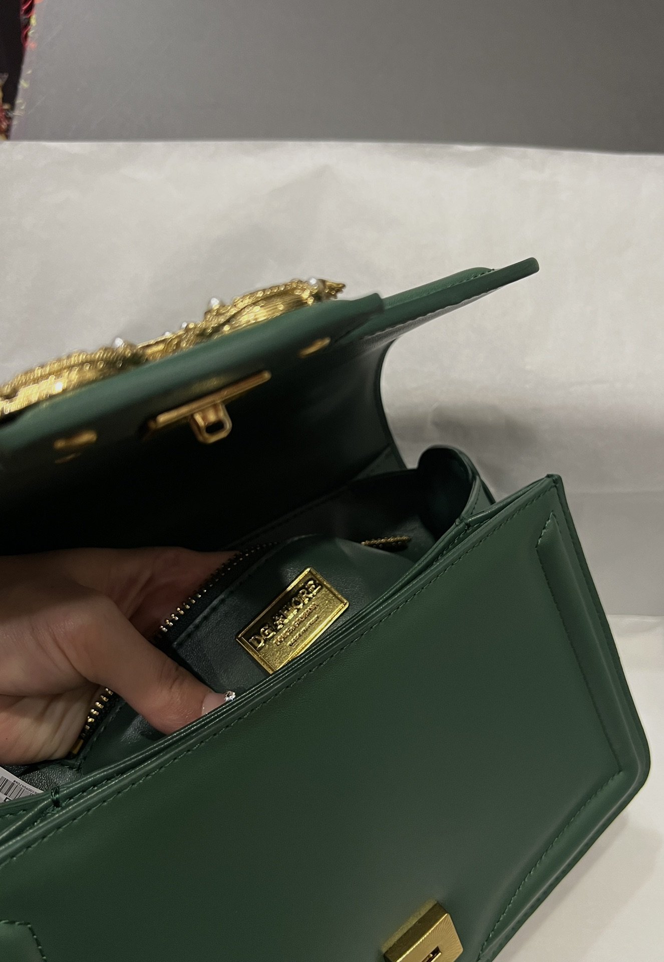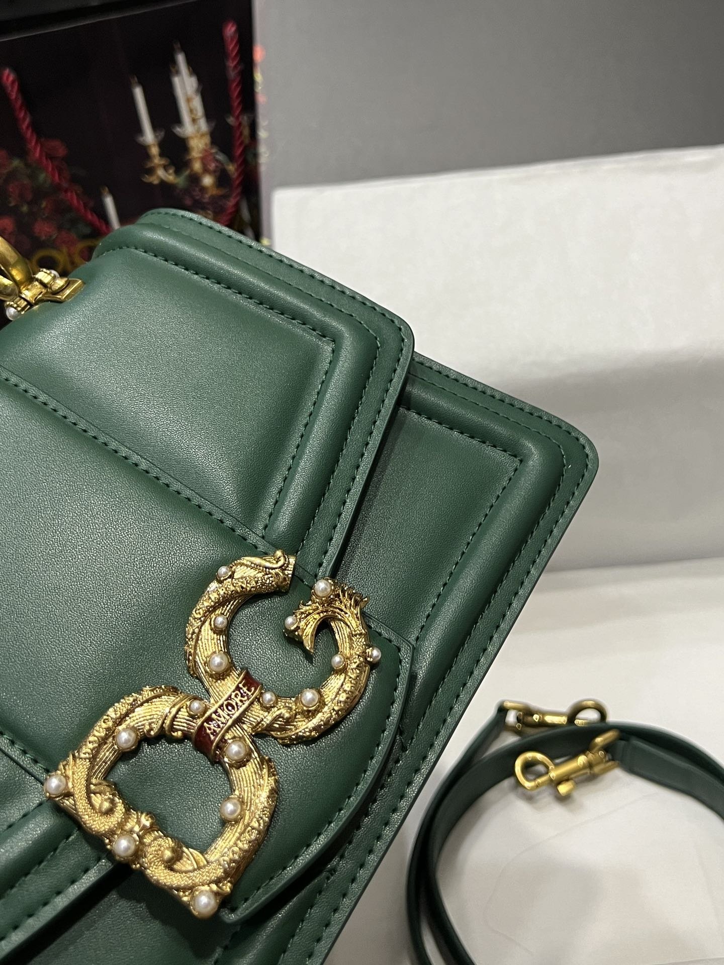 Dolce & Gabbana 27 DG Amore Bag in Green Calfskin unique, highlighting the baroque style of “Amore” formed on the red scroll with antique plated brass decorated with pearls and “Amore” letter scrolls connecting the two letters of DG Metal DG logo, concealed press-stud closure, top calfskin handle with pearl logo details on sides, adjustable and detachable calfskin shoulder strap, interior contrasting nappa calfskin construction, zipped pocket with branded slide and The two compartments in the middle divider delicate and handmade. The top of the bag is hand-painted.