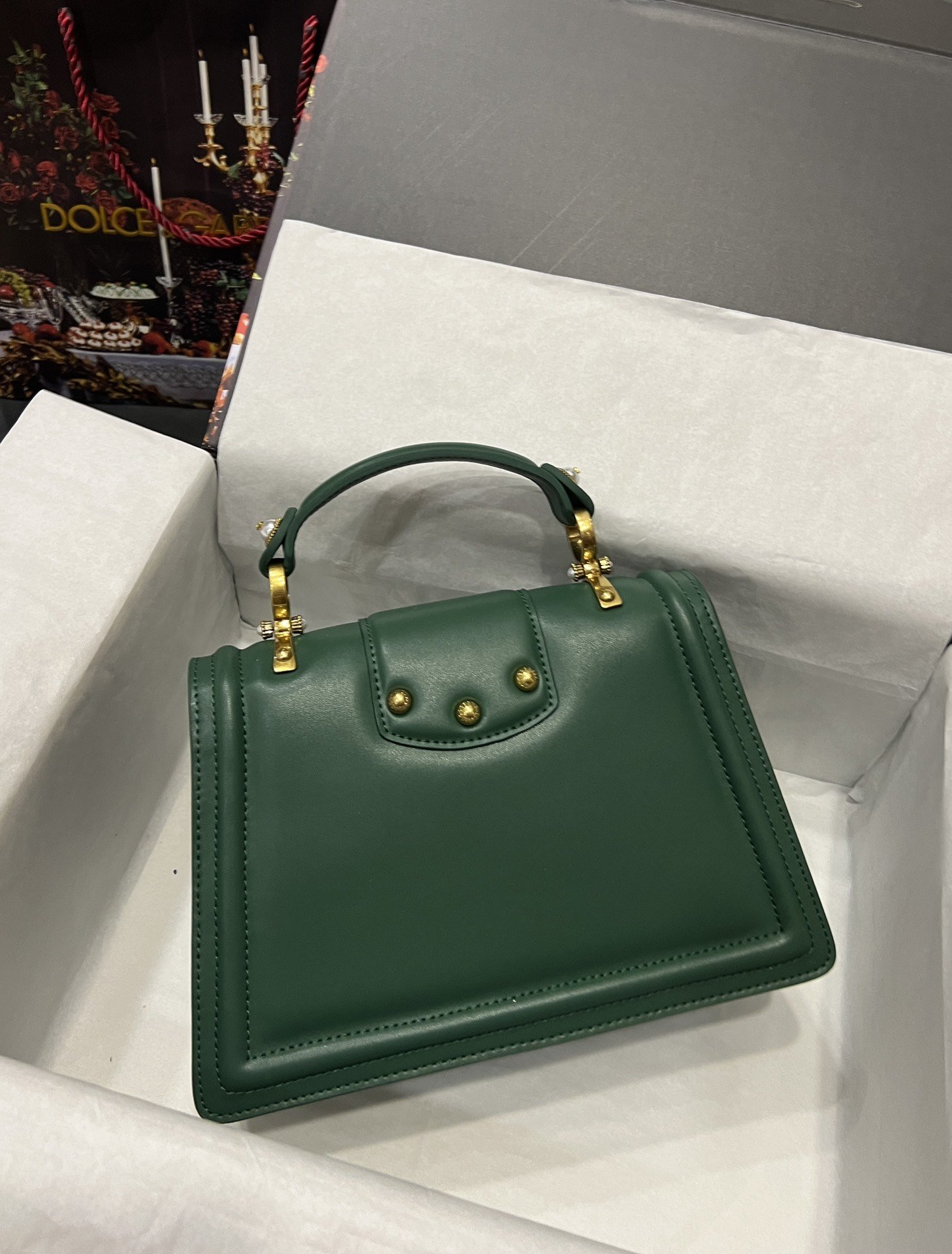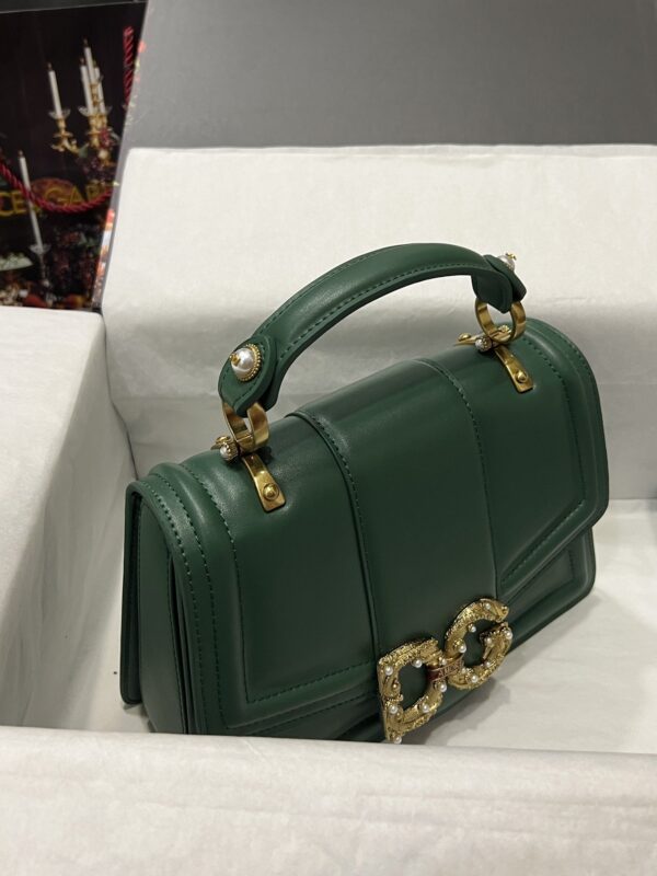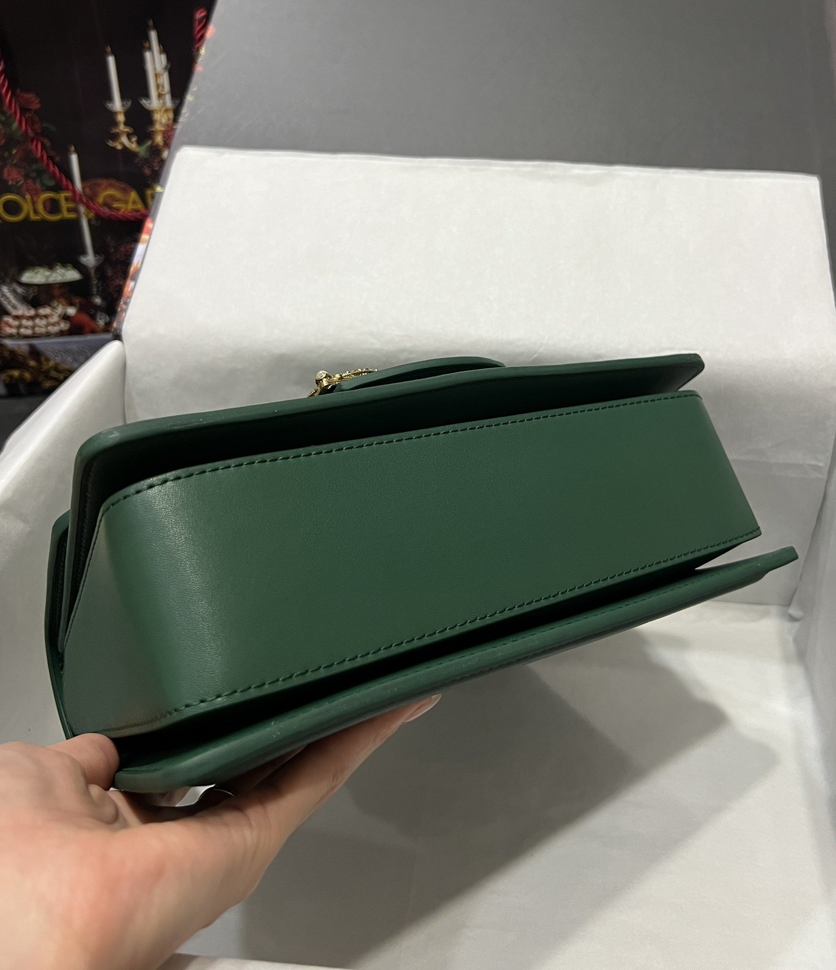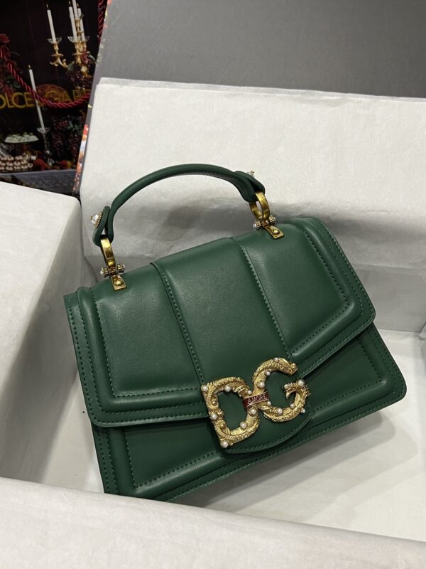 Dolce & Gabbana 27 DG Amore Bag in Green Calfskin unique, highlighting the baroque style of “Amore” formed on the red scroll with antique plated brass decorated with pearls and “Amore” letter scrolls connecting the two letters of DG Metal DG logo, concealed press-stud closure, top calfskin handle with pearl logo details on sides, adjustable and detachable calfskin shoulder strap, interior contrasting nappa calfskin construction, zipped pocket with branded slide and The two compartments in the middle divider delicate and handmade. The top of the bag is hand-painted.