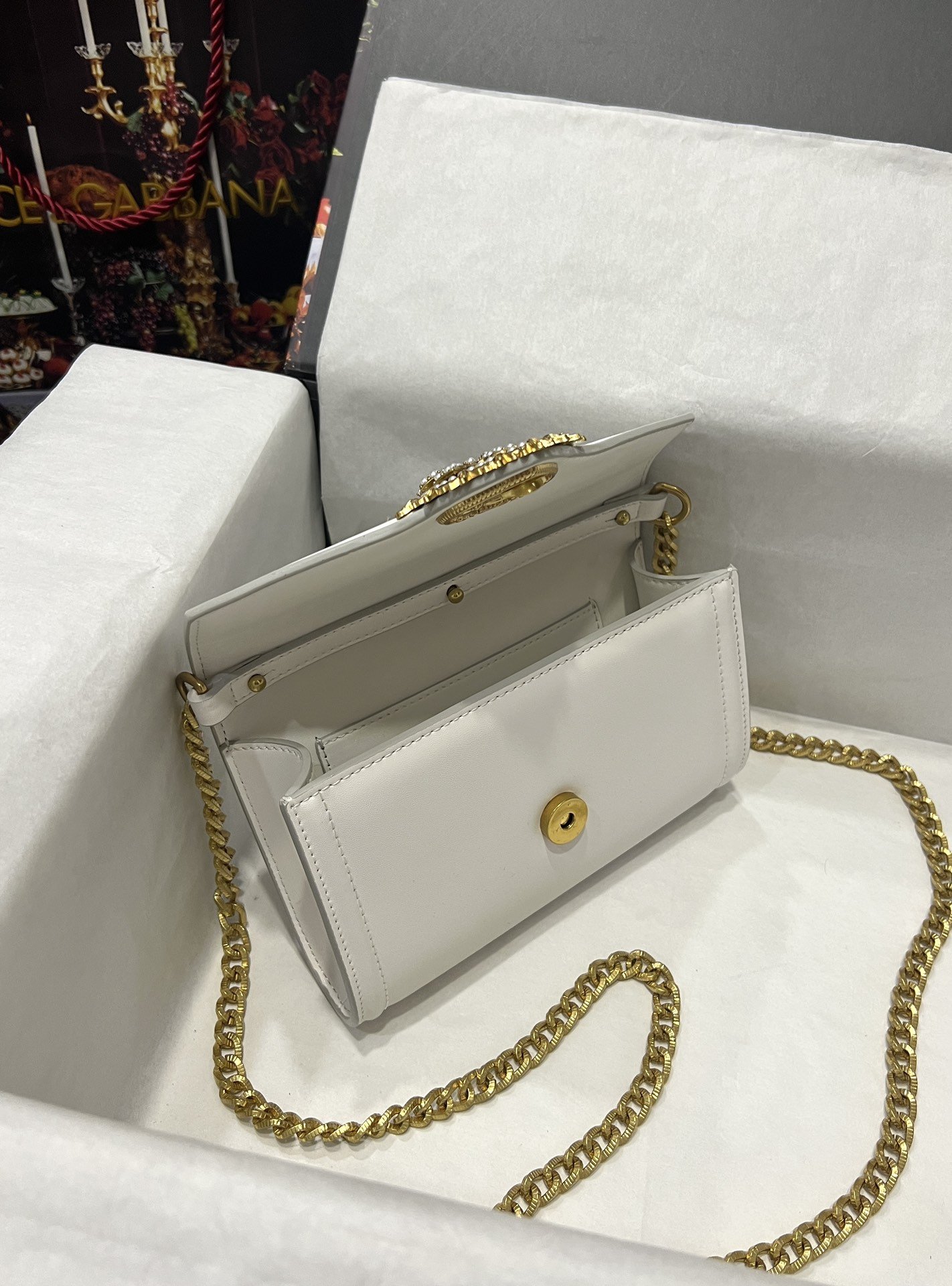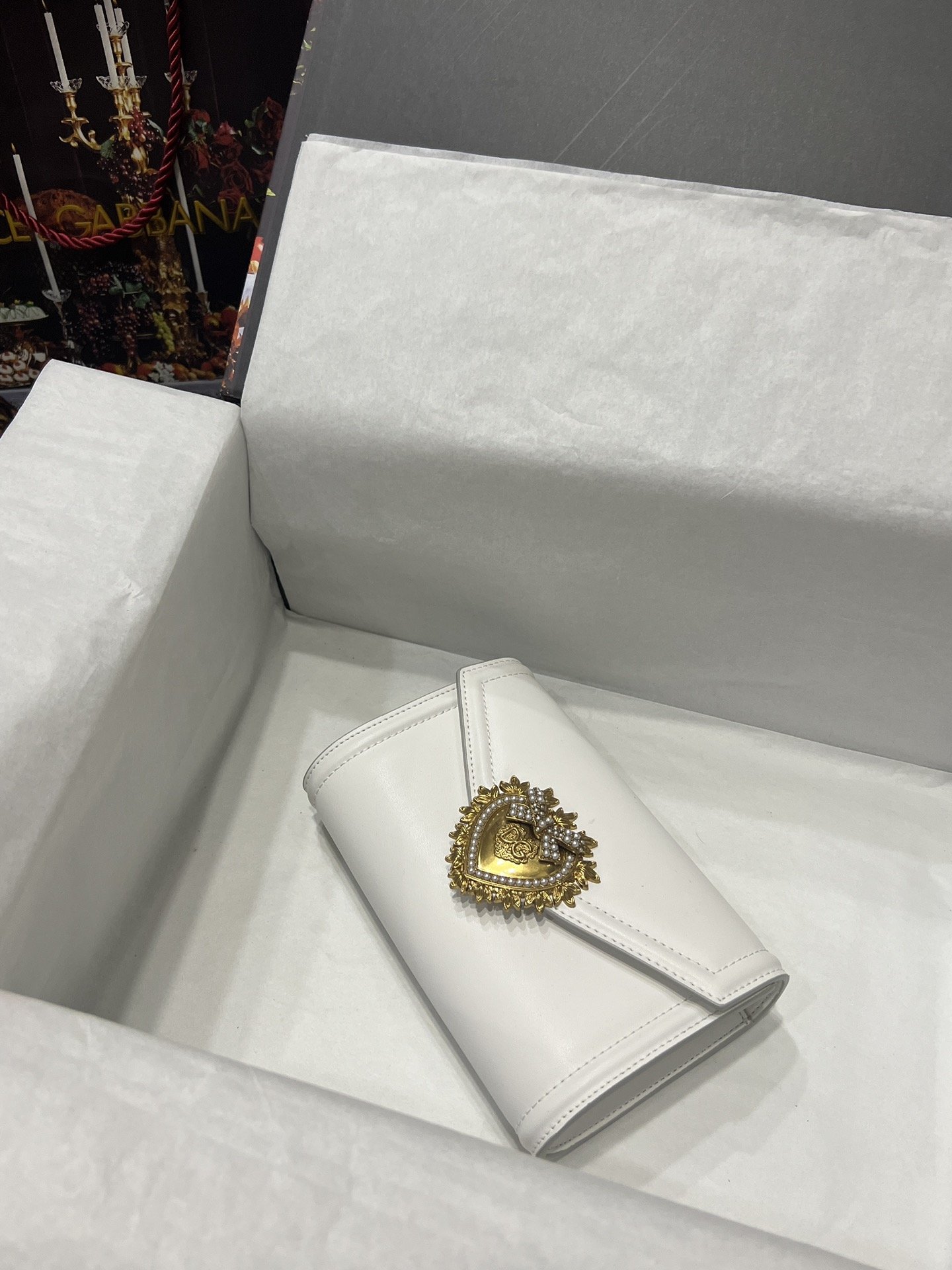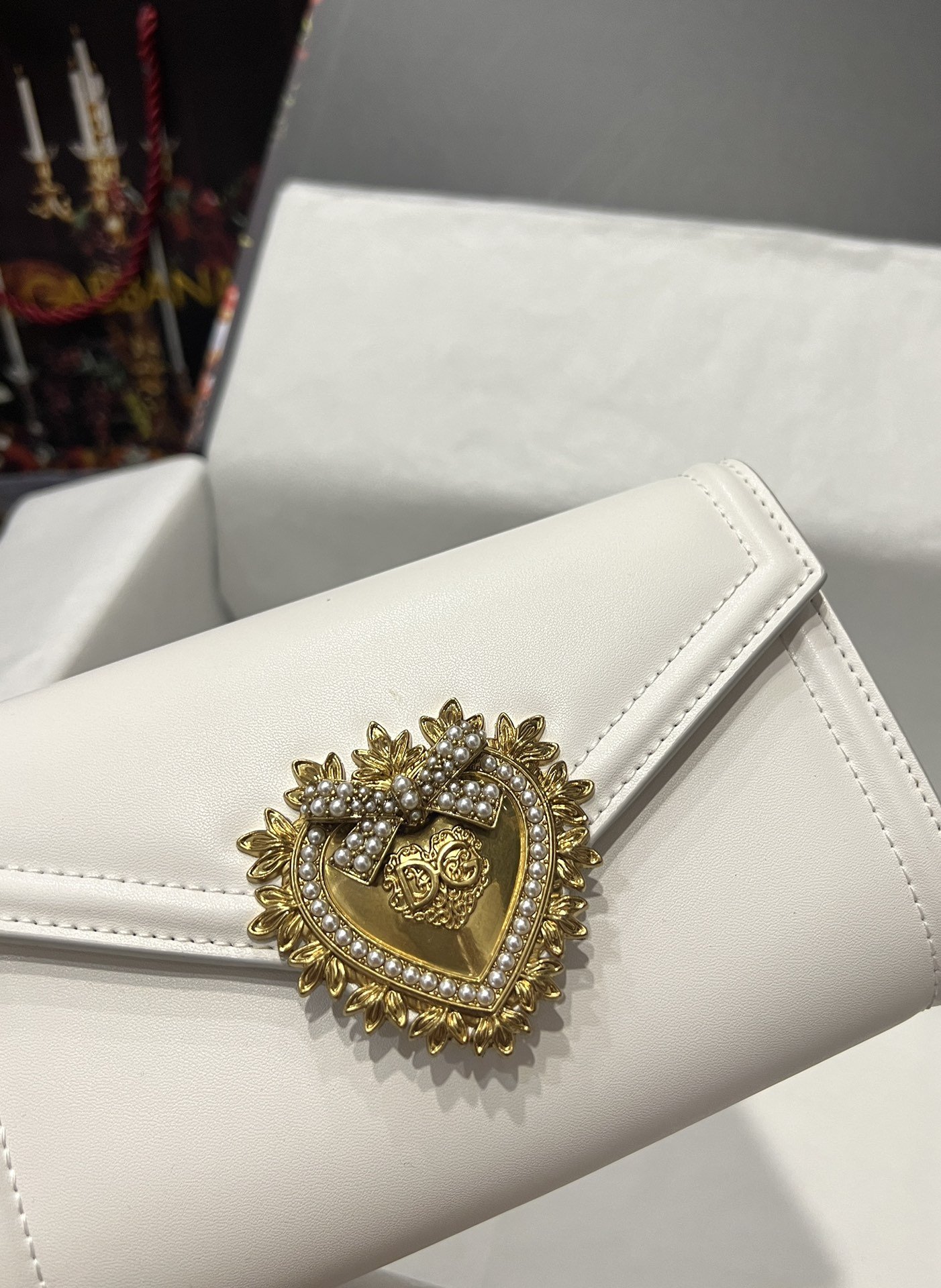 Top-level original Dolce&Gabbana Double-use crossbody clutch. Simple and fashionable, using imported cowhide raw material butterfly gold-plated DG logo inlaid with pearls. The front flap adopts a hidden magnetic buckle closure, and the internal metal logo plate size11.5 *18.5*3.5cm with packing box.
