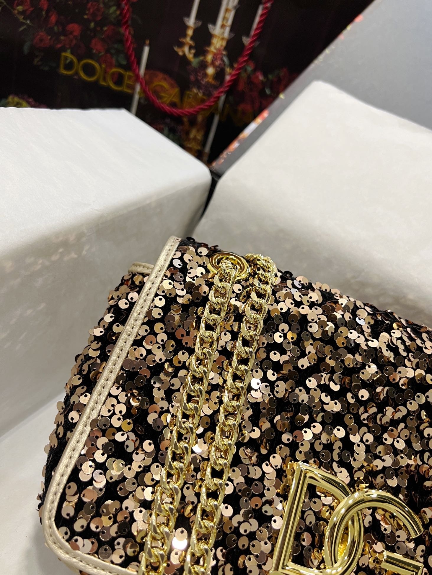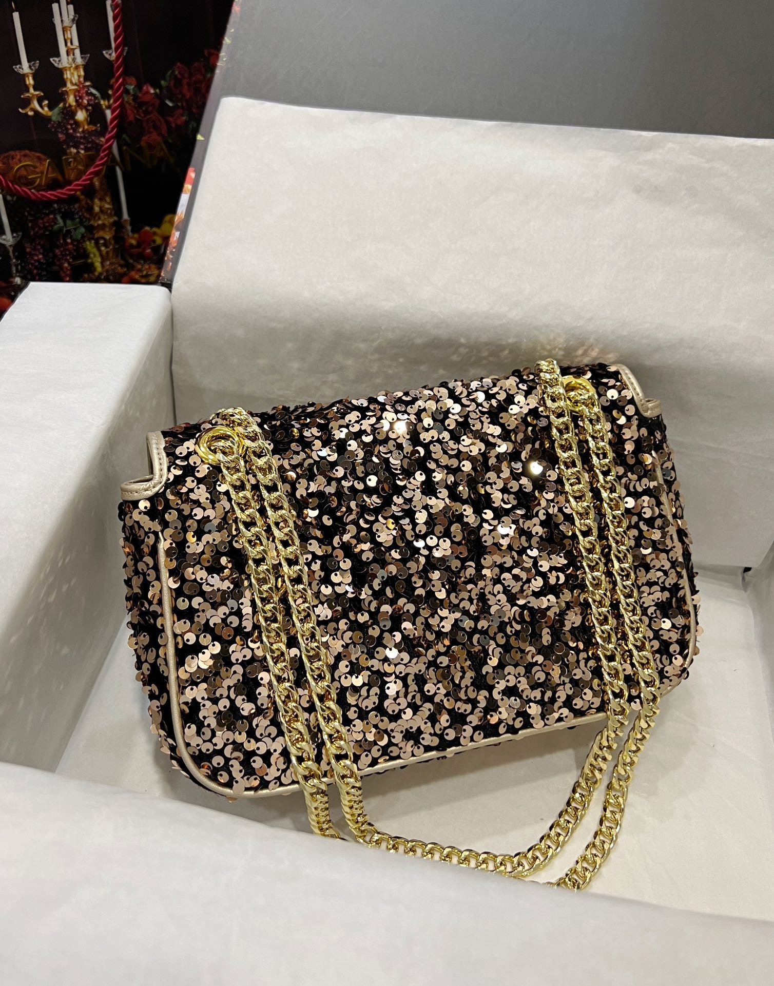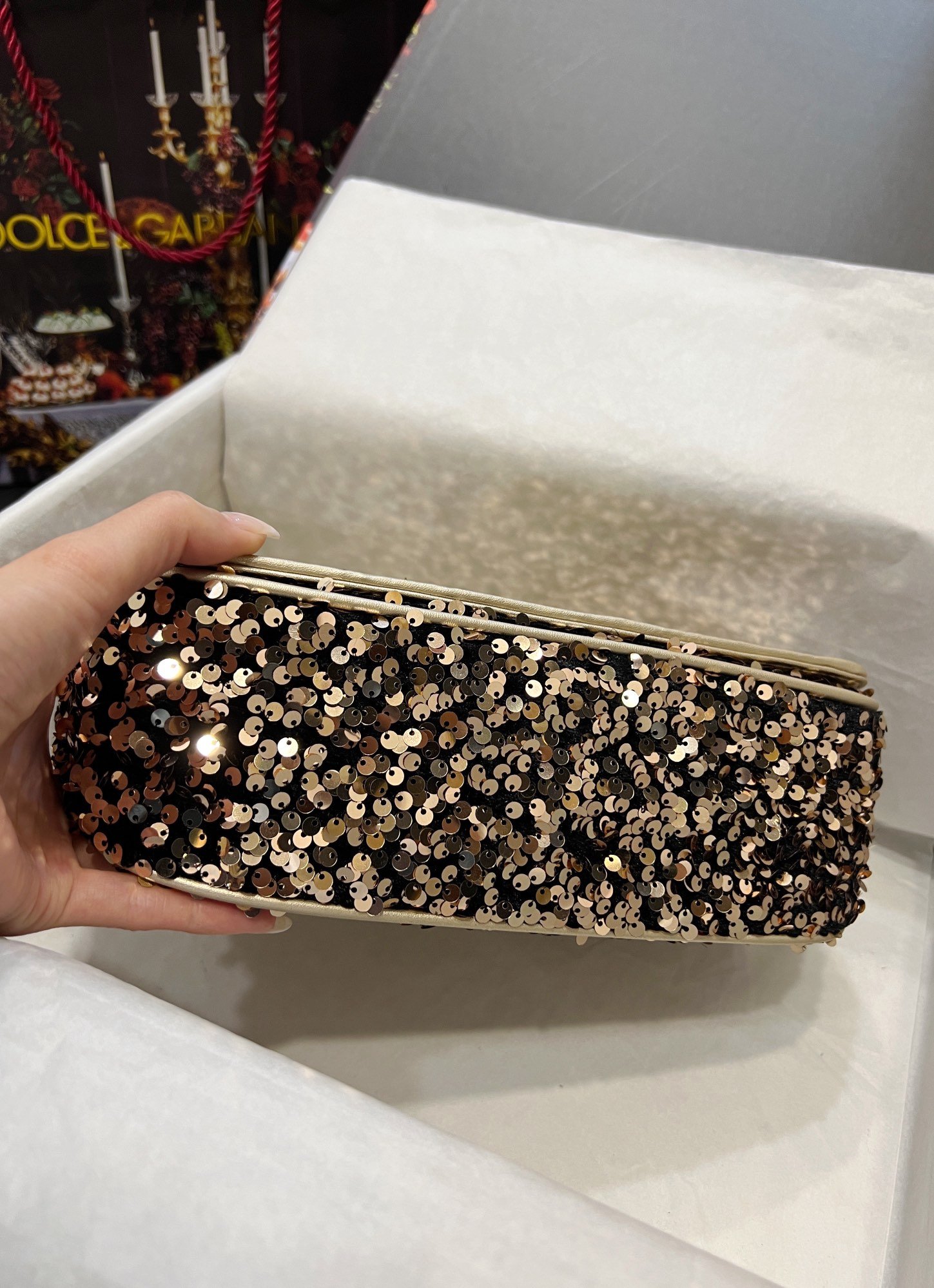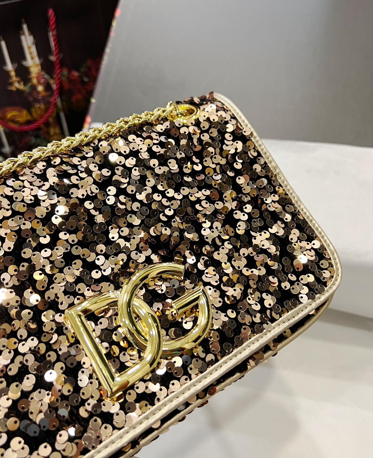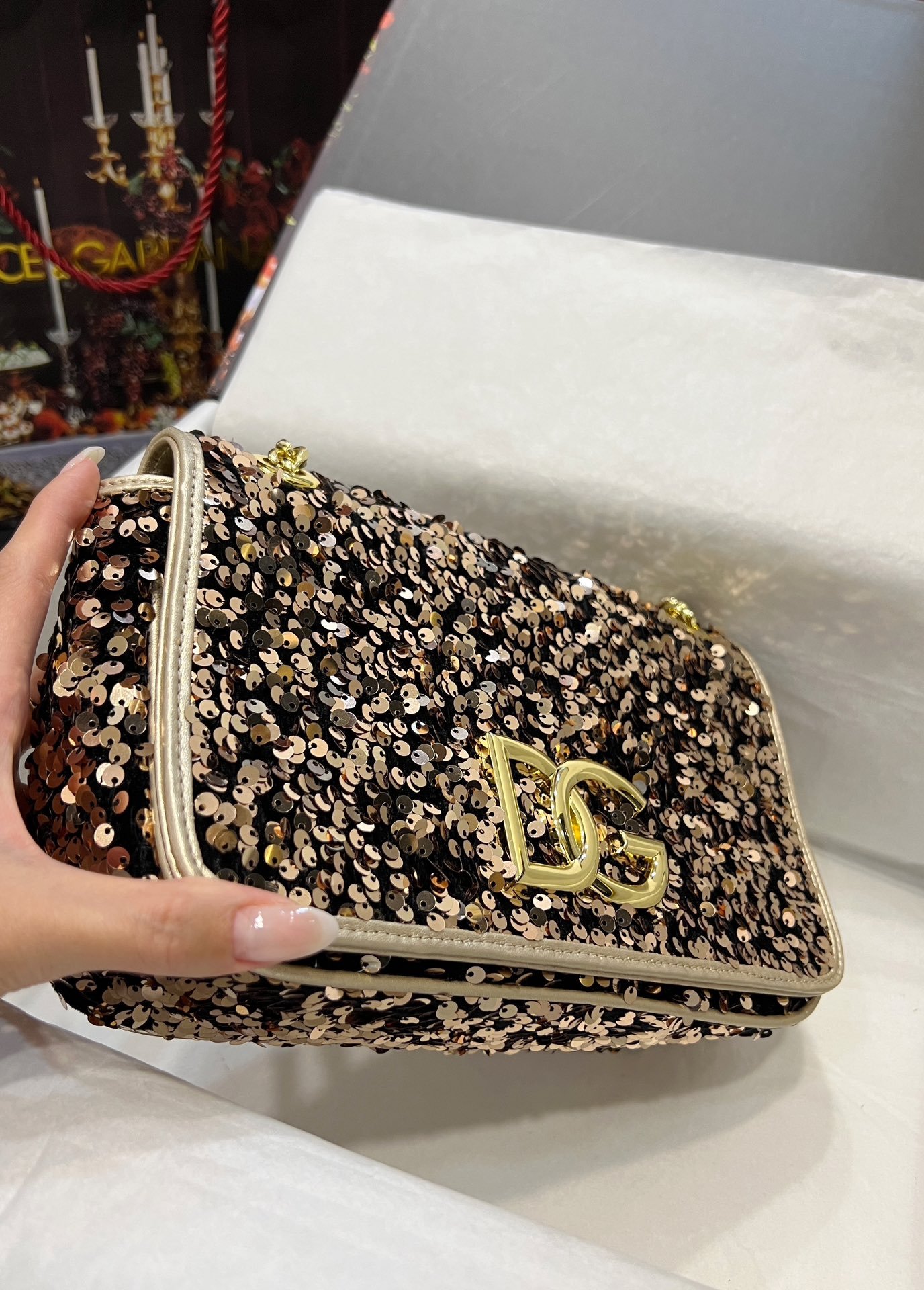 Dolce & Gabbana sequin bag in the fashion industry shows fashion style. Always make people love it. The color is always outstanding. The material selection gives people a strong feeling. The visual impact has become a dynamic style and creativity to the fashion circle. Size: 25×8×15