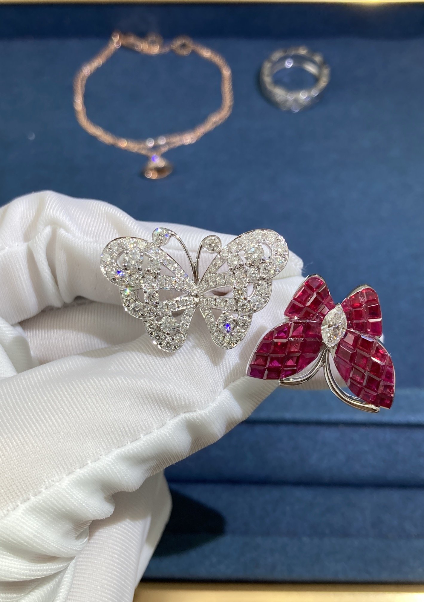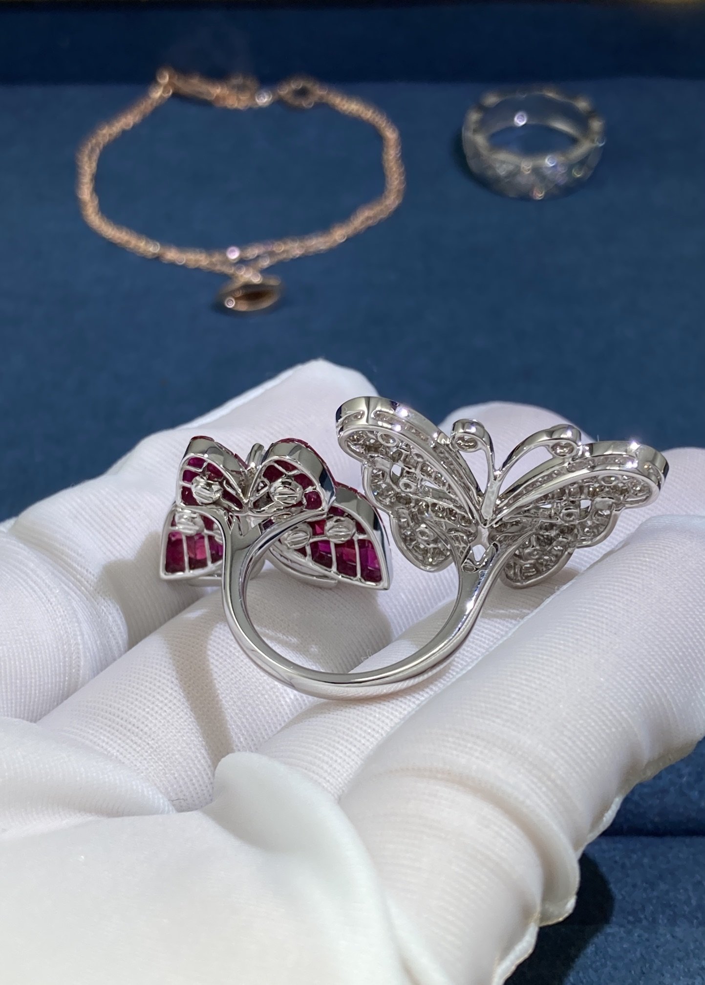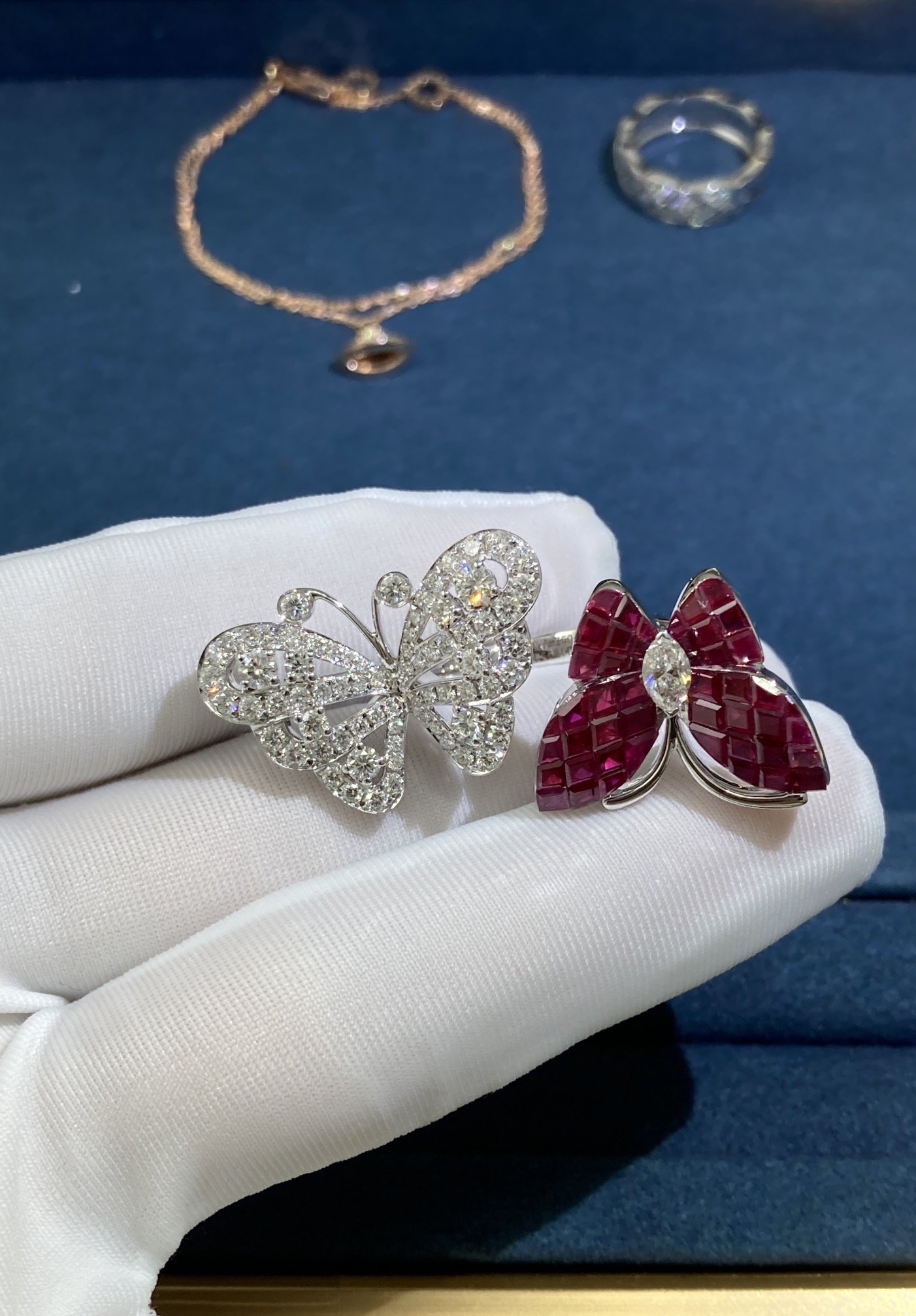 Double Butterfly Full Diamond Ruby Ring, White Gold
