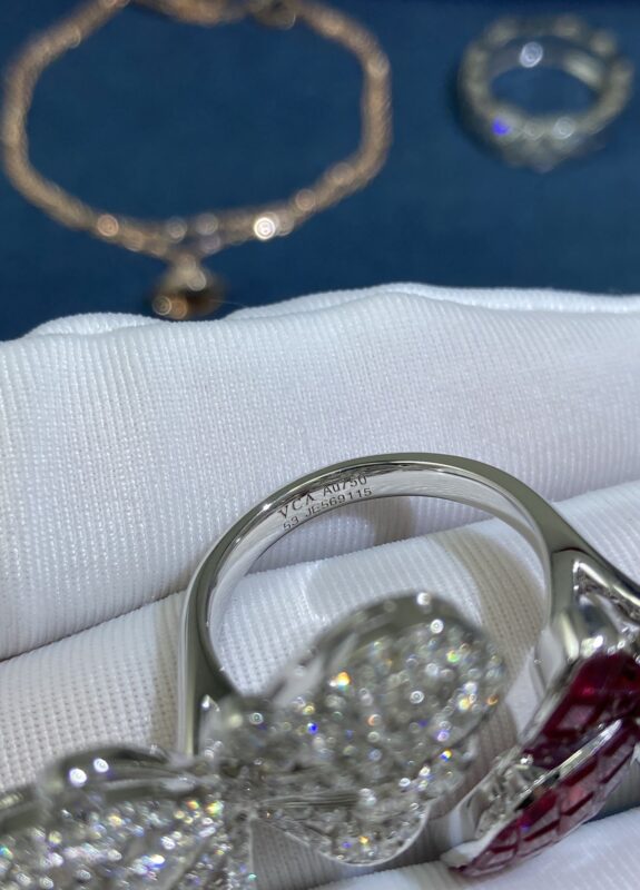The metal used in pieces of jewelry are often a lustrous yellow or white gold, which is expertly polished to a mirror-like finish. The precious stones are carefully selected by our masters and set in a precise manner, showing off their color, clarity, and brilliance to their full potential.