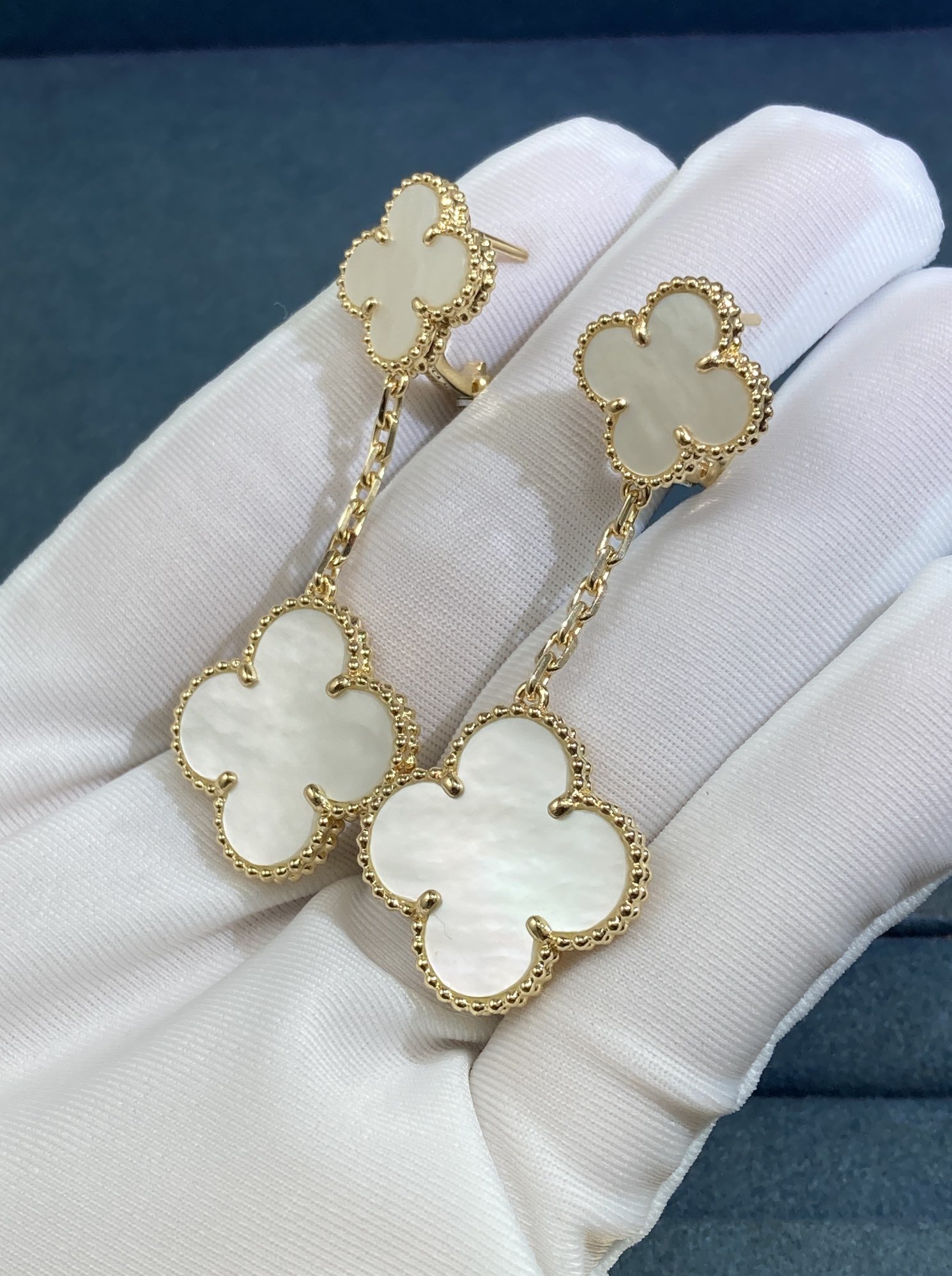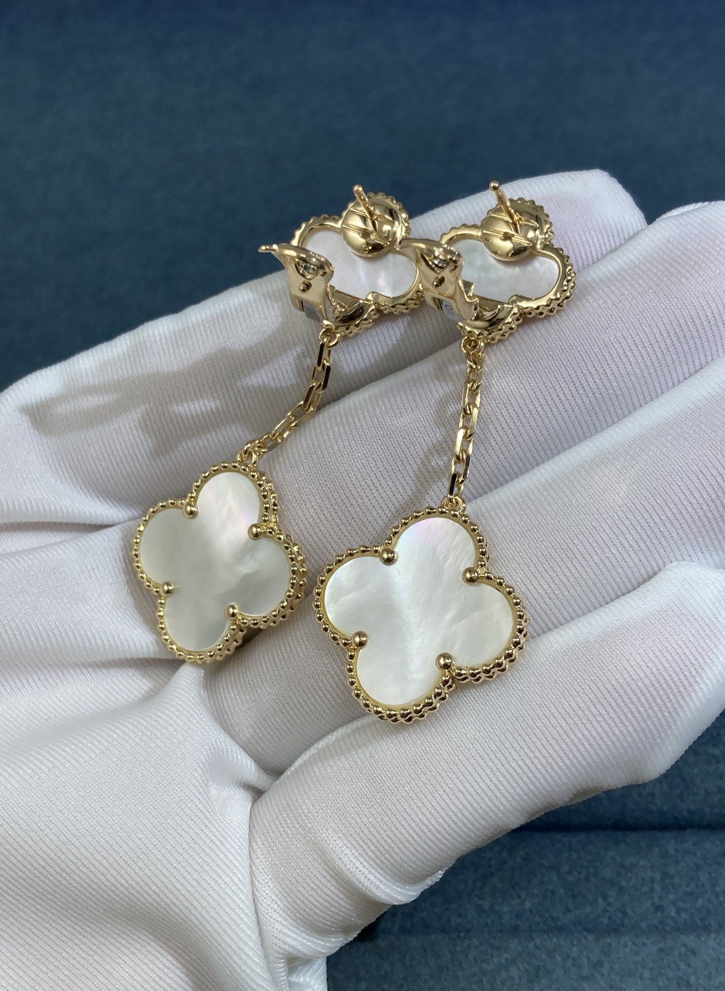 Double-flowered White Shell Four-leaf Clover Ear Rackets, gold color