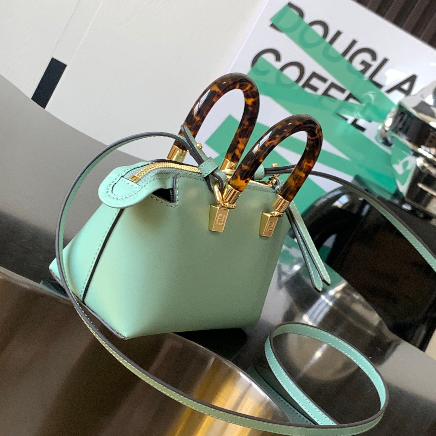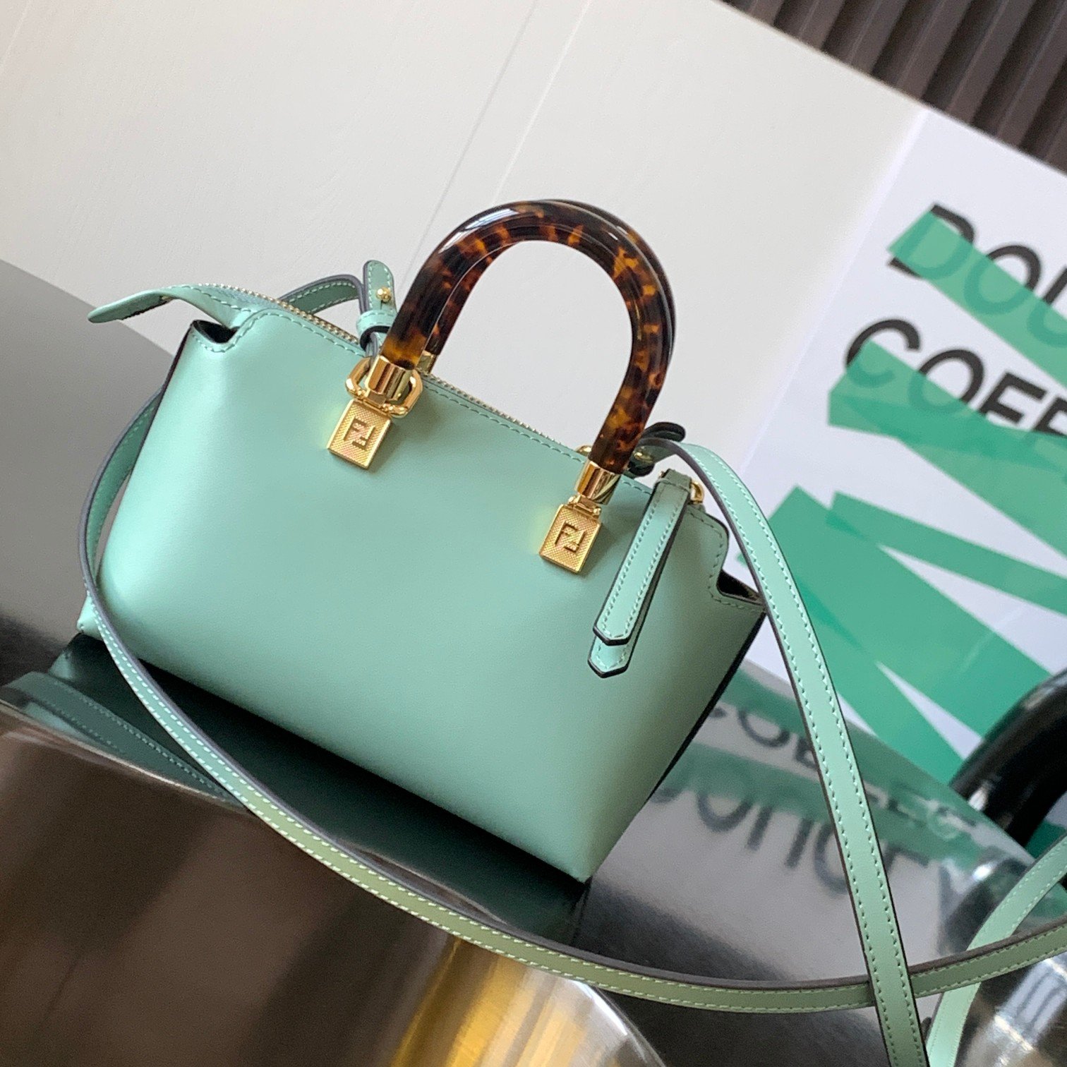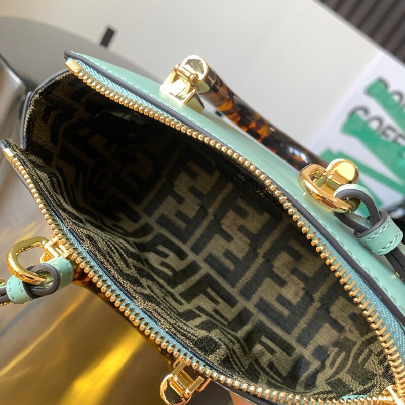 By The Way mini bag Small Boston bag in mint green leather More details Iconic By The Way Boston mini bag in mint green leather with hot-stamped FENDI ROMA lettering and rigid perspex handles in tortoiseshell effect. Zip closure. Interior features fabric lining, pockets and gold-tone hardware. The bag has handles and a detachable shoulder strap so it can be carried by hand, over the shoulder or across the body. Made in Italy Composition: 100% Calfskin Lining: 64% Polyester, 23% Cotton, 13% Polyurethane Depth: 9 Length: 20.5 Height: 12 Mint Green