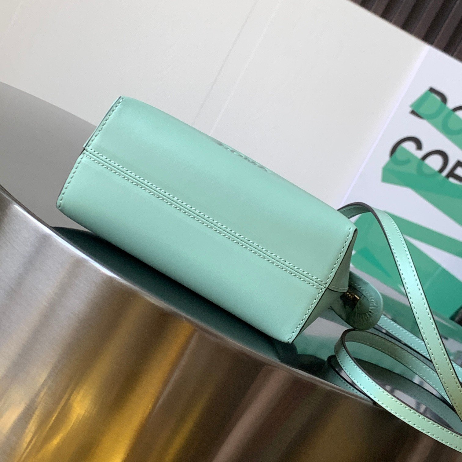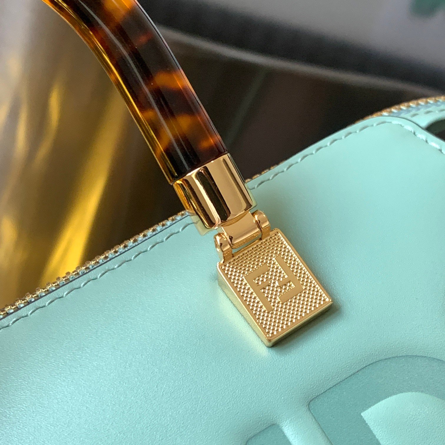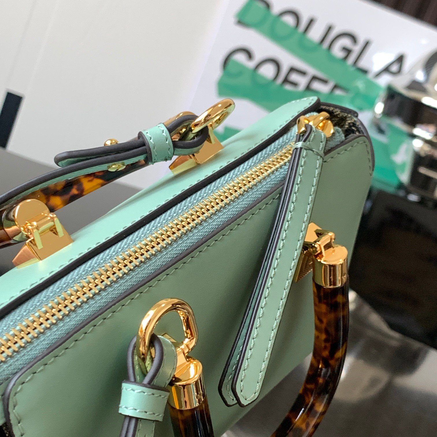 By The Way mini bag Small Boston bag in mint green leather More details Iconic By The Way Boston mini bag in mint green leather with hot-stamped FENDI ROMA lettering and rigid perspex handles in tortoiseshell effect. Zip closure. Interior features fabric lining, pockets and gold-tone hardware. The bag has handles and a detachable shoulder strap so it can be carried by hand, over the shoulder or across the body. Made in Italy Composition: 100% Calfskin Lining: 64% Polyester, 23% Cotton, 13% Polyurethane Depth: 9 Length: 20.5 Height: 12 Mint Green