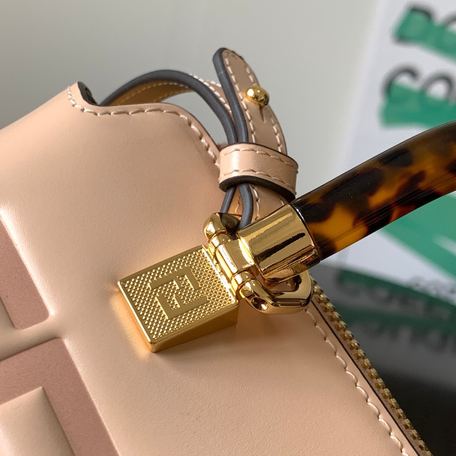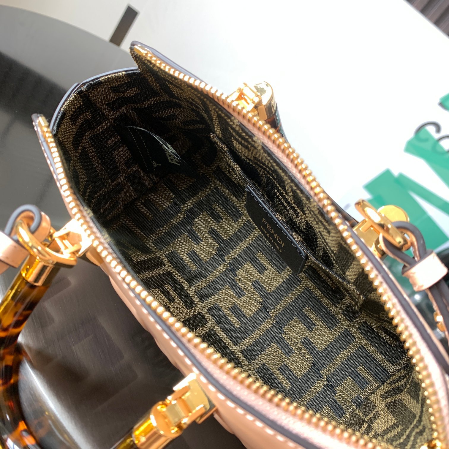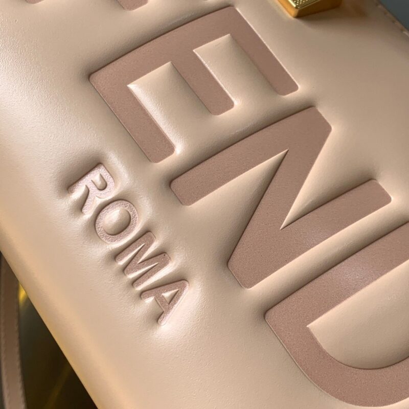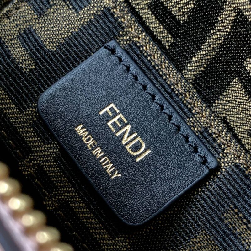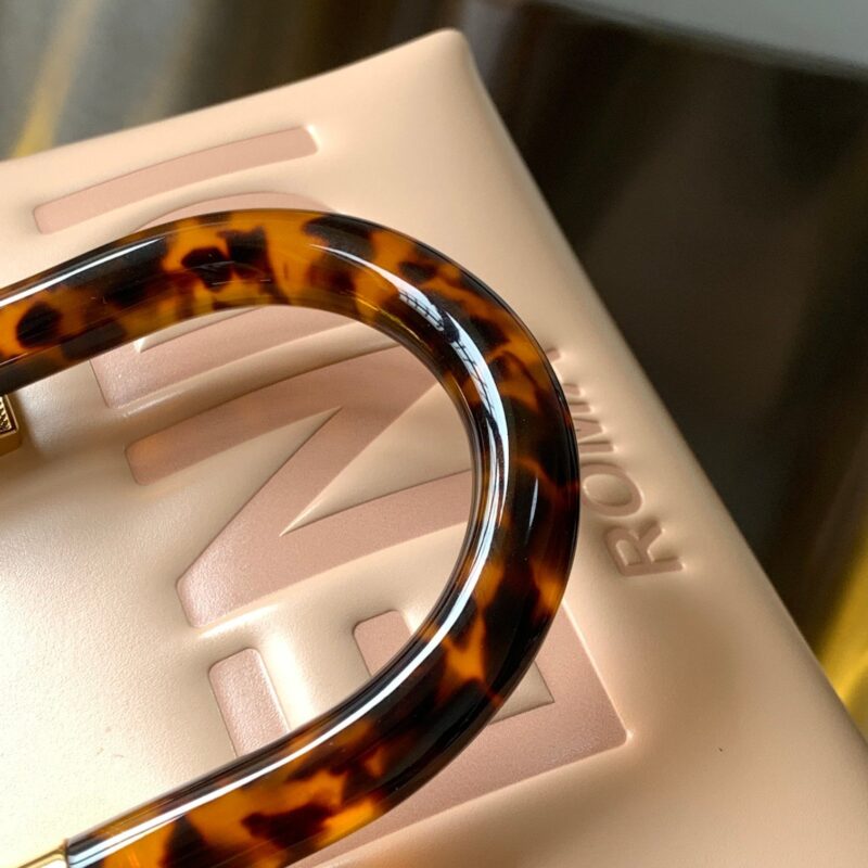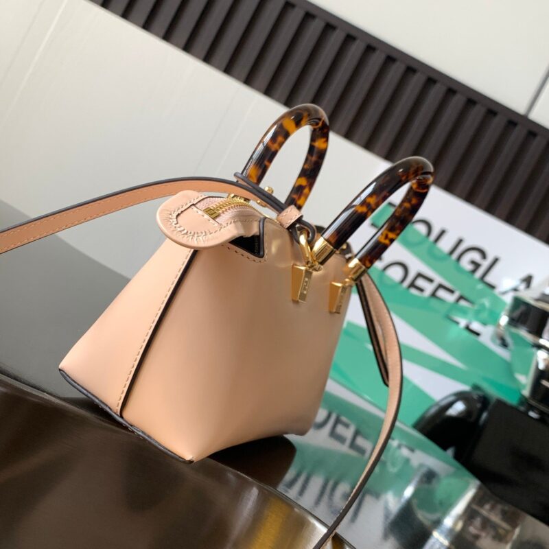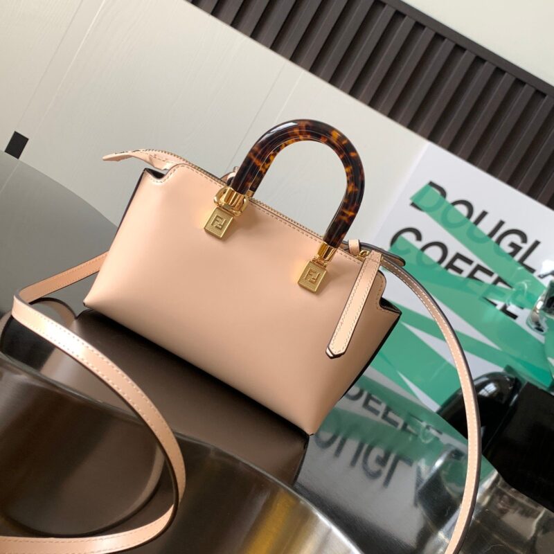 Iconic By The Way Boston mini bag in light pink leather with hot-stamped FENDI ROMA lettering and rigid perspex handles in tortoiseshell effect. Zip closure. Interior features fabric lining, pockets and gold-tone hardware. The bag has handles and a detachable shoulder strap so it can be carried by hand, over the shoulder or across the body. made in Italy