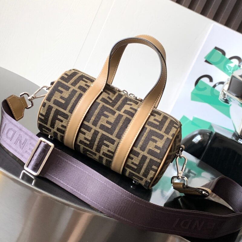 Mini bowling bag in fabric with jacquard FF motif and beige leather intarsia inserts creating the FF motif. Lined interior zip compartment with Fendi O’Lock sliders, interior zip pocket, and silver-finish metal. Equipped with two web handles, it can be carried by hand or by the adjustable and detachable shoulder strap. made in Italy
