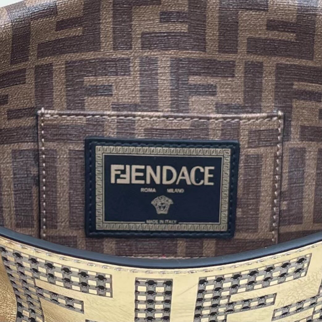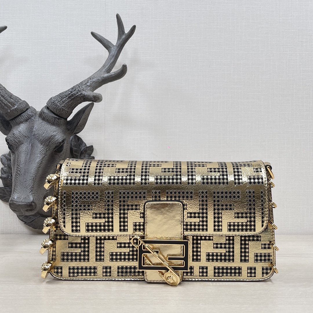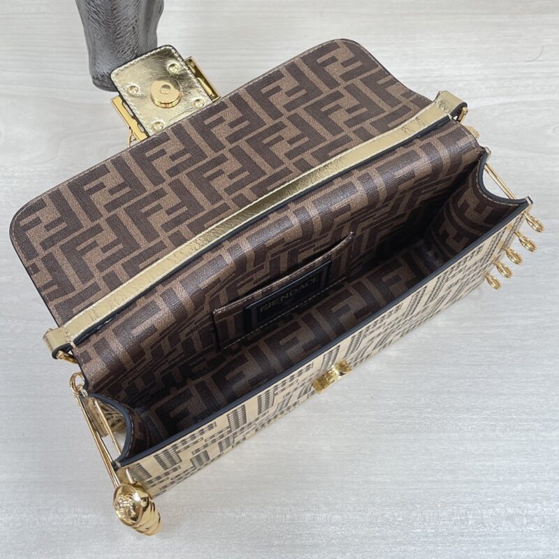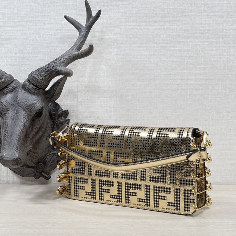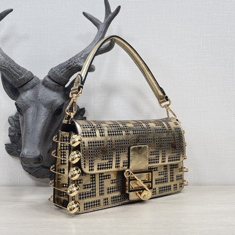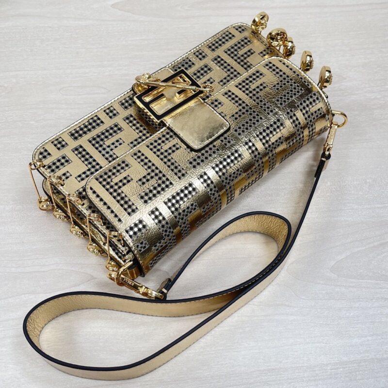 Iconic square Baguette bag from the Versace by Fendi collection. Made of gold-tone leather with gold-tone laser-perforated FF motif in a style similar to Versace metal mesh. Three metal Medusa pins adorn the front flap. FF closure with pins. Magnetic fastening, FF fabric-lined interior compartment with inner pocket and gold-finish hardware. It has long handles and a detachable shoulder strap so it can be carried under the arm or across the body.