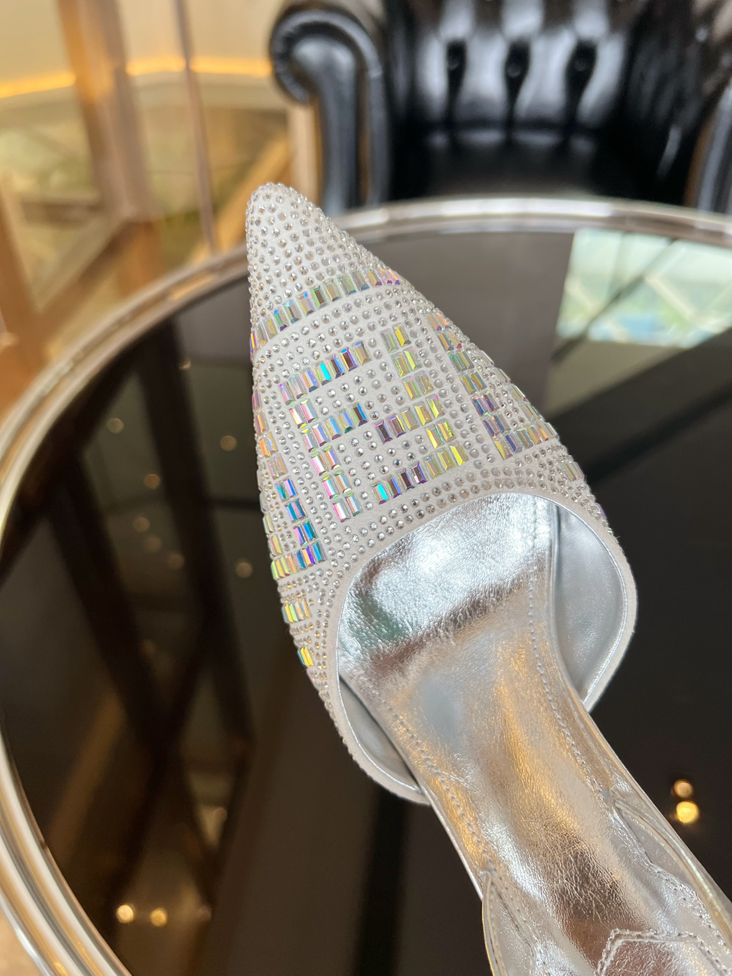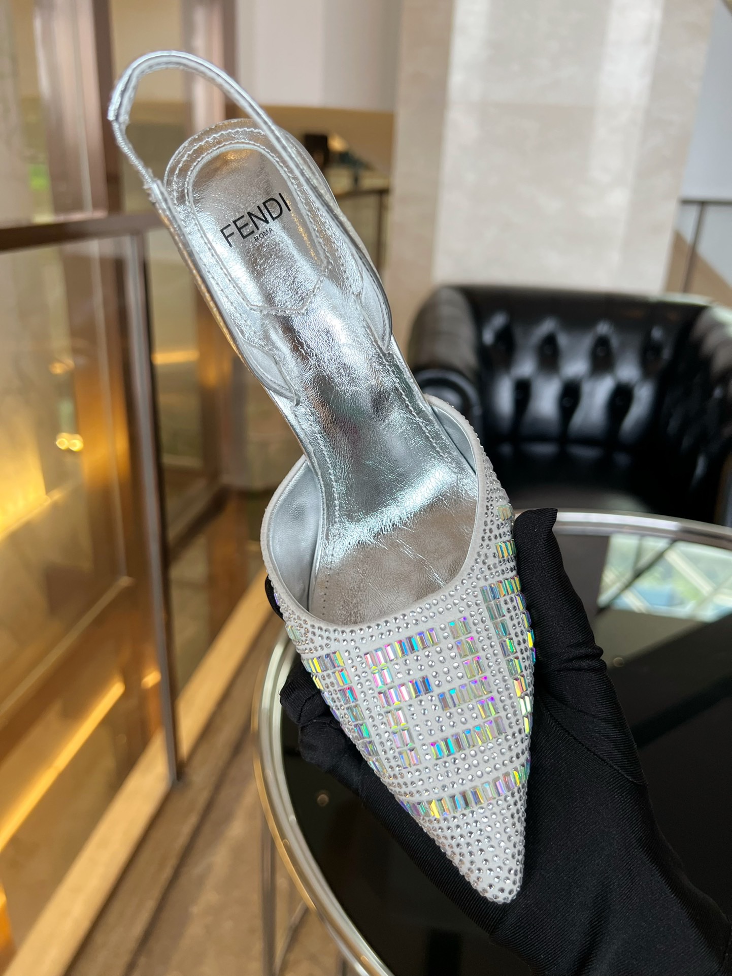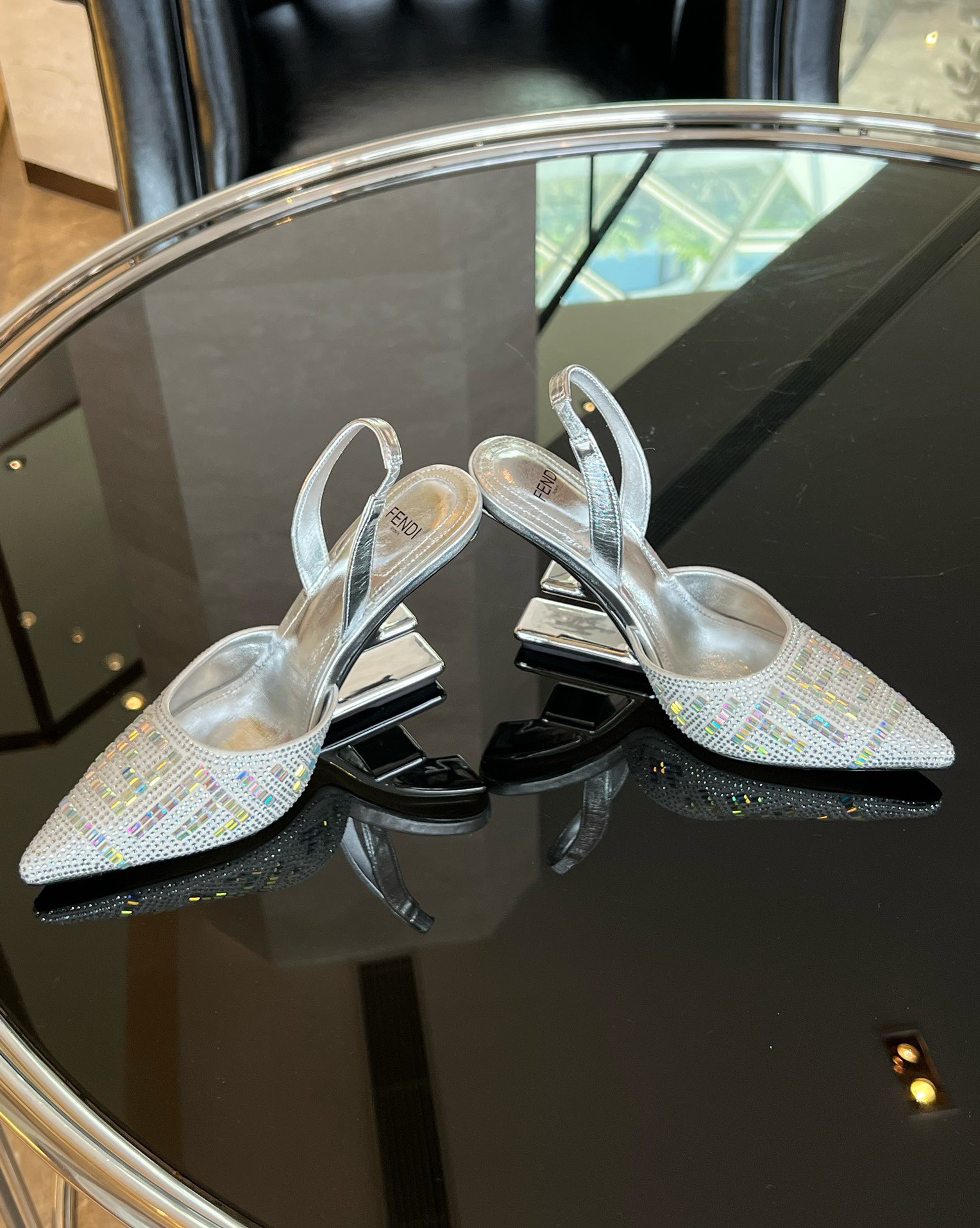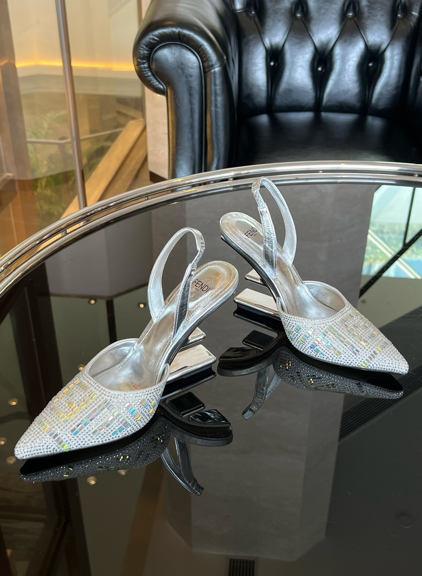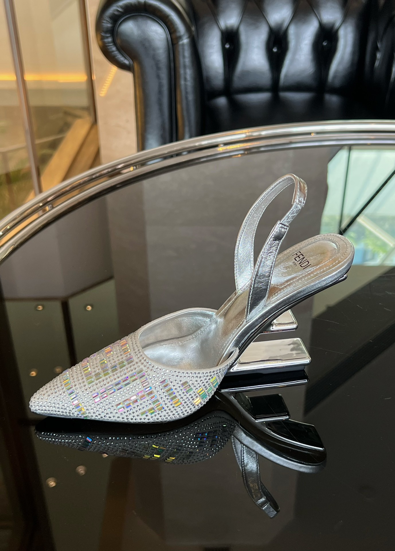 Fendi 2023 New Slingbacks Sandals by Marc Jacobs limited edition collection, this model is embroidered with silver rhinestones all over in cowhide. Diagonal F-shaped sculpted heel in silver-tone metal. Handmade in Italy!