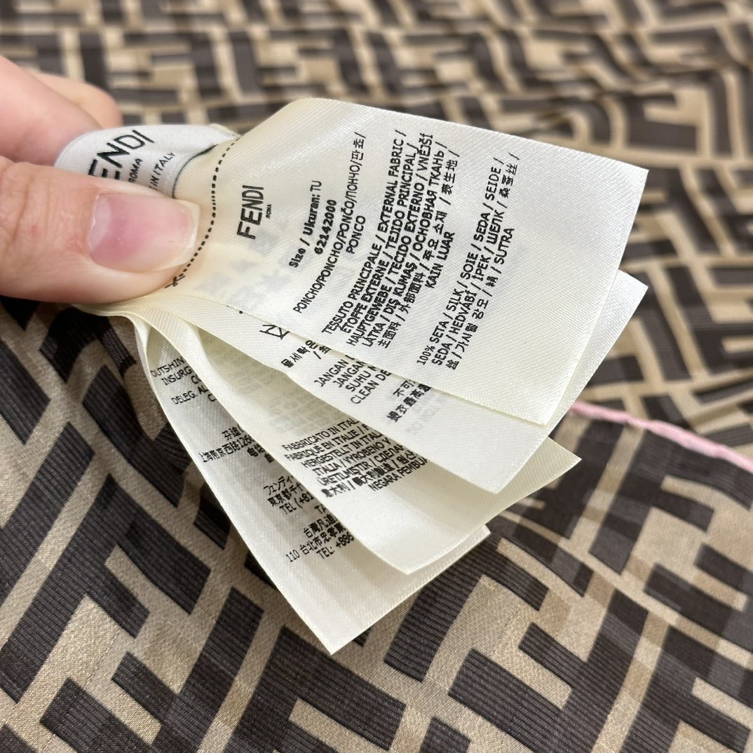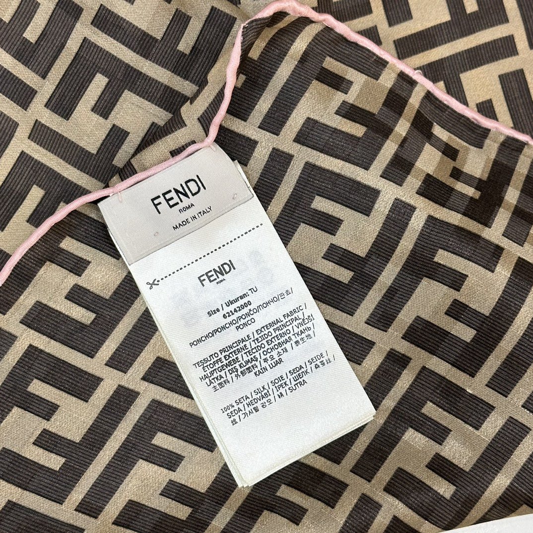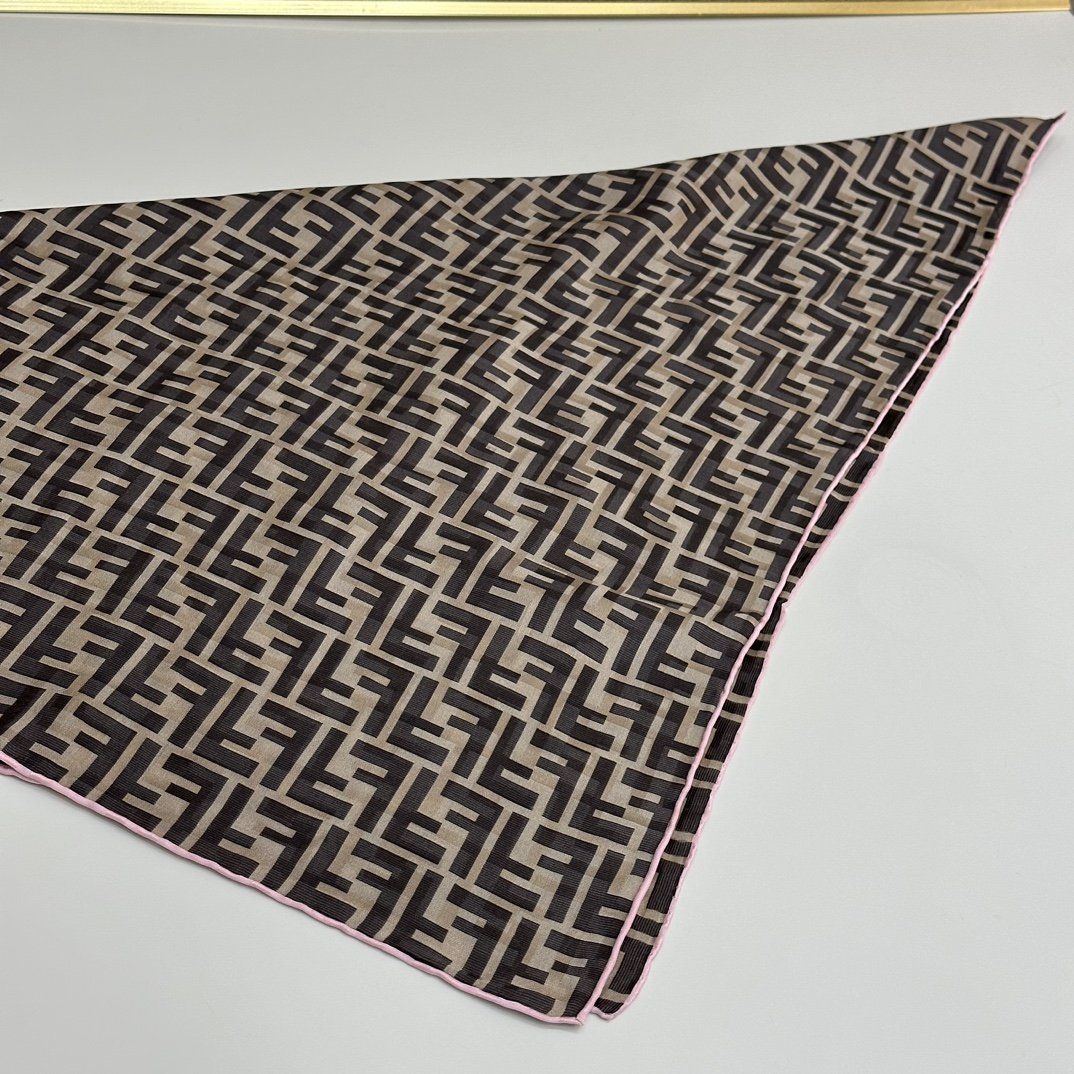 Square scarf in silk twill with all-over FF print in brown and black. Contrasting pink edges.