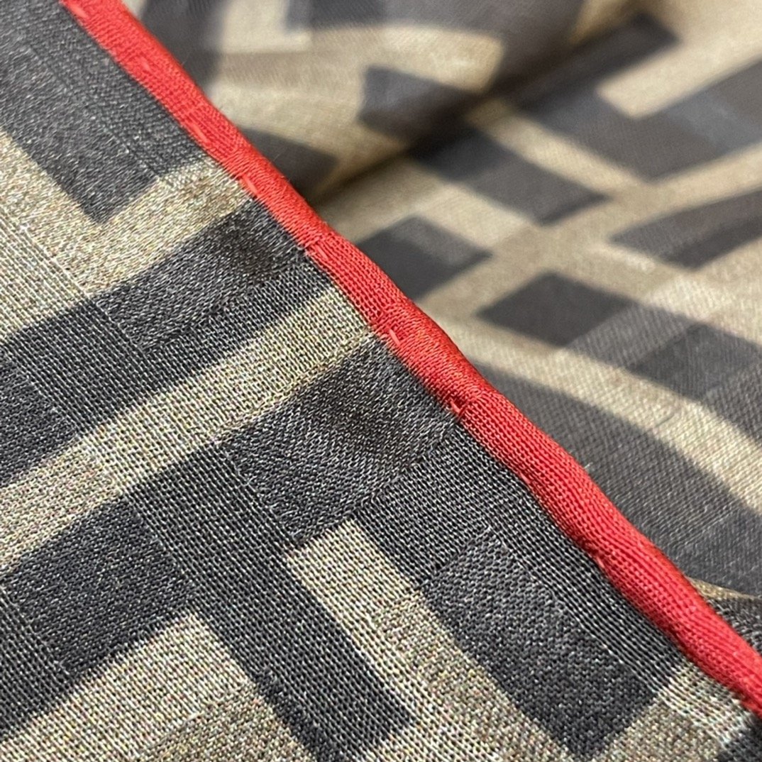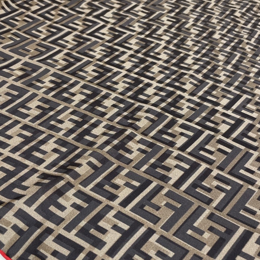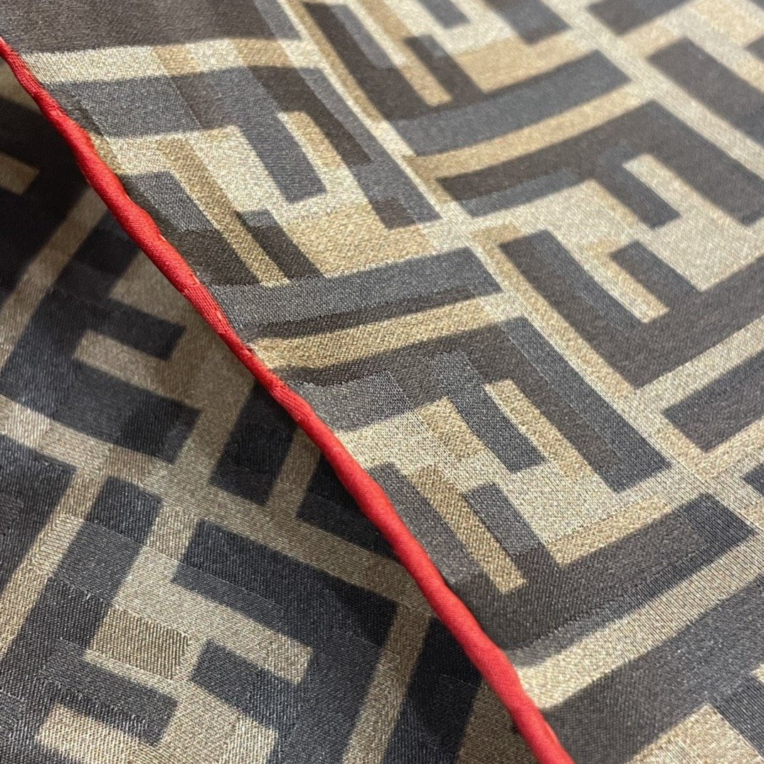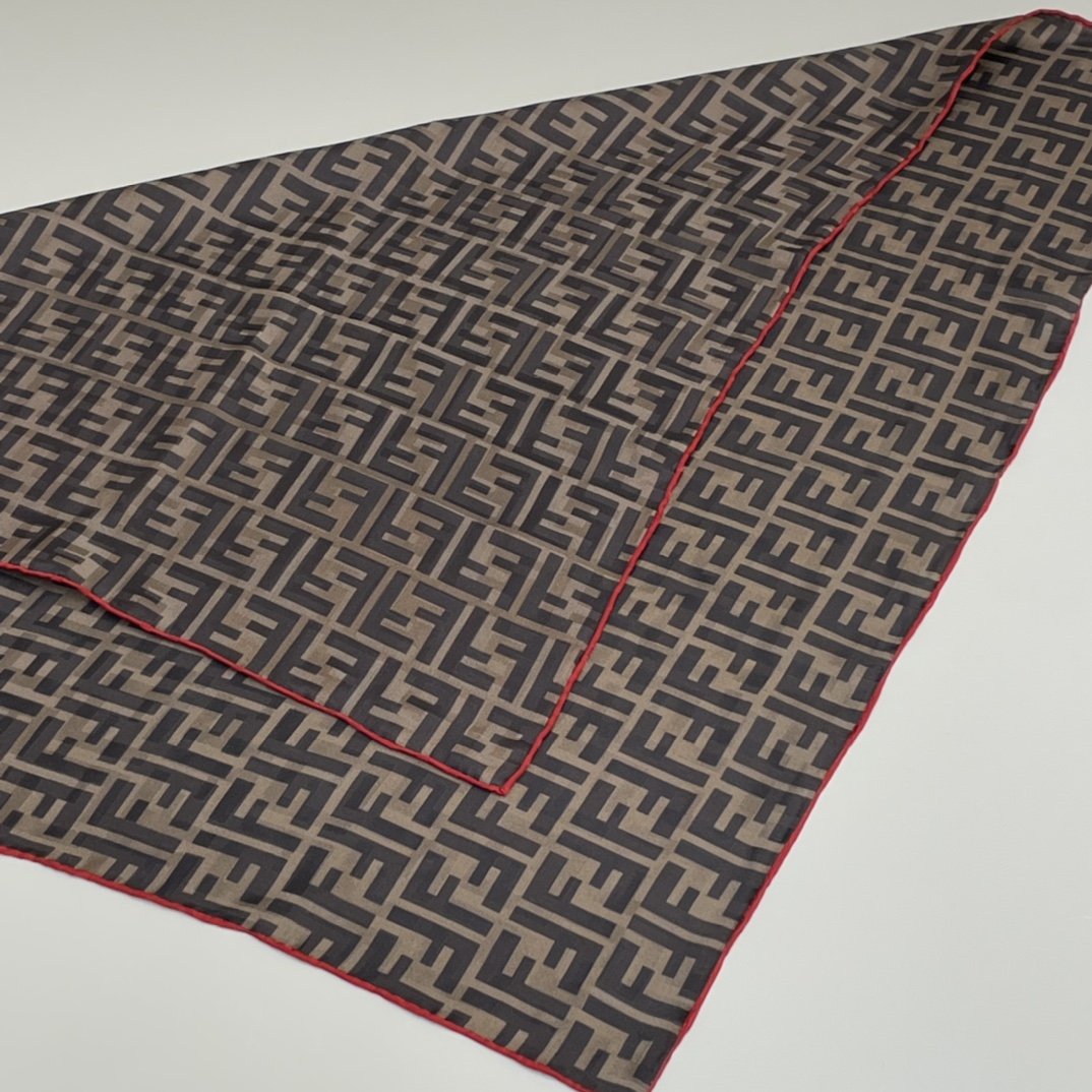 Square scarf in silk twill with all-over FF print in brown and black. Contrasting red edges.