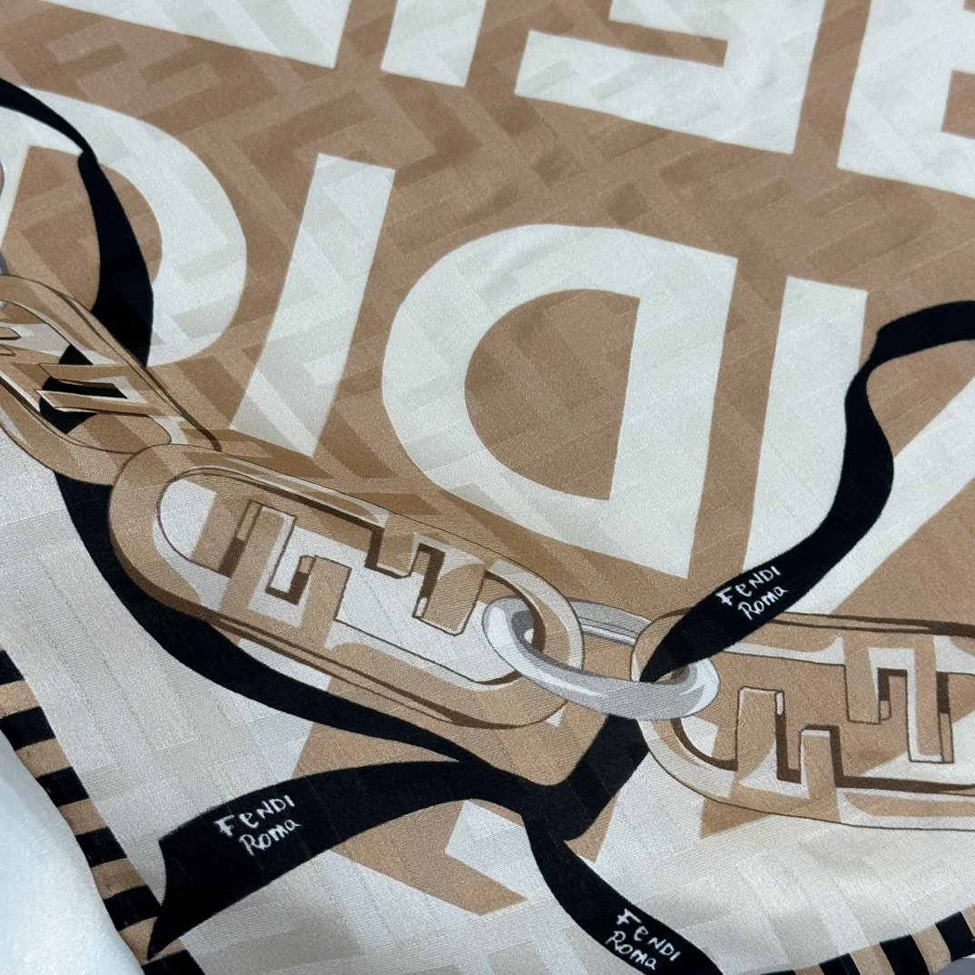 Scarf in beige and black organic mulberry silk. Bold graphics are combined with iconic elements such as the Fendi O’Lock chain and black signature ribbon. F home Mirror as the background to create a 3D effect. Pequin tone-on-tone frame.