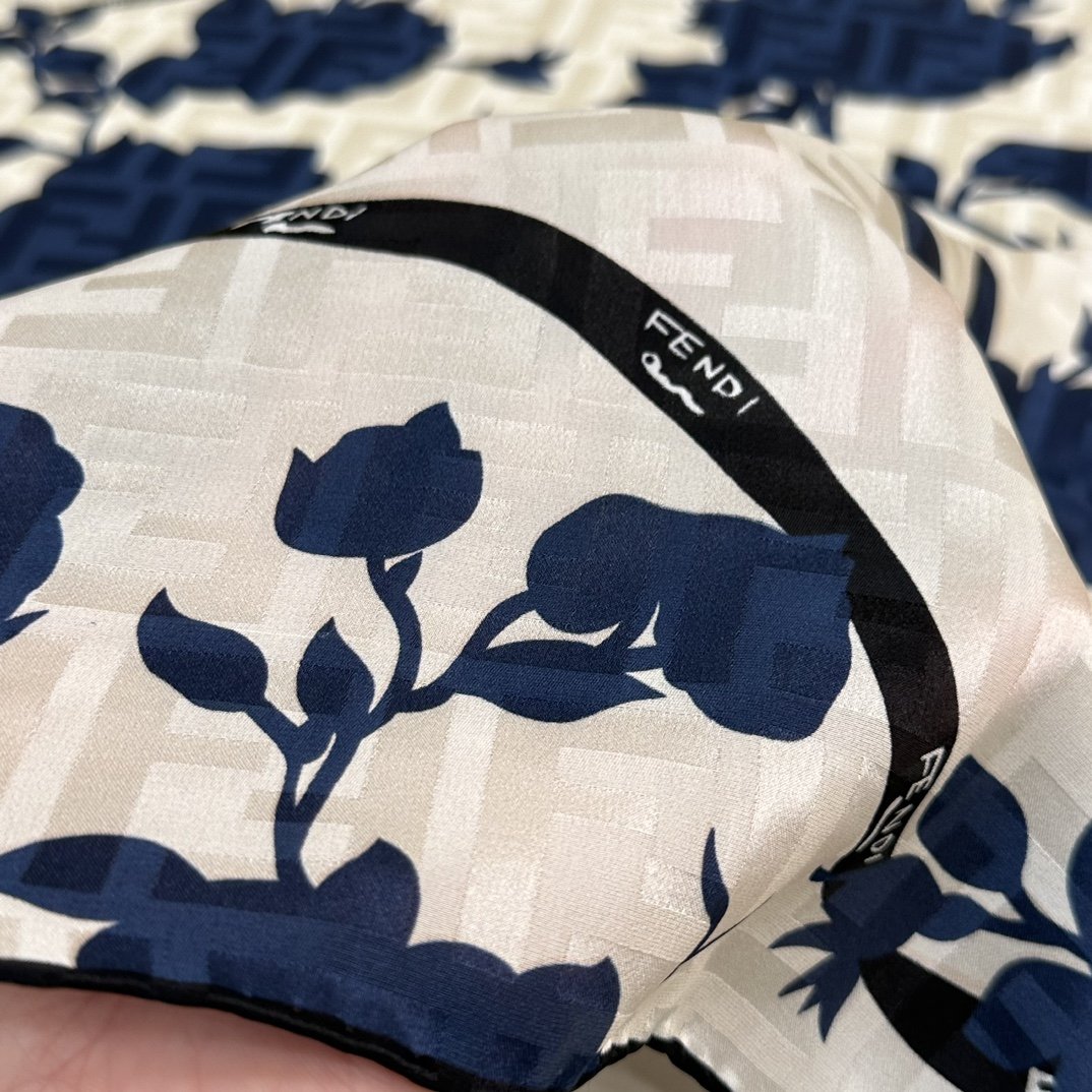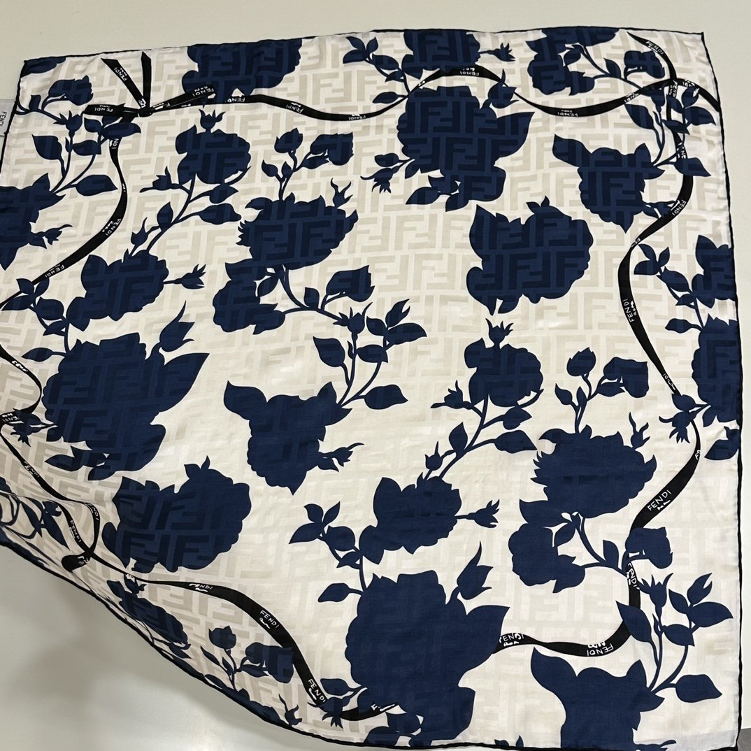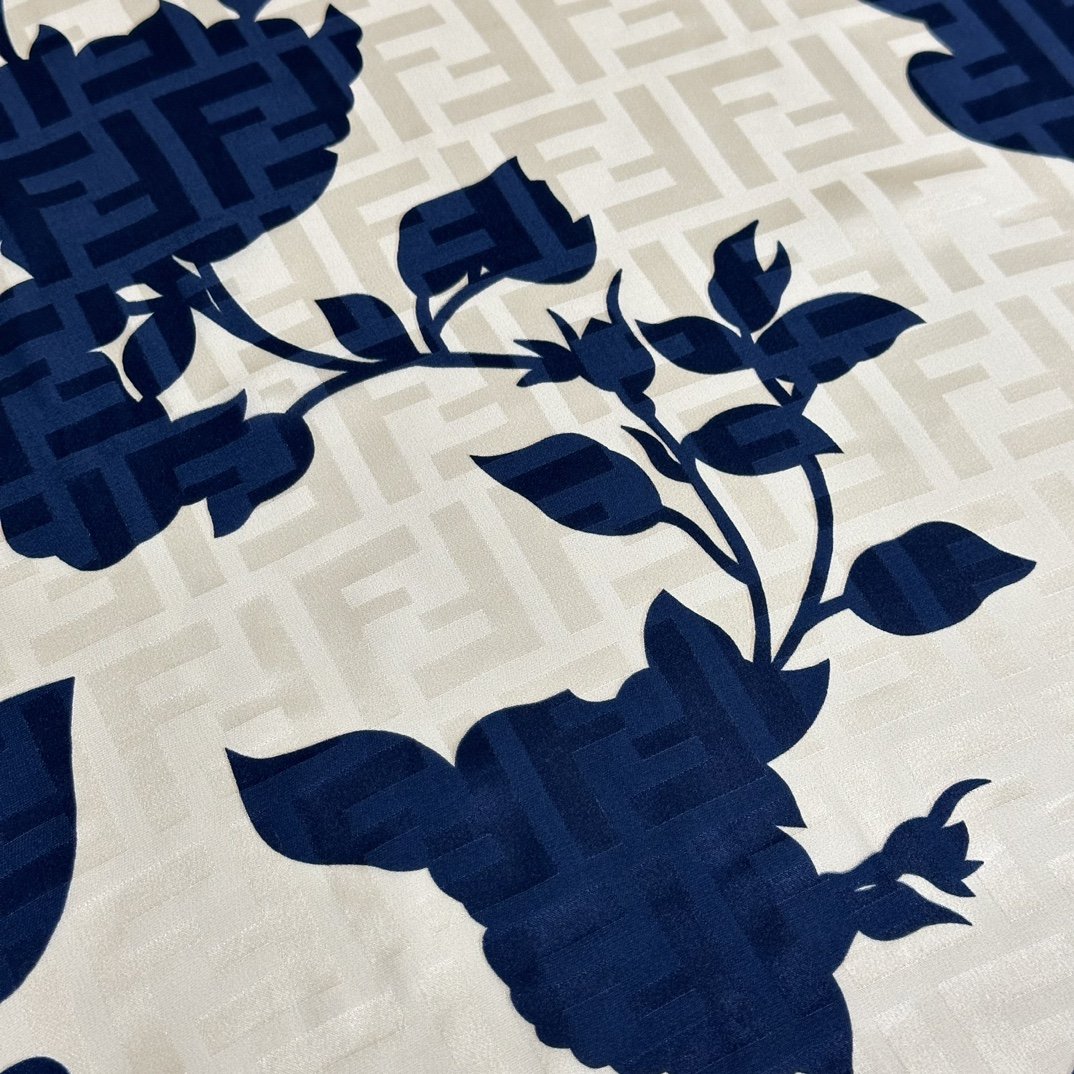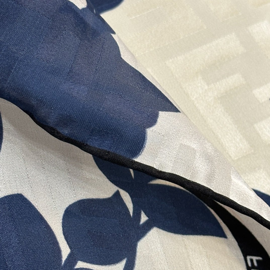 Scarf in organic mulberry silk with F family motif printed all over in beige and blue. Black ribbons outline the graphic border. The jacquard ends are woven with the F House logo in tone-on-tone. Hand-piped.