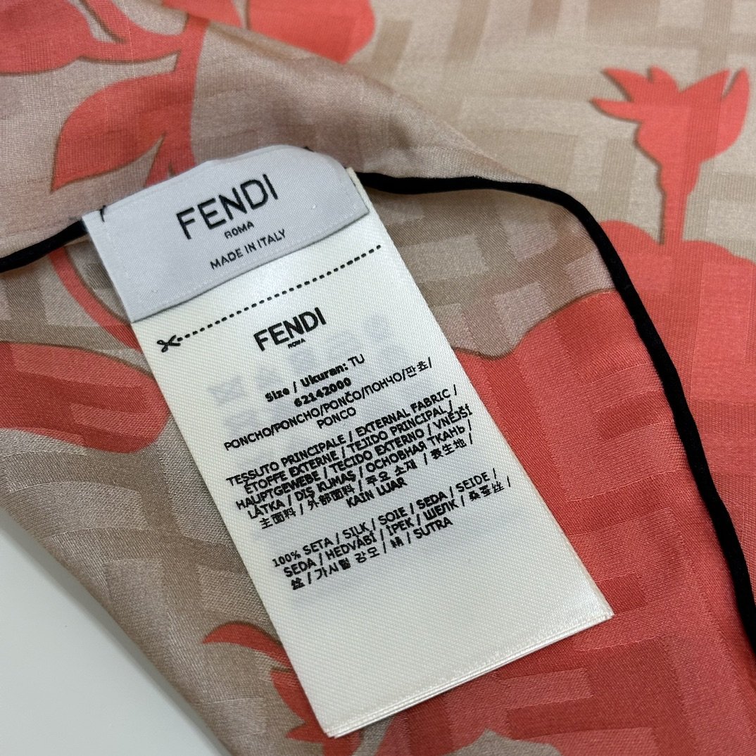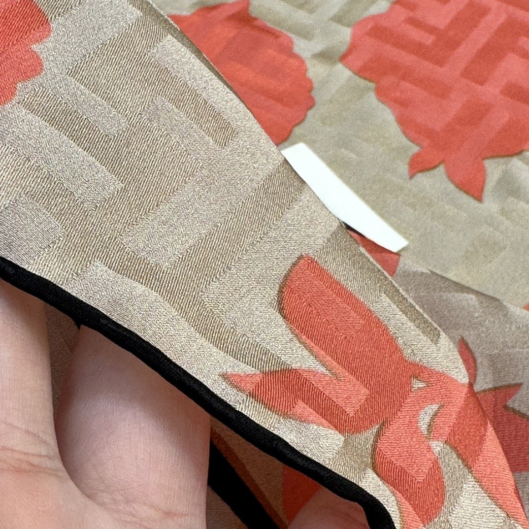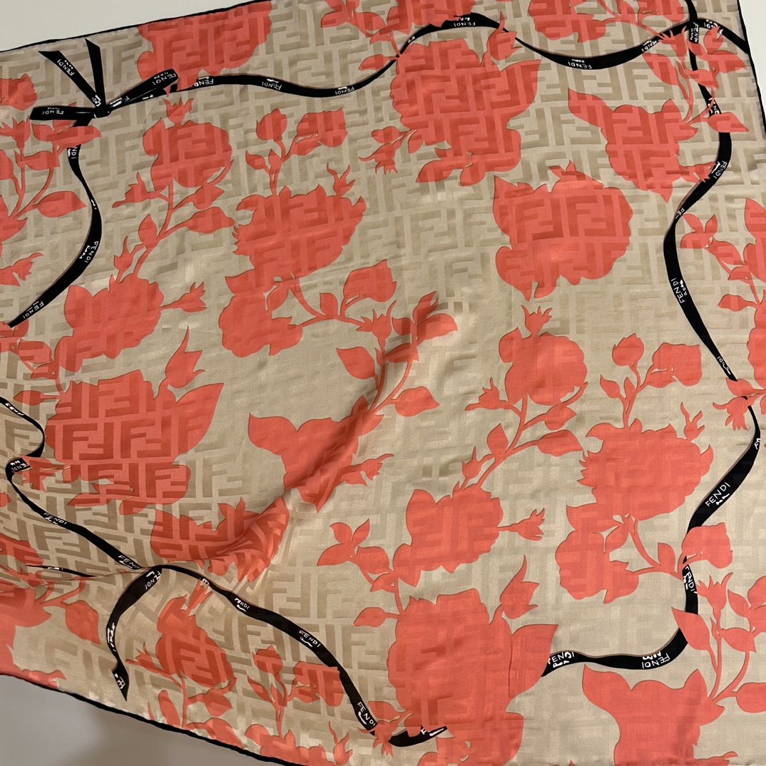 Scarf in organic mulberry silk with an allover F family graphic print in beige and pink. Black ribbons outline the graphic border. The jacquard ends are woven with the F House logo in tone-on-tone. Hand-piped.
