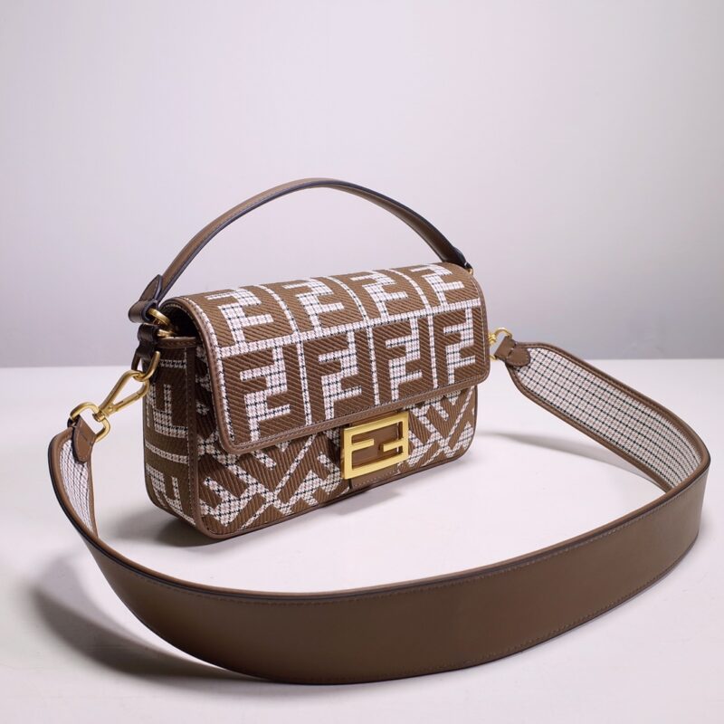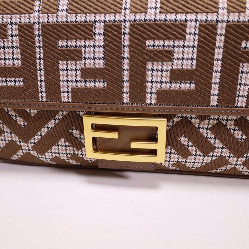 Fendi Iconic Baguette medium bag in brown houndstooth wool with FF embroidery pattern. Featuring tonal leather details and an FF buckle. With front flap, magnetic buckle, lined interior compartment, zippered pocket, and silver-tone hardware. Handbag with detachable handle and shoulder strap for hand, shoulder or cross-body wear. Size: 27*6*15.8600