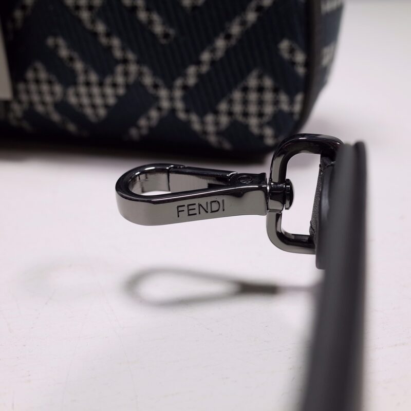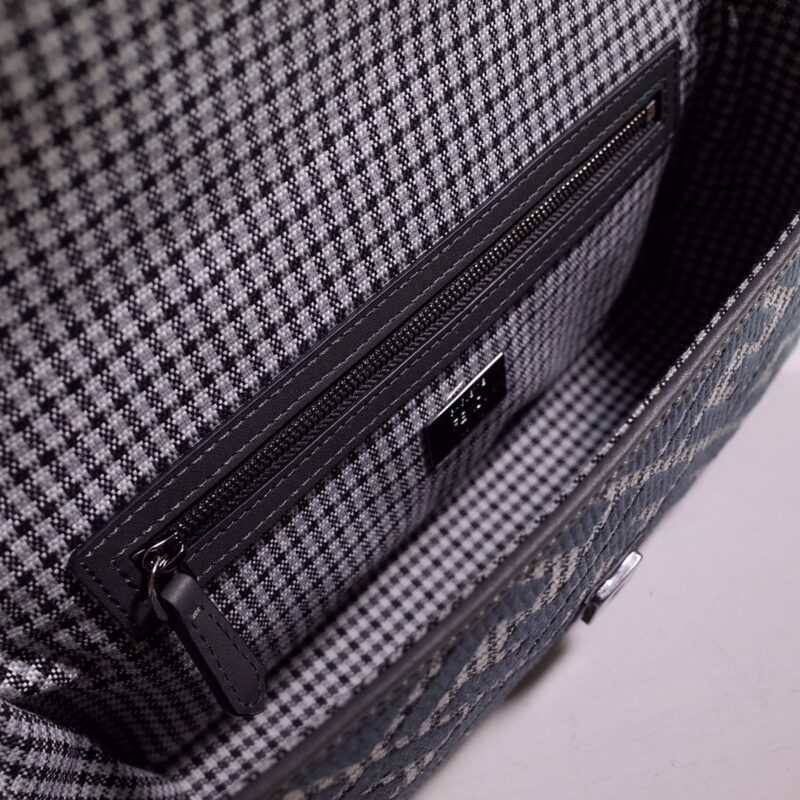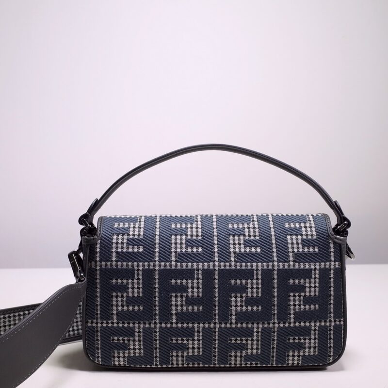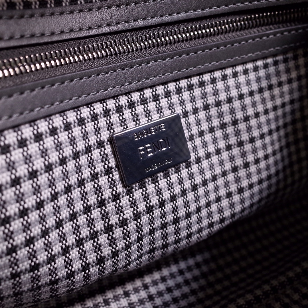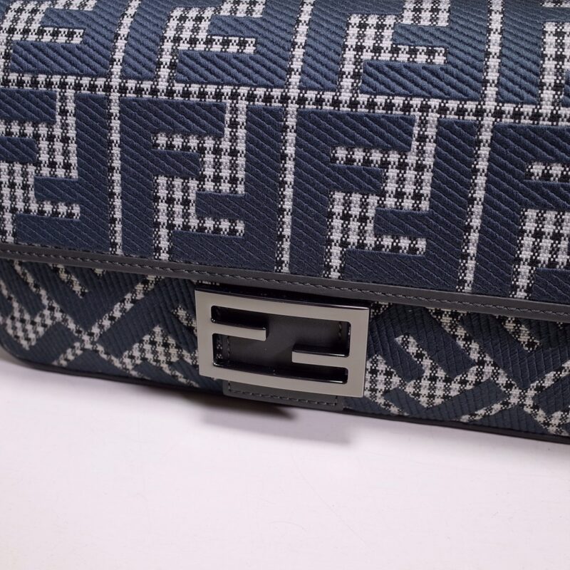 Fendi Iconic Baguette medium bag in grey houndstooth wool with FF embroidery pattern. Featuring tonal leather details and an FF buckle. With front flap, magnetic buckle, lined interior compartment, zip pocket, and gold-tone hardware. Handbag with detachable handle and shoulder strap for hand, shoulder or cross-body wear. Size: 27*6*15.8600