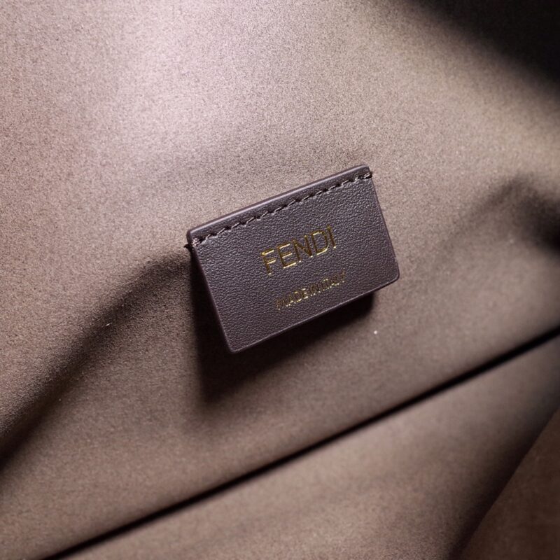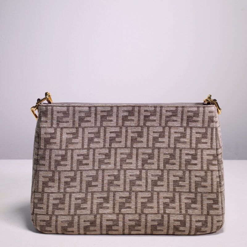Fendi chenille shoulder bag with grey FF brocade pattern and metal Fendi Roma lettering Sample. Zip closure. Suede-lined interior with button pocket and two flat pockets. Available in Gold and Silver finish metal attachments. Equipped with removable double handles: one short leather Handle, another tortoiseshell-effect plexiglass with metal oversized O’Lock logo. Chain handle for hand or shoulder carry. Size: 36*14*23.5. Style number 8038