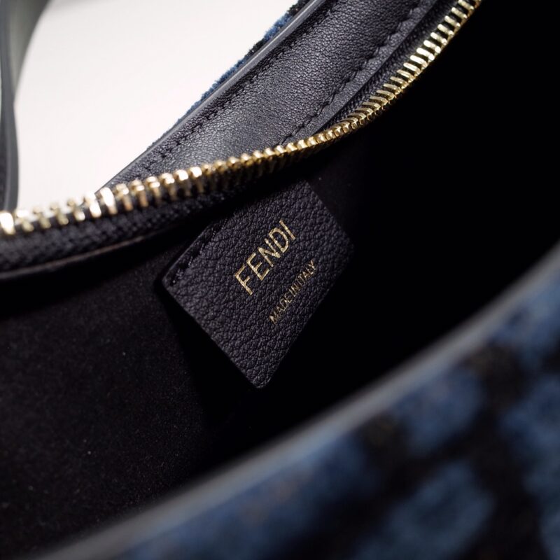 Fendi chenille clutch with dark blue FF brocade pattern, zipper closure, gold accents It belongs to Fendi Roma. Suede fabric lined interior with gold and silver mélange finish is an accessory. Equipped with double handles: one detachable leather handle and the other with a large metal handle. Tortoiseshell-effect plexiglass chain-decorated handle with O’Lock logo for hand or armpit.Size: 32*5*