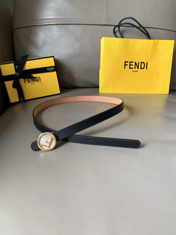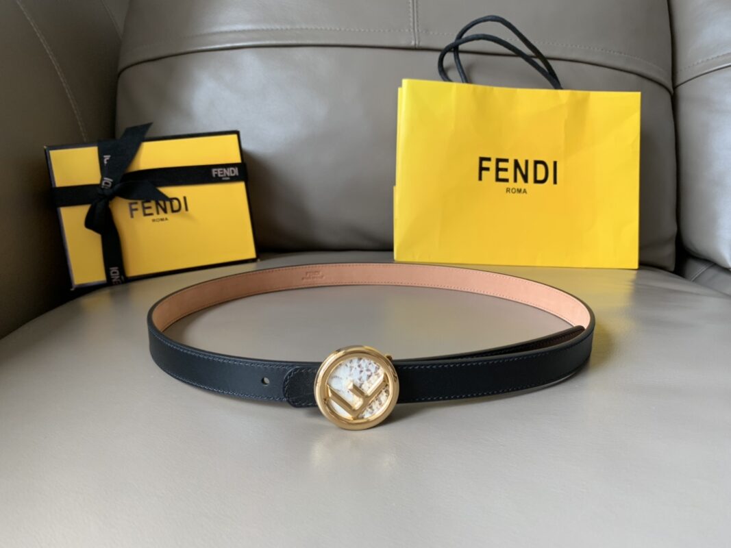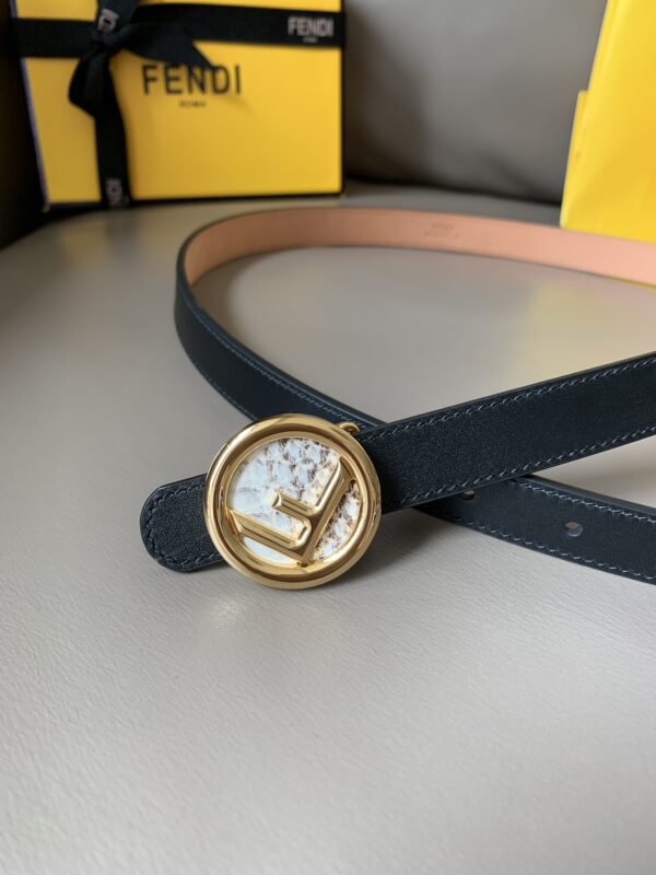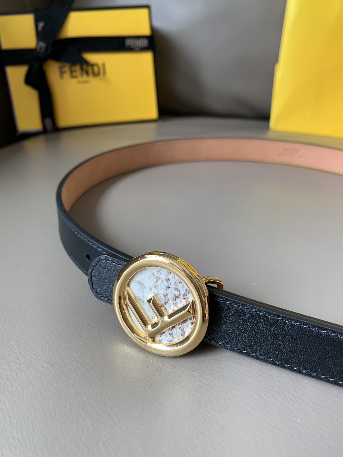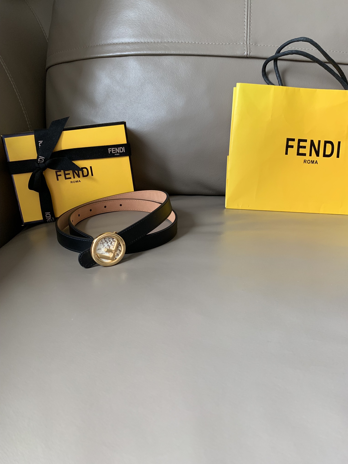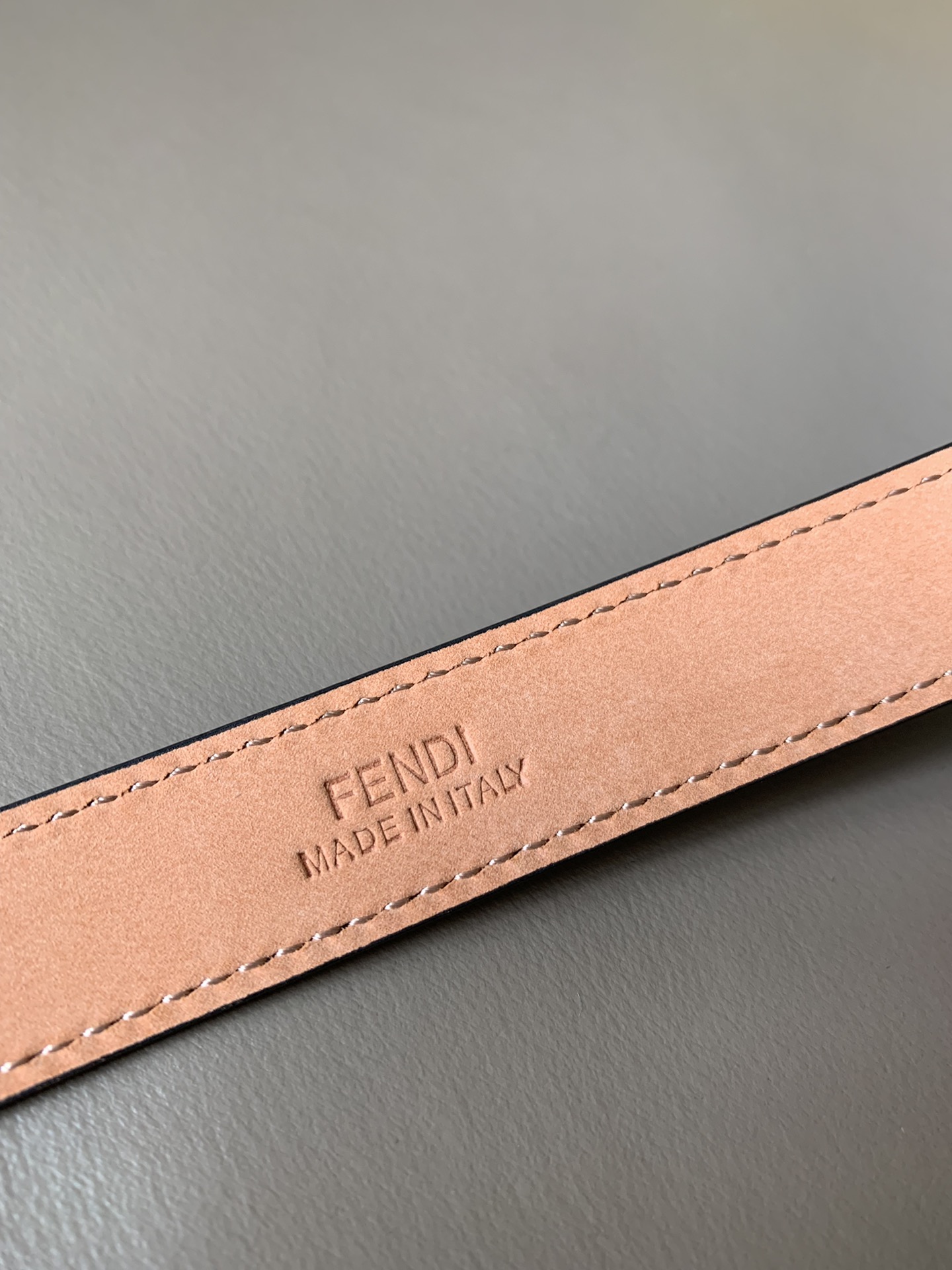 Fendi counters the same high-end casual thin belt for women. Soft top layer calfskin material lined with tree cream nubuck leather. Width 2cm, with a new Fendi logo shape buckle cufflink closure, gold metal hardware buckle decorated with Rock-colored brocade snake detail. 24087898