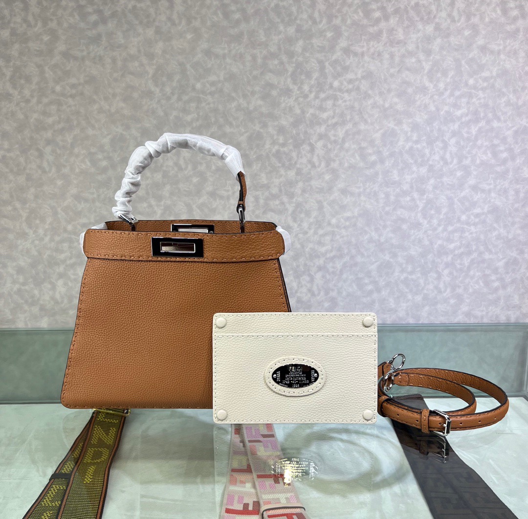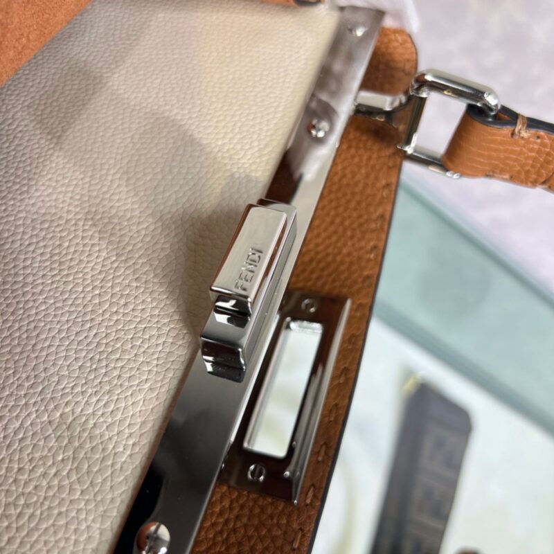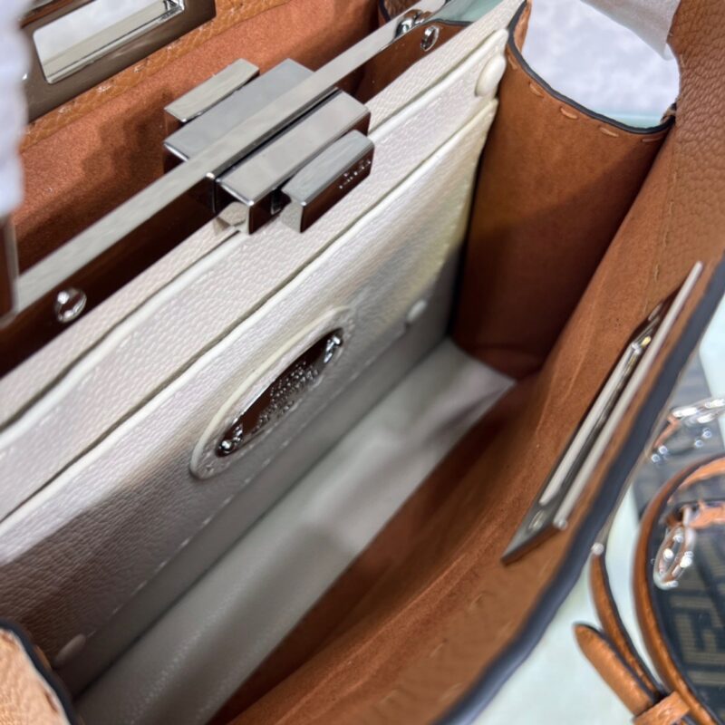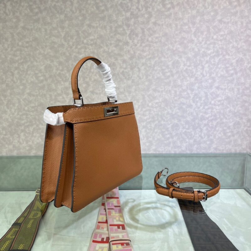 Medium size 33cm Iconic Peekaboo ISeeU medium bag in brown full-grain leather with hand-stitched stitching and classic twist-lock sides. Lined in tonal full-grain leather, the two compartments are separated by a hard divider with removable, customizable pockets and silver-tone hardware. Complete with handles and an adjustable and detachable shoulder strap, it can be carried by hand or over the shoulder. litchi brown Size 33*25.5*13cm