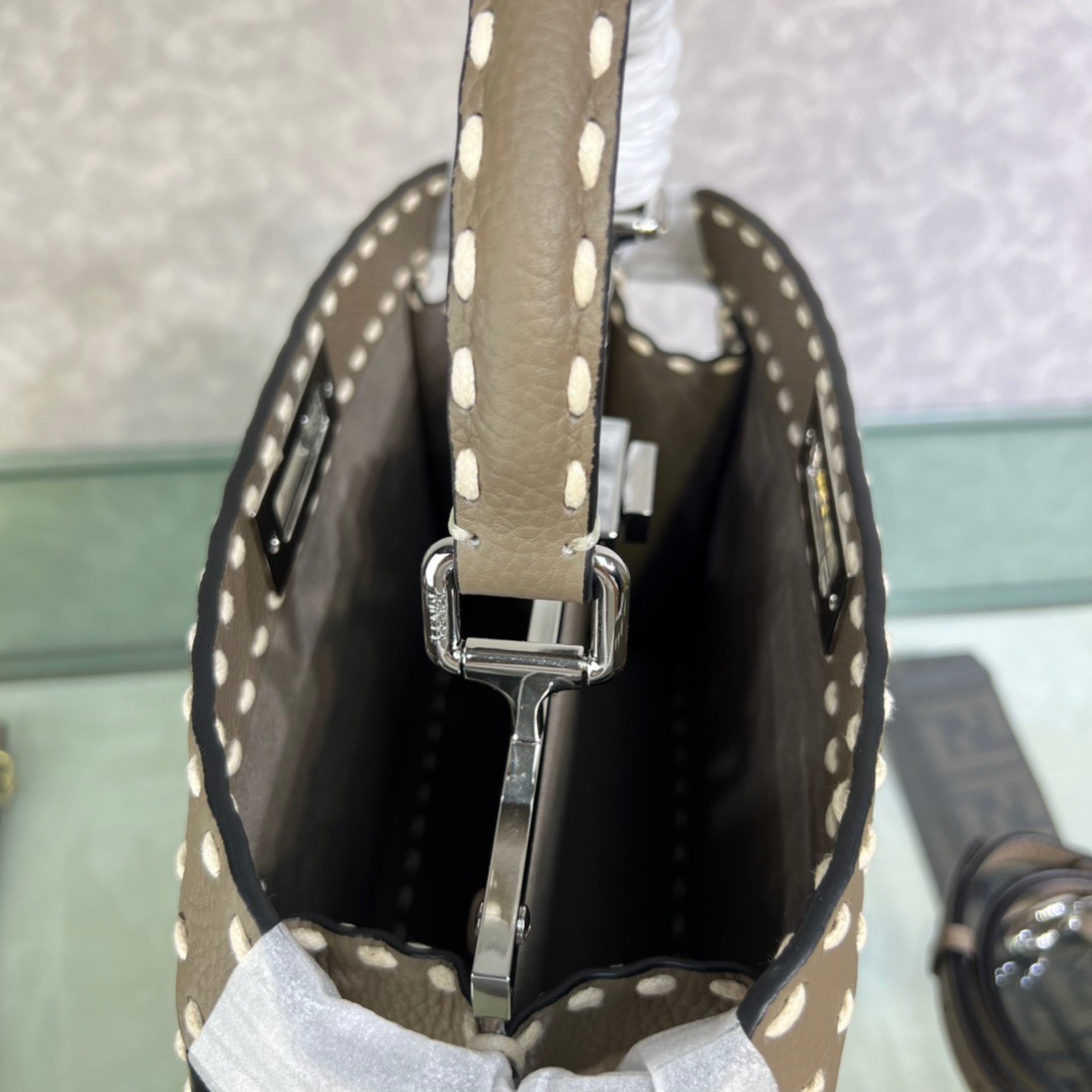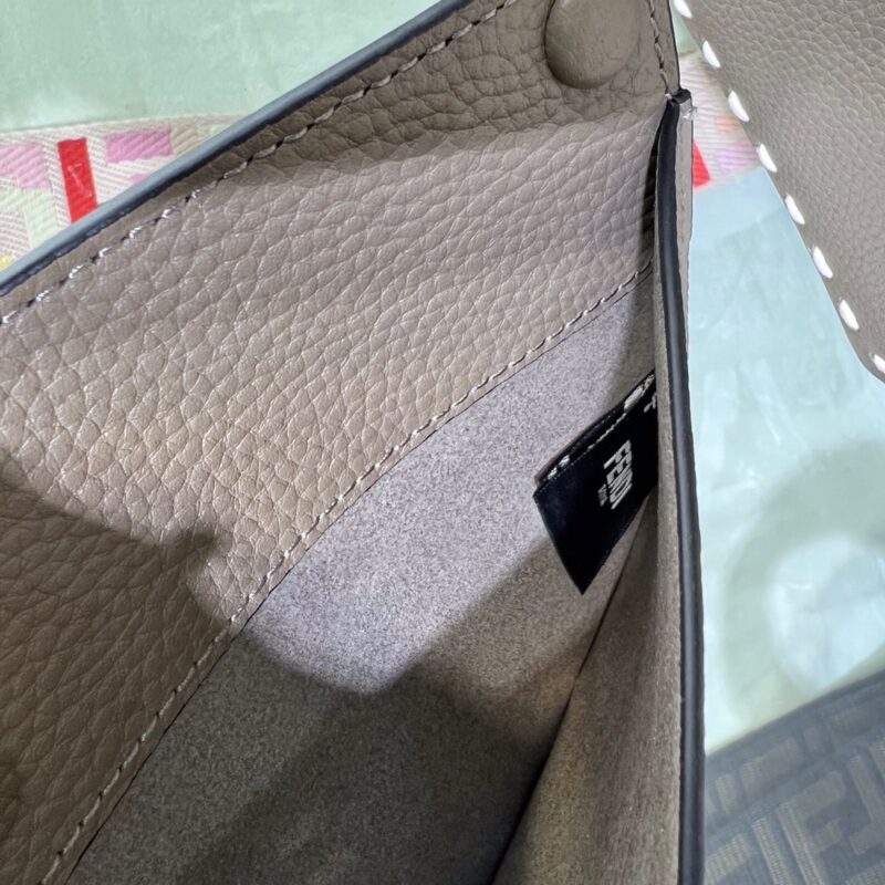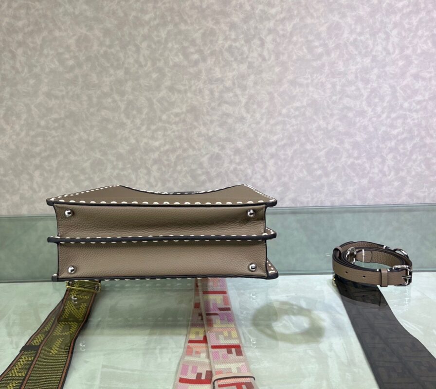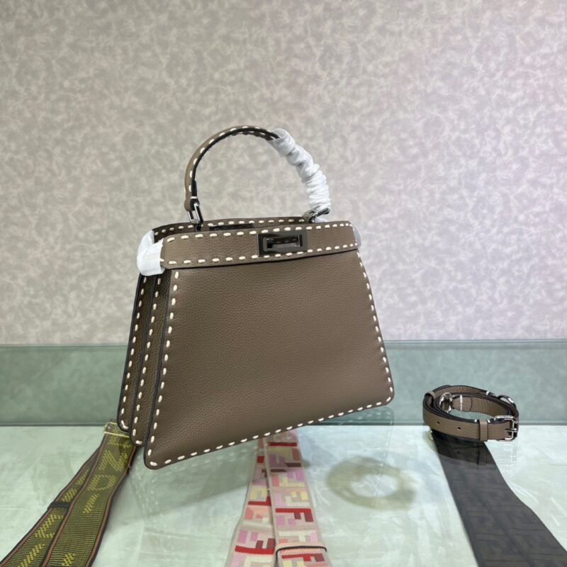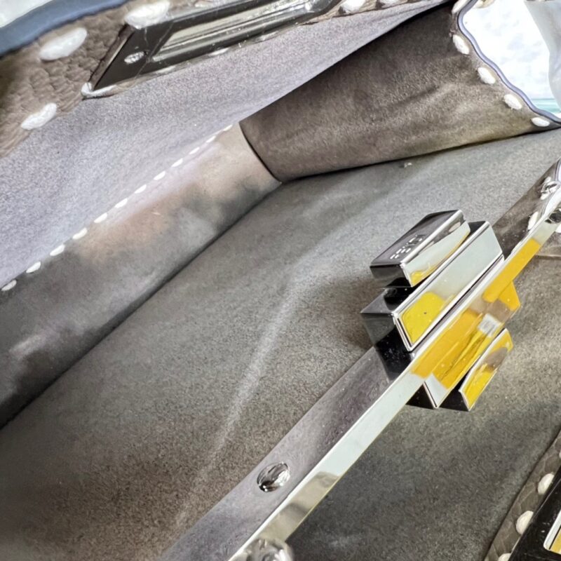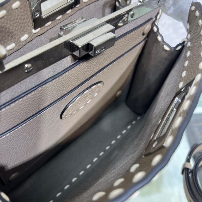 Medium size 33cm Iconic Peekaboo ISeeU medium bag in gray full-grain leather with hand-stitched stitching and classic twist-lock sides. Lined in tonal full-grain leather, the two compartments are separated by a hard divider with removable, customizable pockets and silver-tone hardware. Complete with handles and an adjustable and detachable shoulder strap, it can be carried by hand or over the shoulder. litchi gray Size 33*25.5*13cm
