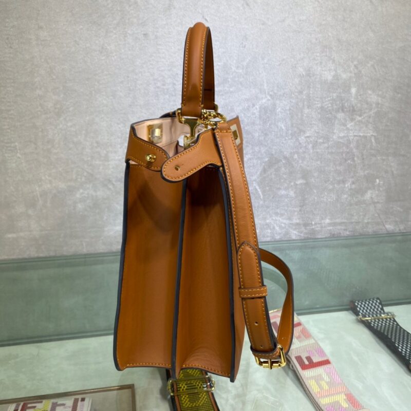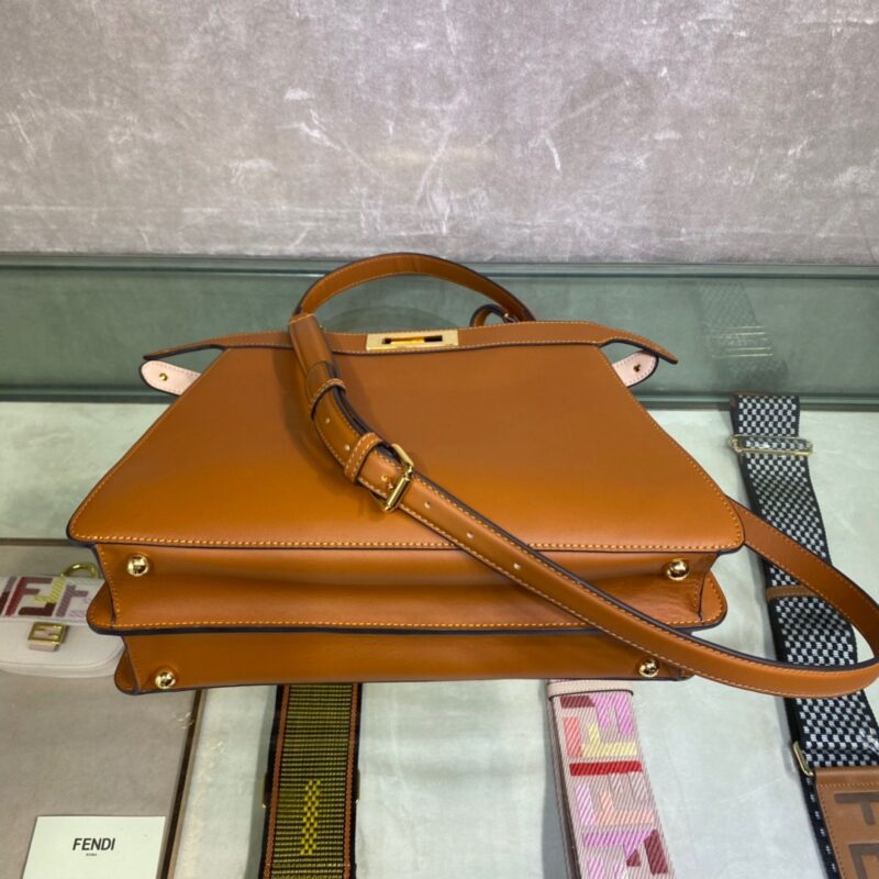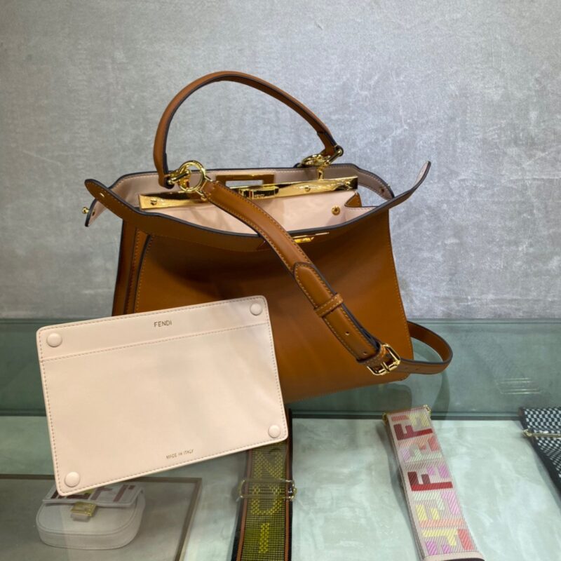 Iconic Peekaboo ISeeU medium bag in caramel leather with classic twist locks on the sides. Lined in soft pink nappa leather, the exterior features two compartments separated by a rigid divider with removable, customizable interior pockets and gold-tone hardware. Complete with handles and an adjustable and detachable shoulder strap, it can be carried by hand or over the shoulder. Size: 33x25x13cm