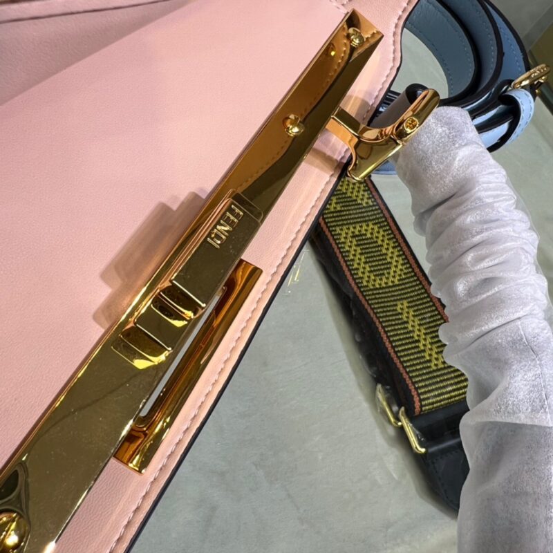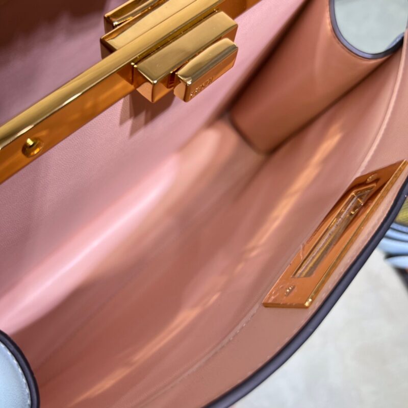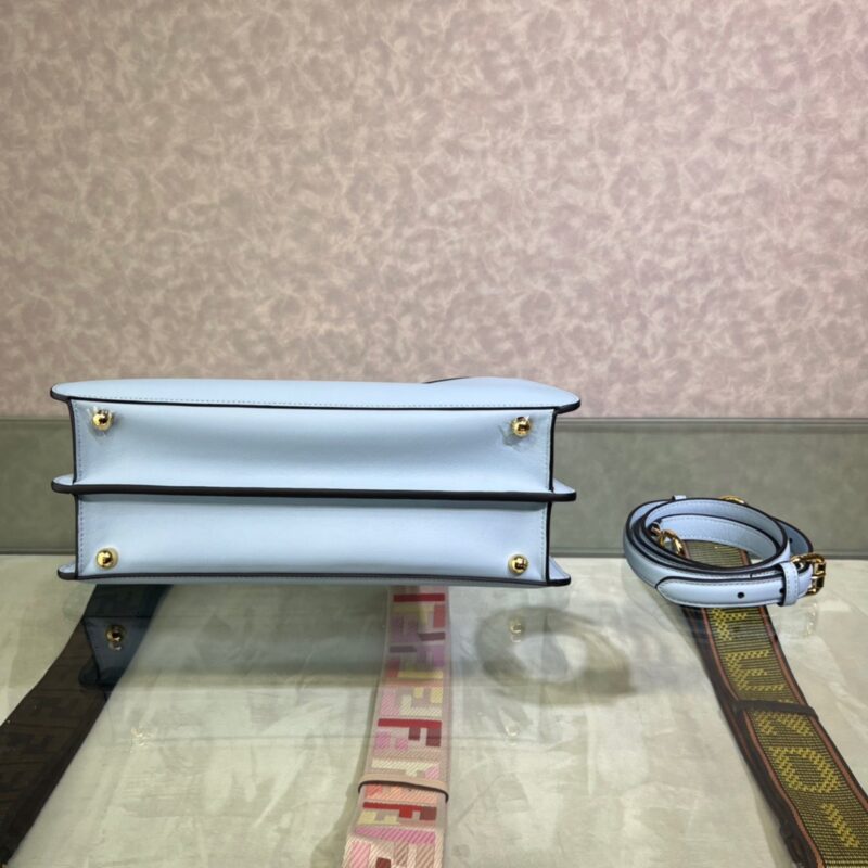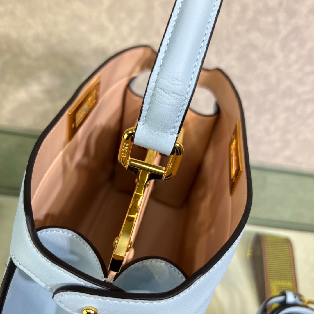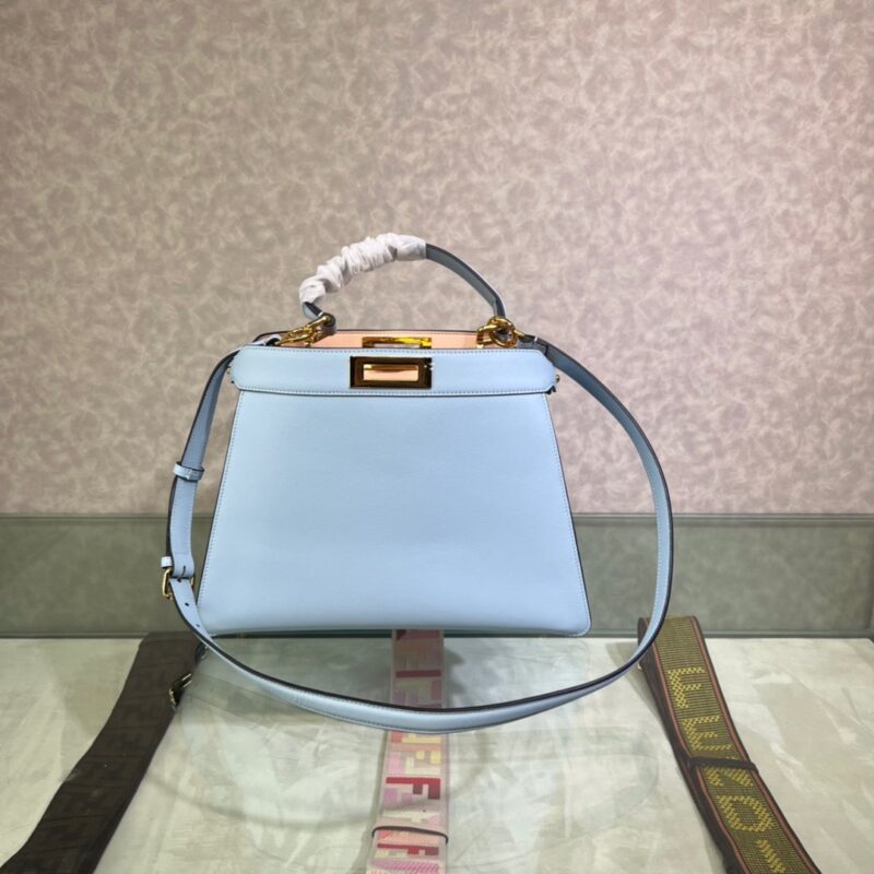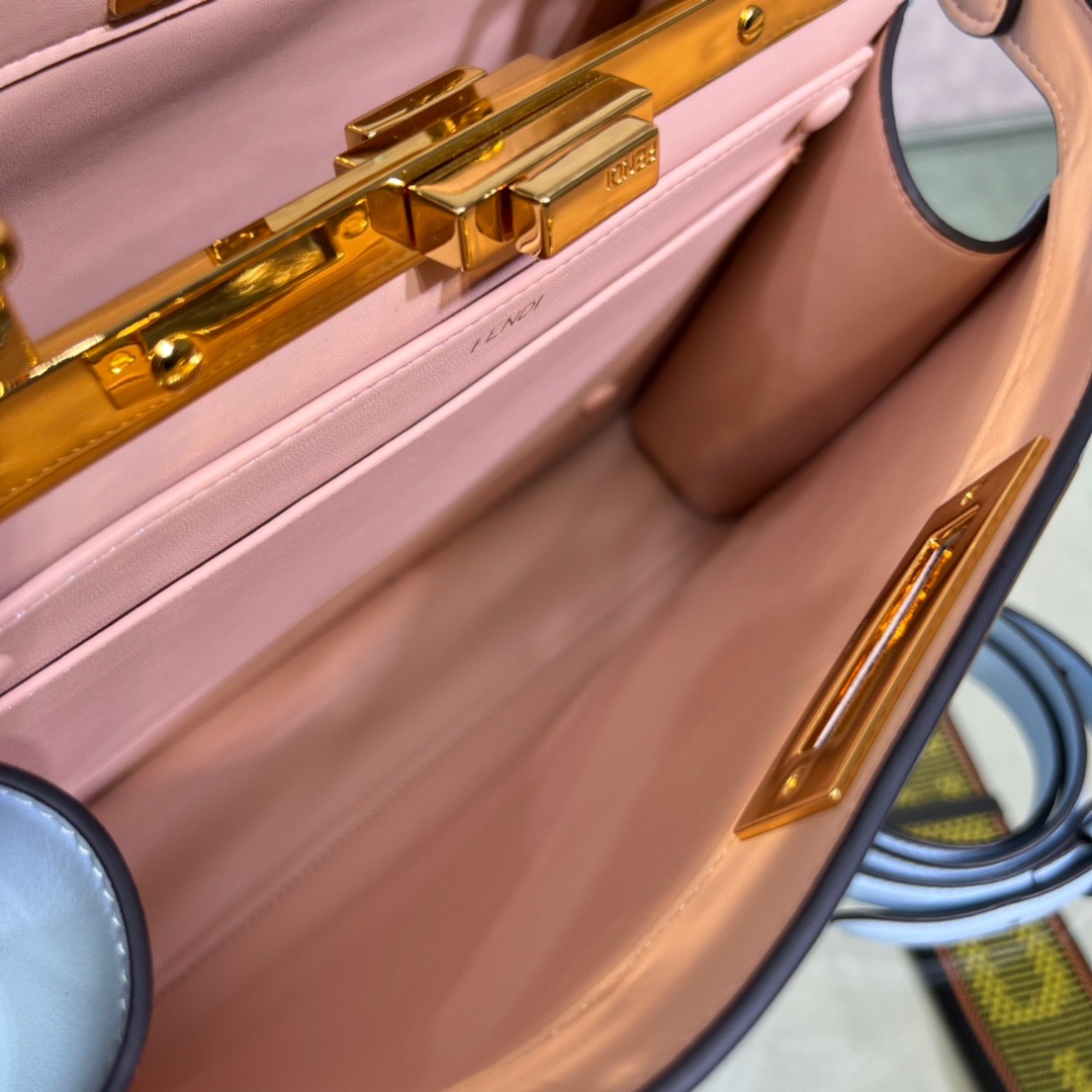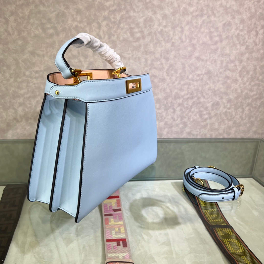 New color 33cm Iconic Peekaboo ISeeU medium bag in light blue leather with classic twist locks on the sides. Lined in soft pink nappa leather, the exterior features two compartments separated by a rigid divider with removable, customizable interior pockets and gold-tone hardware. Complete with handles and an adjustable and detachable shoulder strap, it can be carried by hand or over the shoulder. Size: 33x25x13cm