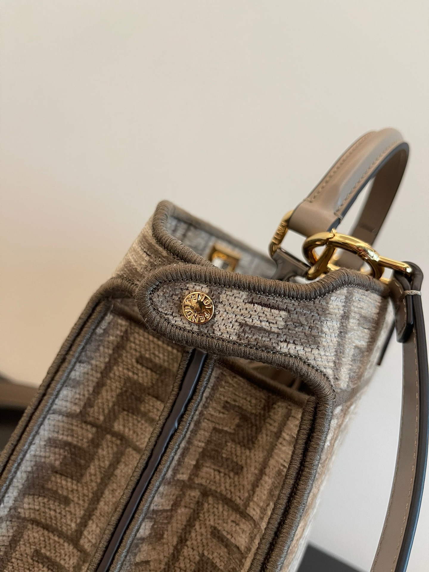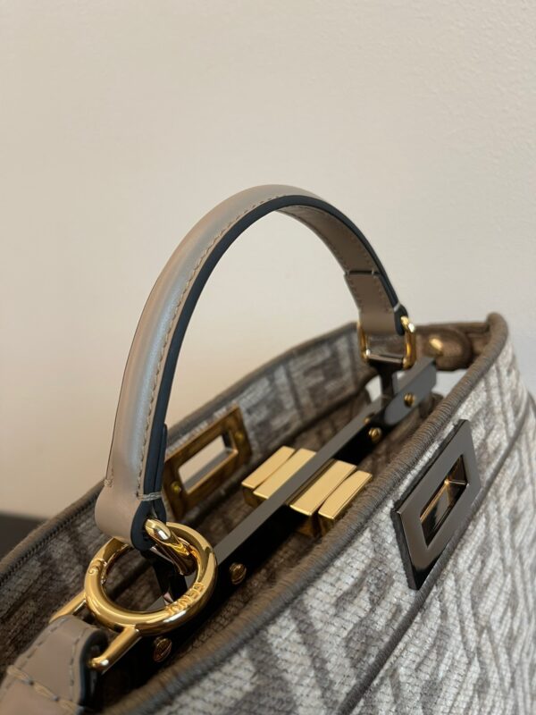 Iconic Peekaboo ISeeU Small Bag Body in chenille with dove gray FF brocade motif. Signature twist locks accent the sides. Tonal-lined interior with two compartments separated by a hard divider, interior buttoned light gray leather pocket, and silver-tone and gold-tone hardware. The bag has leather handles and an adjustable and removable leather shoulder strap to carry it by hand, over the shoulder or across the body Size 27x21x11cm