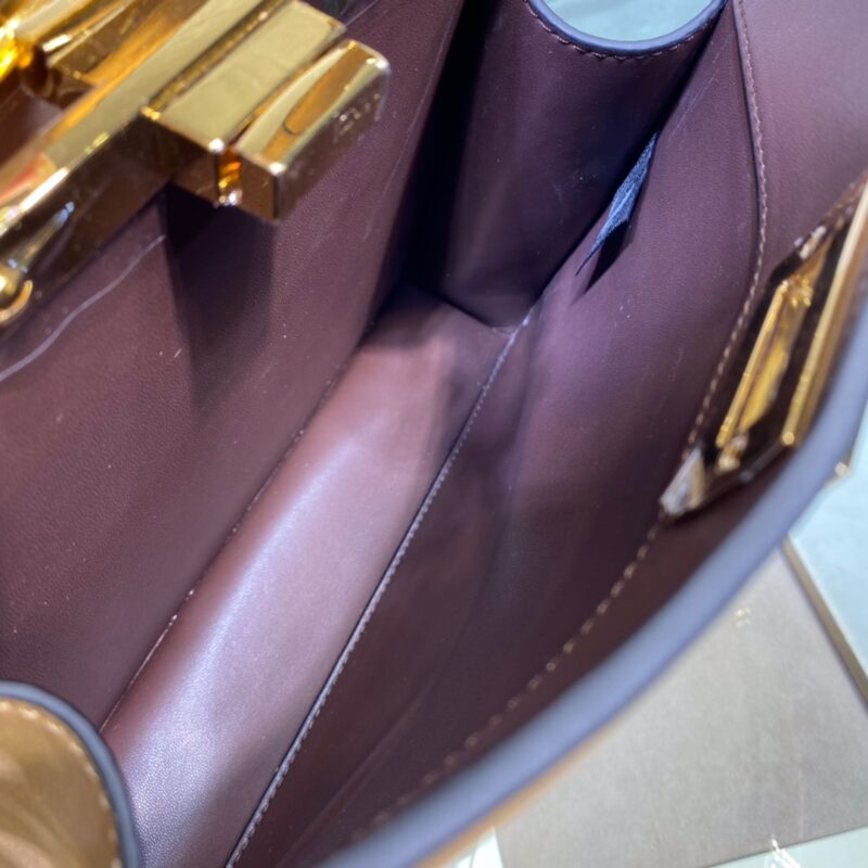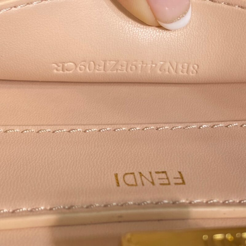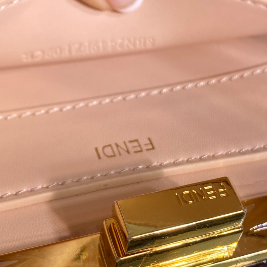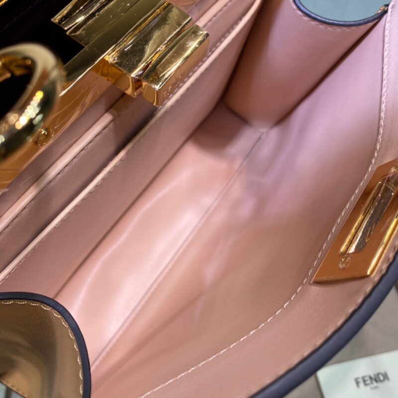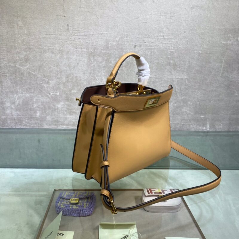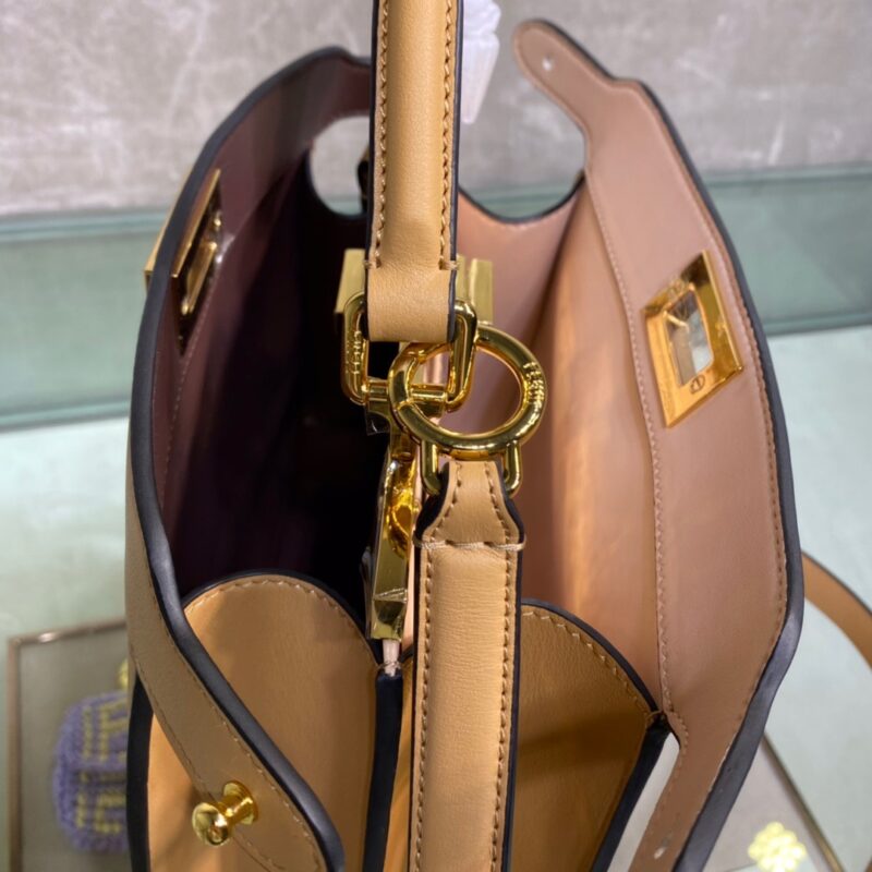 Small Iconic Peekaboo ISeeU bag in apricot leather with classic twist locks on the sides. Pink and brown soft nappa leather lining, two compartments separated by a hard divider, interior button pocket, and gold-tone hardware. The bag has handles and an adjustable and detachable shoulder strap, so it can be carried by hand, over the shoulder or across the body. Size 27*21*9.5cm
