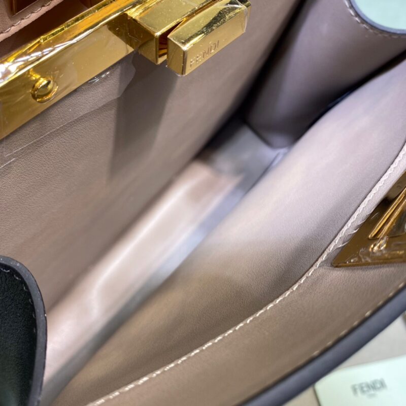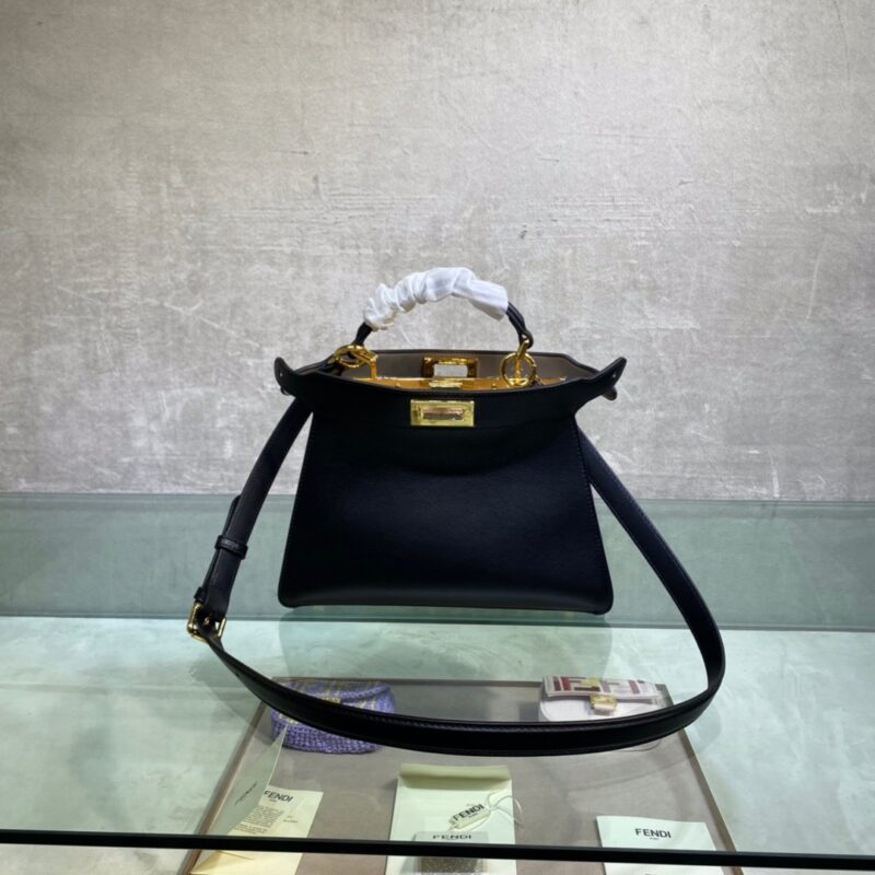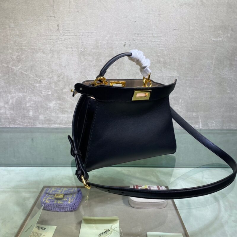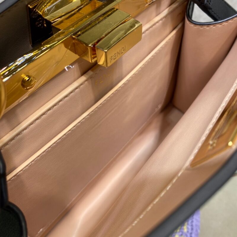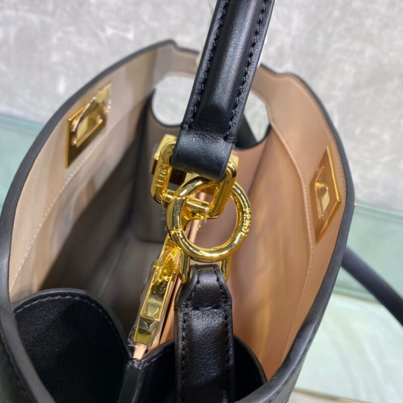 Small Iconic Peekaboo ISeeU bag in black leather with classic twist locks on the sides. Pink and brown soft nappa leather lining, two compartments separated by a hard divider, interior button pocket, and gold-tone hardware. The bag has handles and an adjustable and detachable shoulder strap, so it can be carried by hand, over the shoulder or across the body. Size 27*21*9.5cm