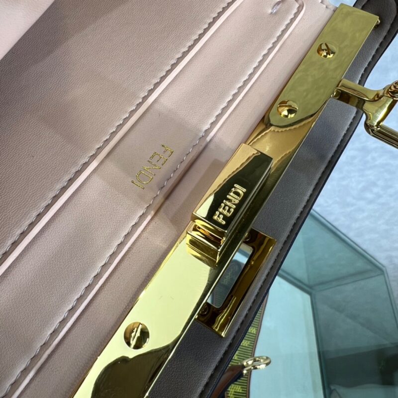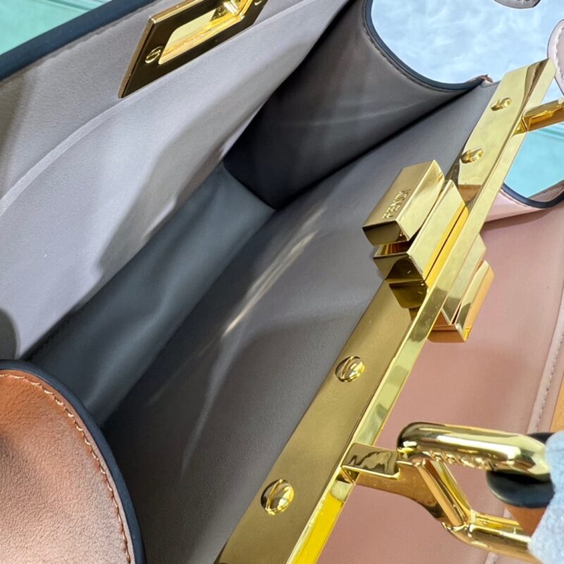 Small Iconic Peekaboo ISeeU bag in brown leather with classic twist locks on the sides. Soft nappa leather lining in pink, two compartments separated by a rigid divider, interior button pocket, and gold-tone hardware. The bag has handles and an adjustable and detachable shoulder strap, so it can be carried by hand, over the shoulder or across the body. Size 27*21*9.5cm