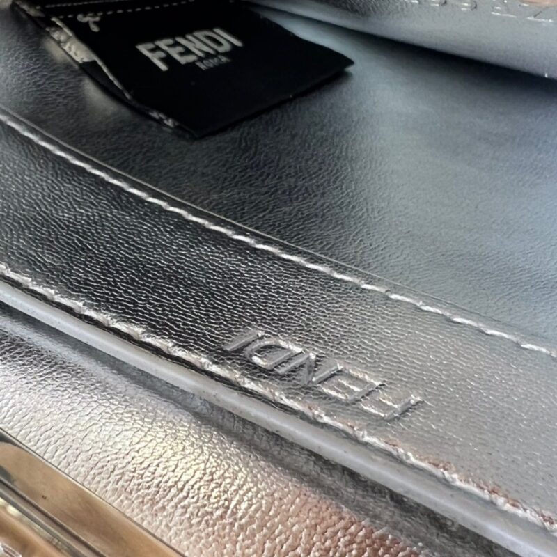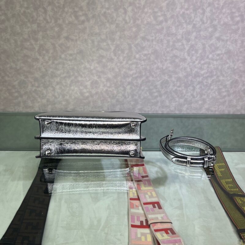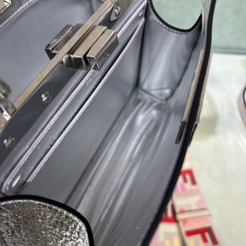 Small Iconic Peekaboo ISeeU bag in silver-tone leather with classic twist locks on the sides. Silver-tone soft nappa leather lining, two compartments separated by a rigid divider, interior button pocket and silver-tone hardware. The bag has handles and an adjustable and detachable shoulder strap, so it can be carried by hand, over the shoulder or across the body. Size 27*21*9.5cm