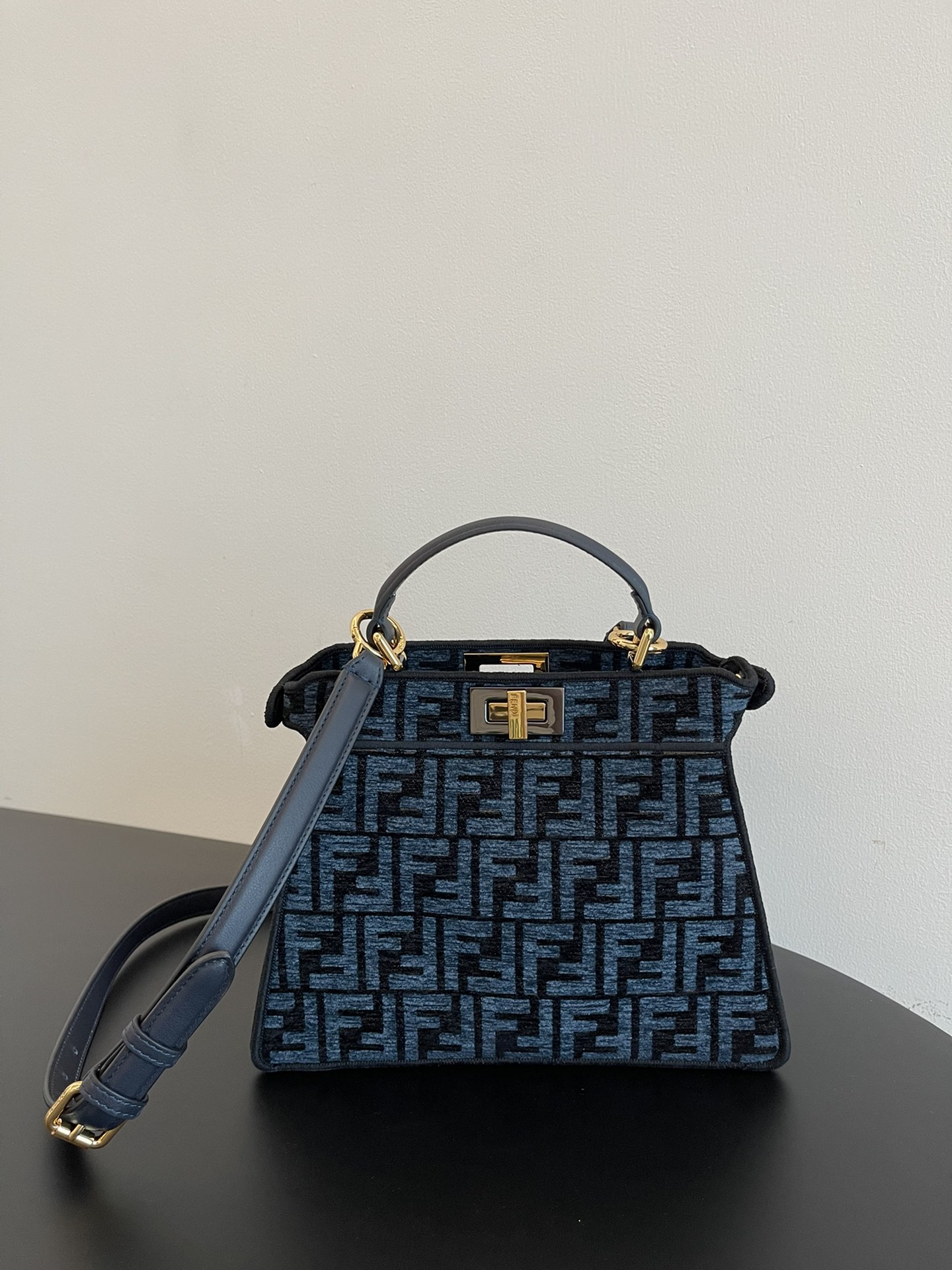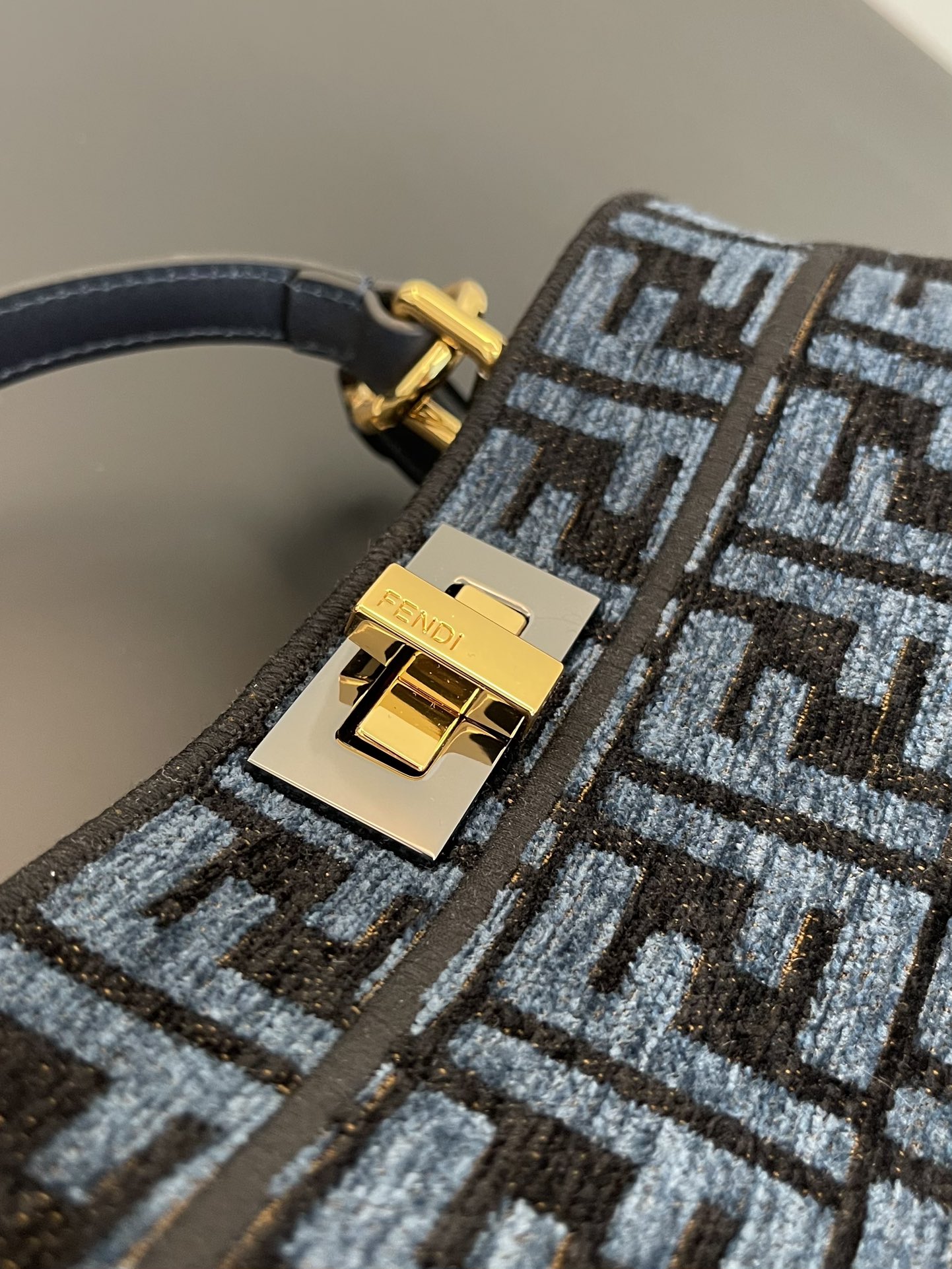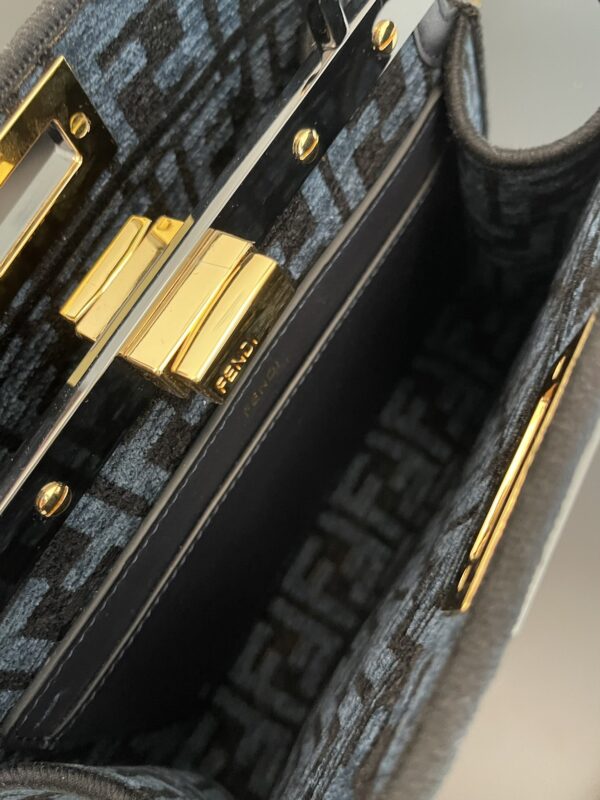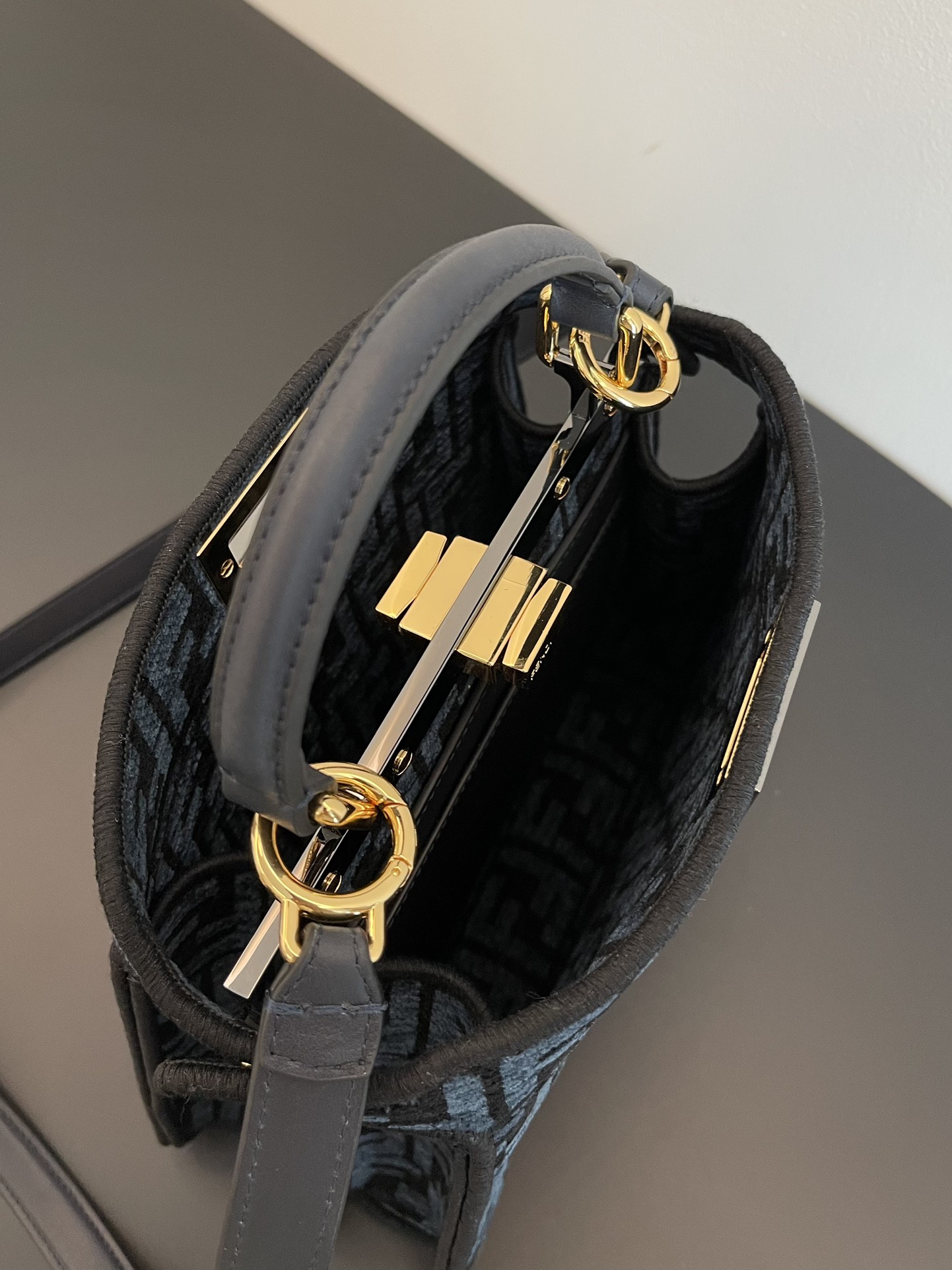 Iconic Peekaboo Small Bag Body in chenille with dove grey FF brocade pattern. Signature twist lock accents the sides. Tonal-lined interior with two compartments separated by a hard divider, interior button pocket in light grey leather, and mixed silver and gold-tone hardware. Bag with leather handle and adjustable and detachable leather shoulder strap for hand, shoulder or cross-body wear. Size: 27x21x11cm