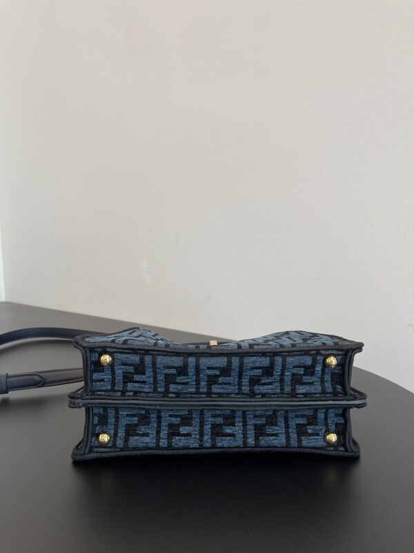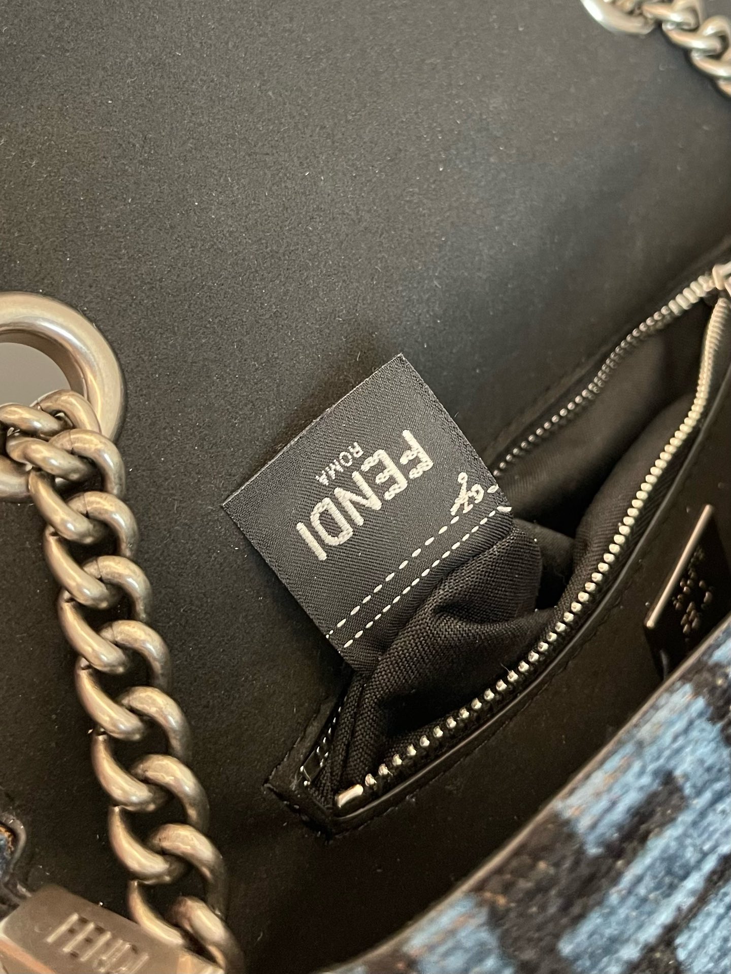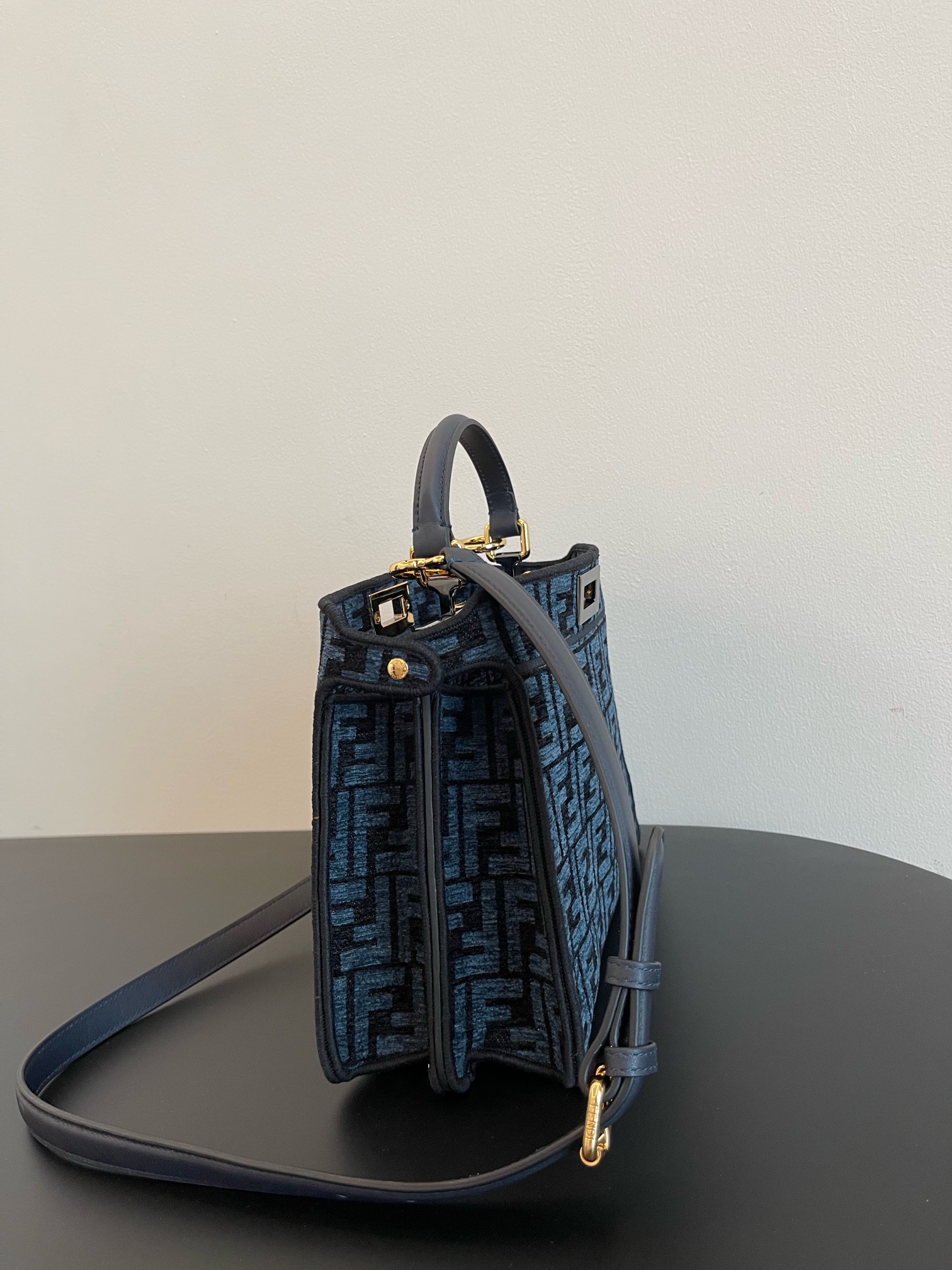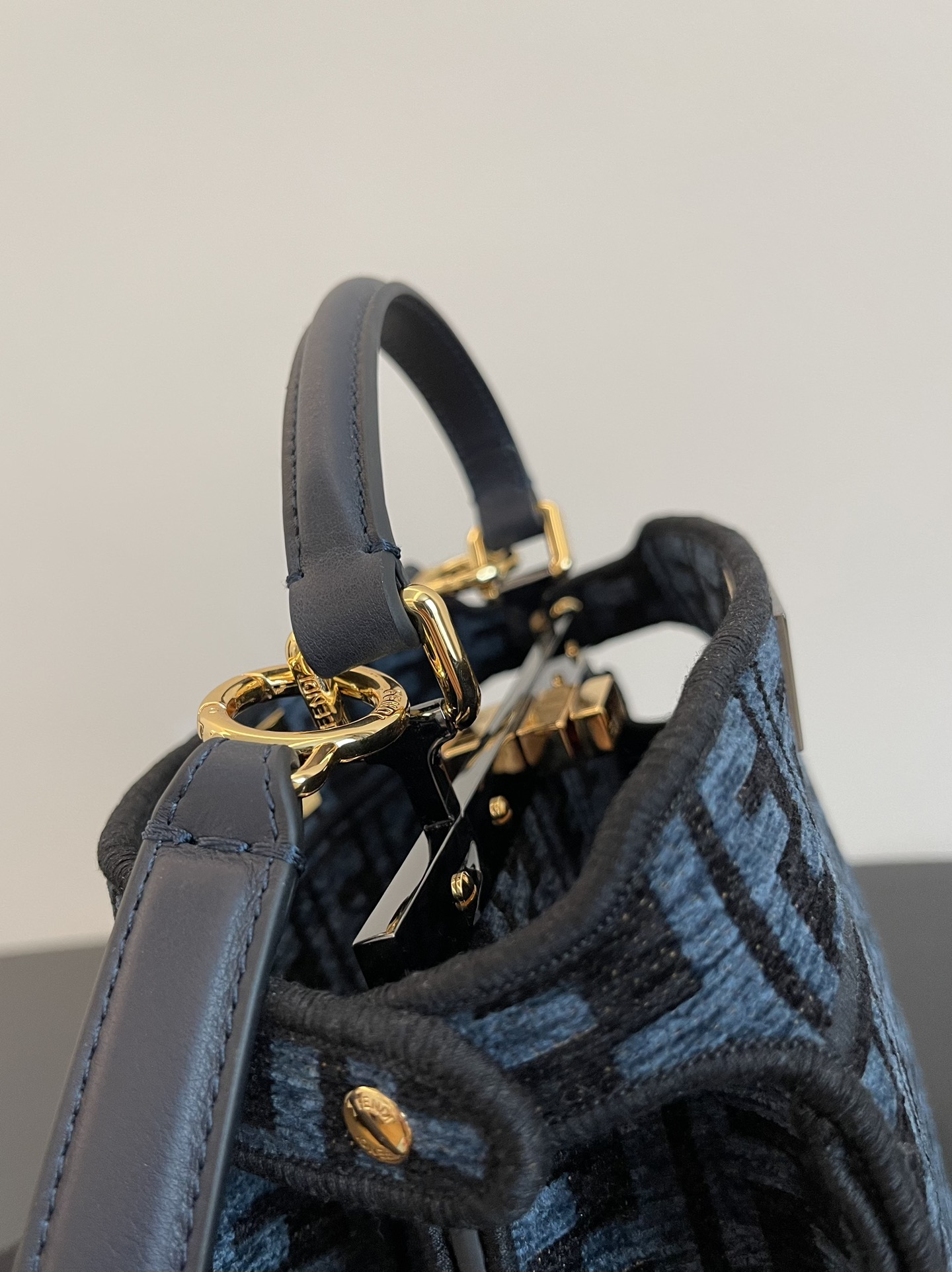 Iconic Peekaboo Small Bag Body in chenille with dove grey FF brocade pattern. Signature twist lock accents the sides. Tonal-lined interior with two compartments separated by a hard divider, interior button pocket in light grey leather, and mixed silver and gold-tone hardware. Bag with leather handle and adjustable and detachable leather shoulder strap for hand, shoulder or cross-body wear. Size: 27x21x11cm