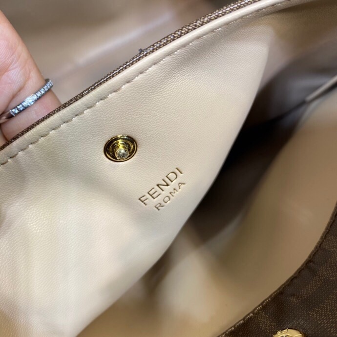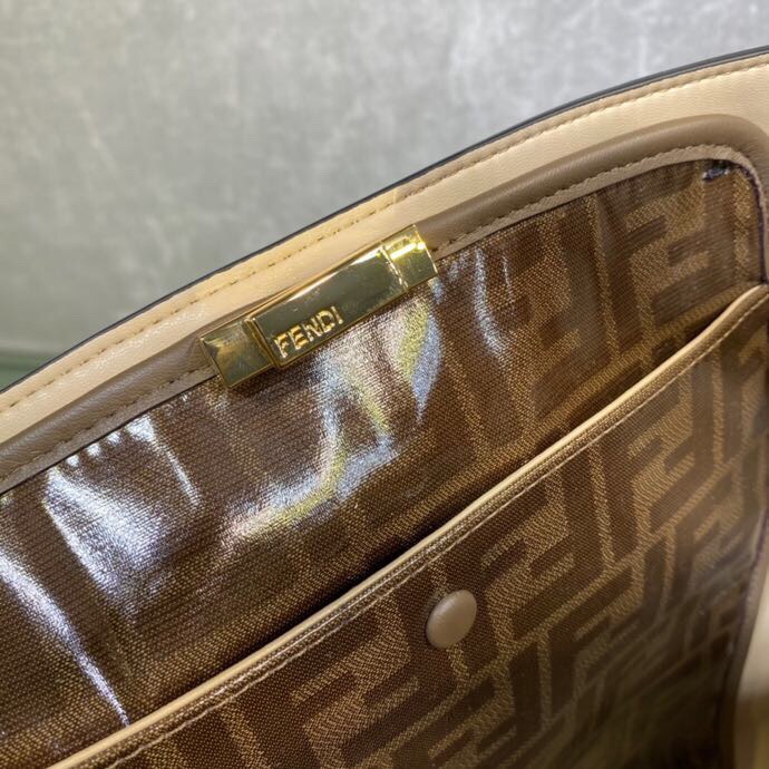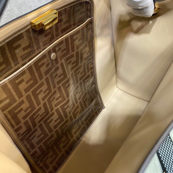 Large Peekaboo X-Lite bag with interior pocket and signature twist lock. Single handle and detachable shoulder strap. Made of black calfskin. Interior in glazed fabric with tone-on-tone FF motif. Gold-tone hardware. Size 42*12*32cm