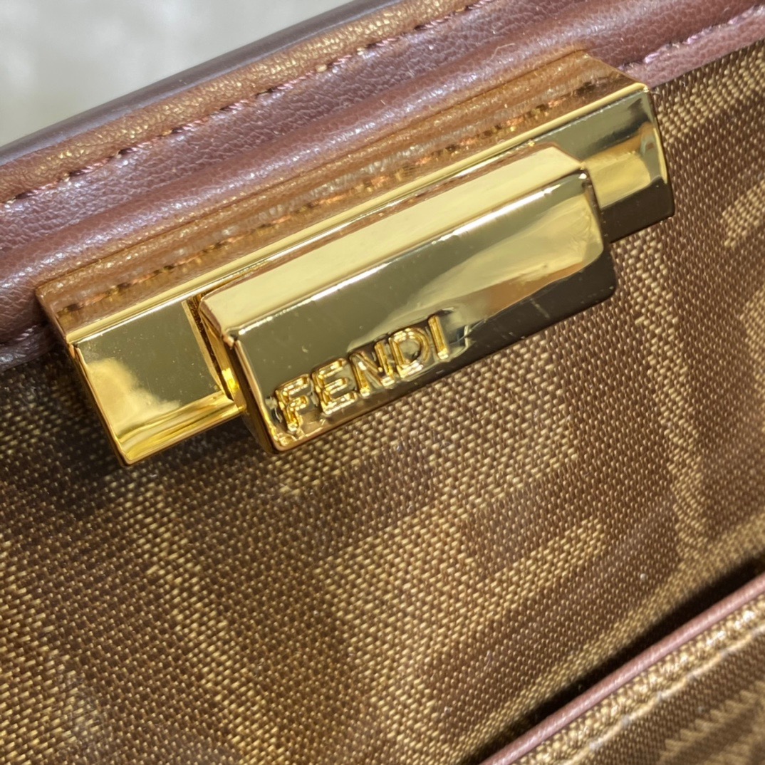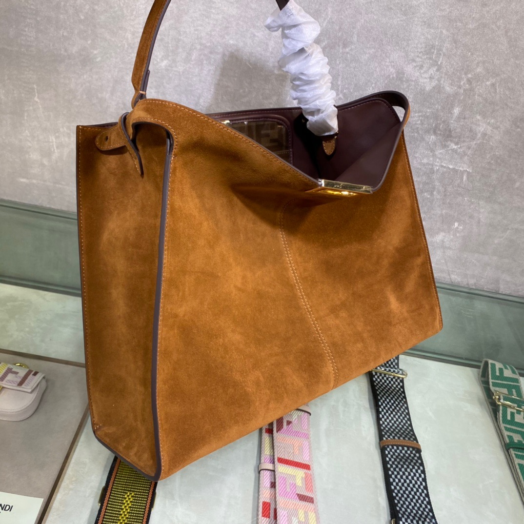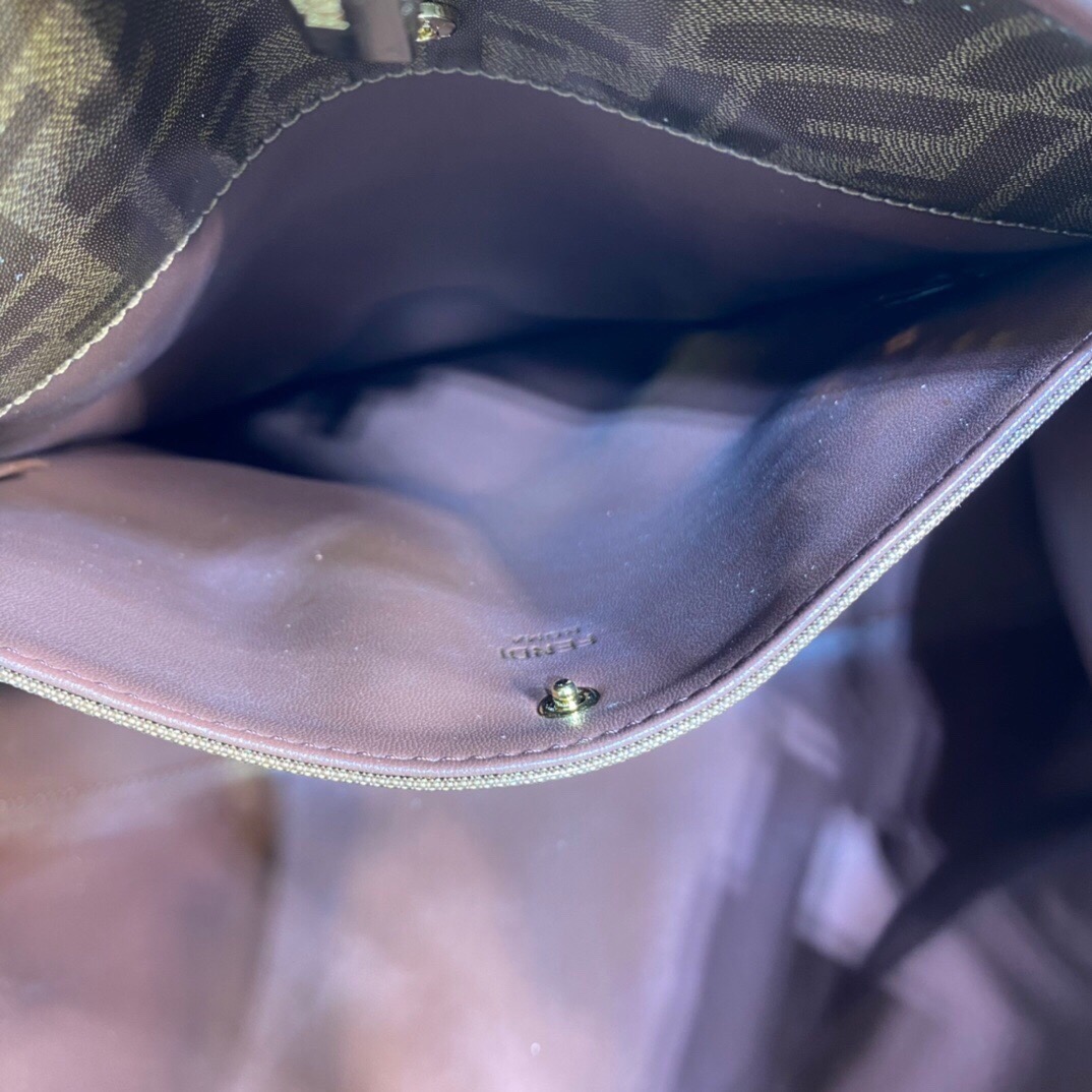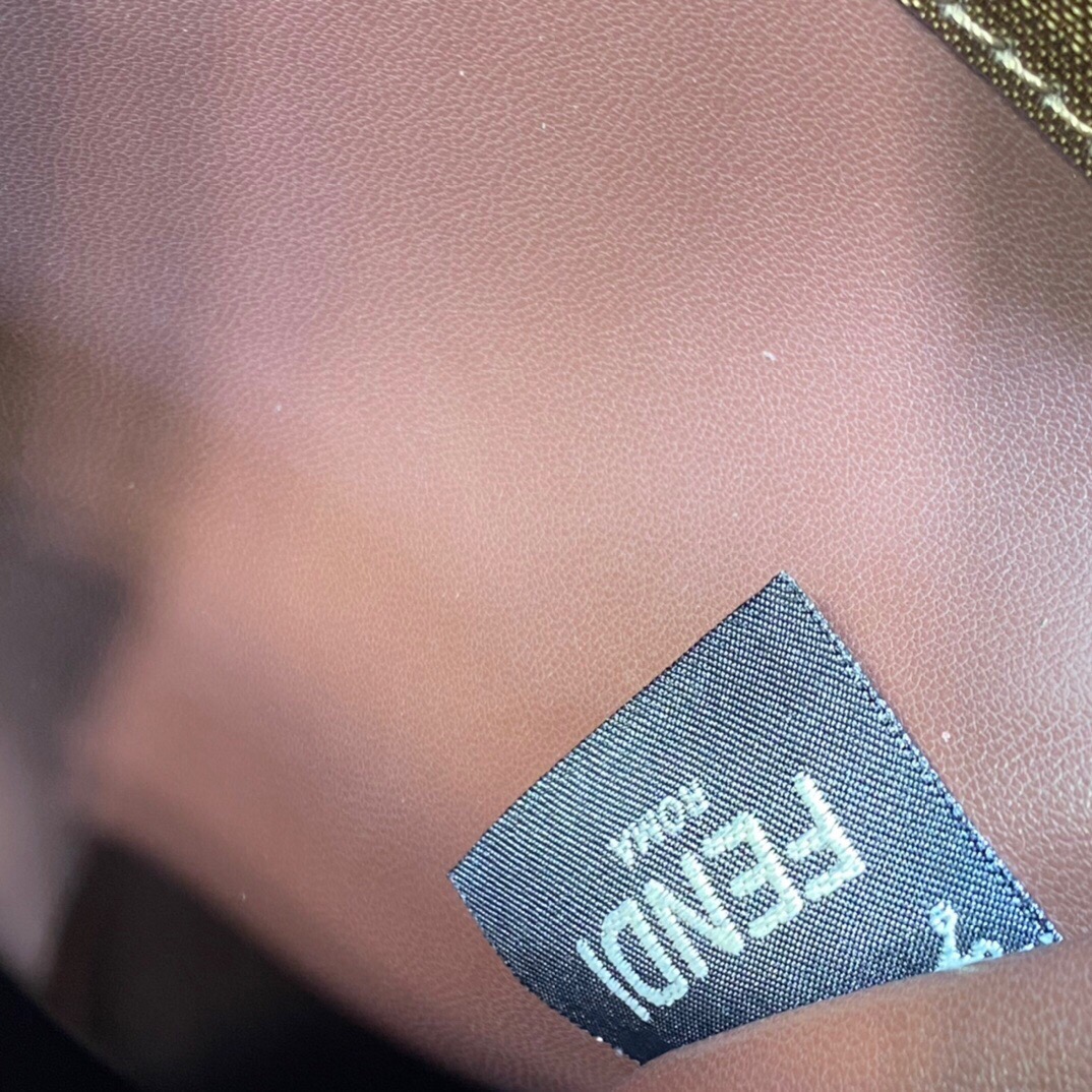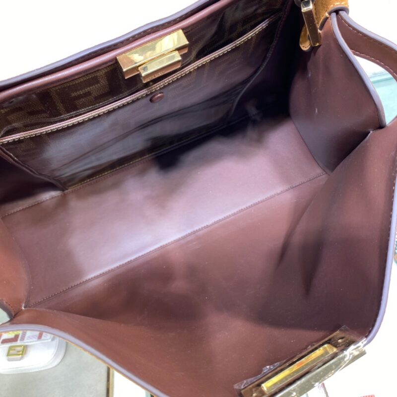 Soft and lightweight large bag. One flat pocket inside the roomy compartment. Single handle and twist lock. Made of khaki suede. Inner pocket in glazed fabric with brown jacquard FF motif. Gold-tone hardware. Size 42*12*32cm