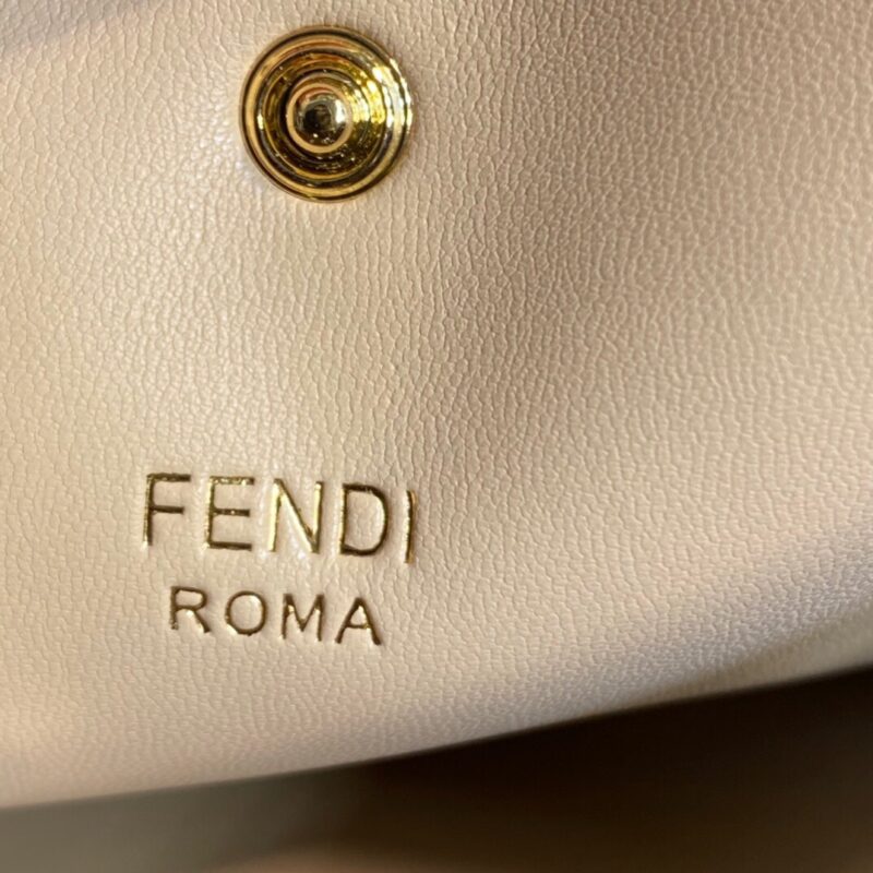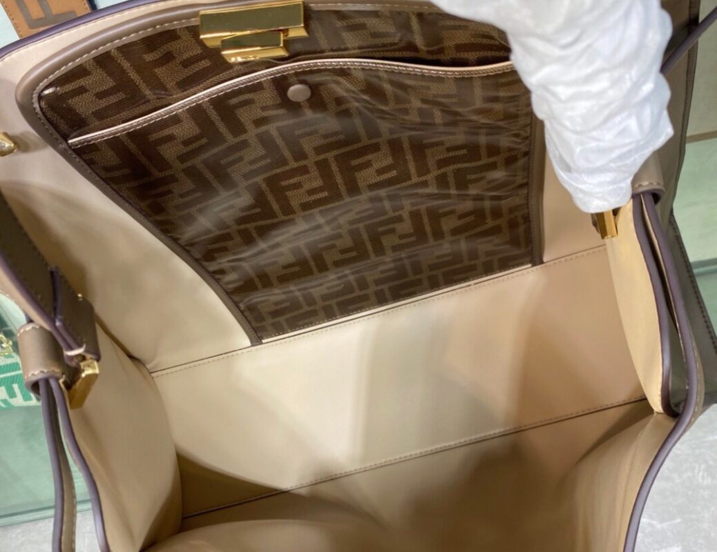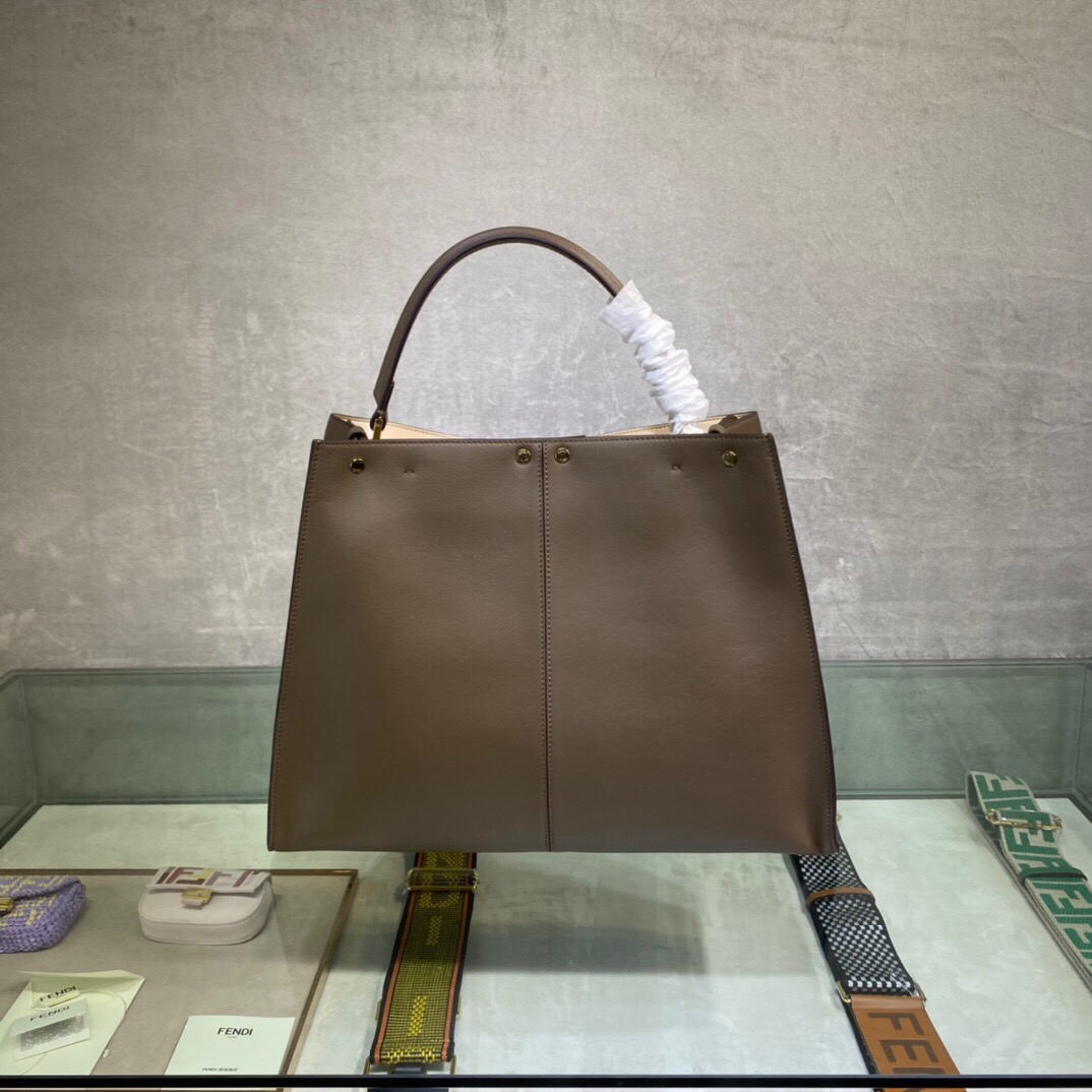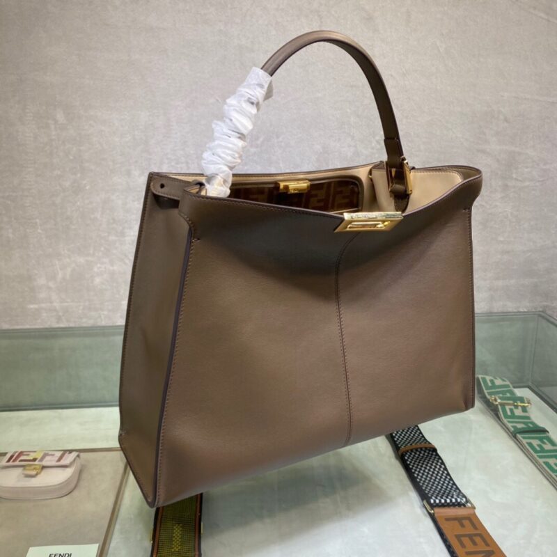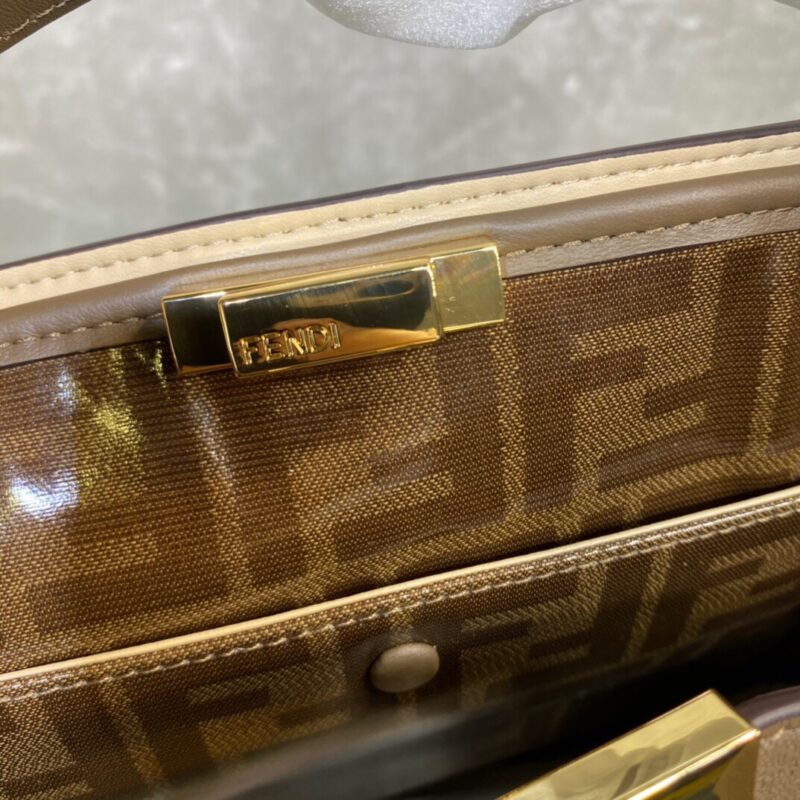 Large Peekaboo X-Lite bag with interior pocket and signature twist lock. Single handle and detachable shoulder strap. Made of dark brown calfskin. Interior in glazed fabric with tone-on-tone FF motif. Gold-tone hardware. Size 42*12*32cm
