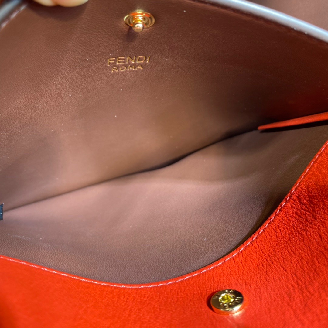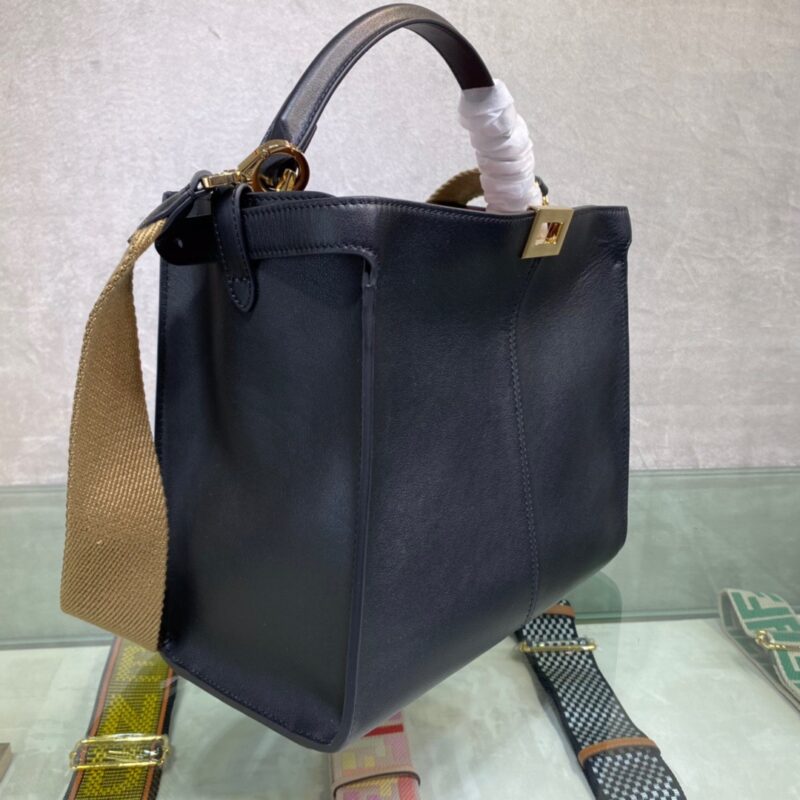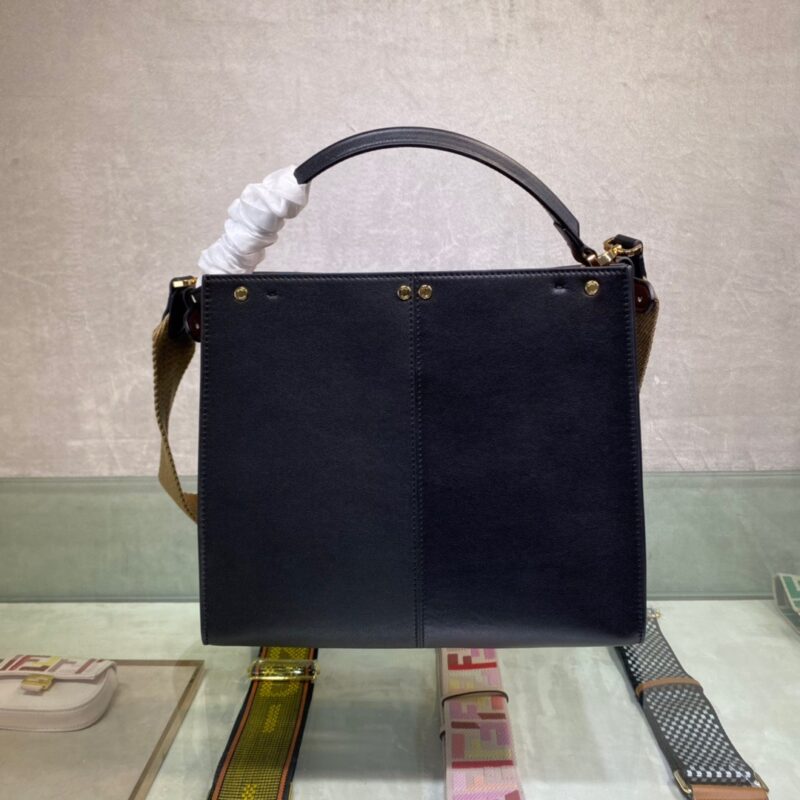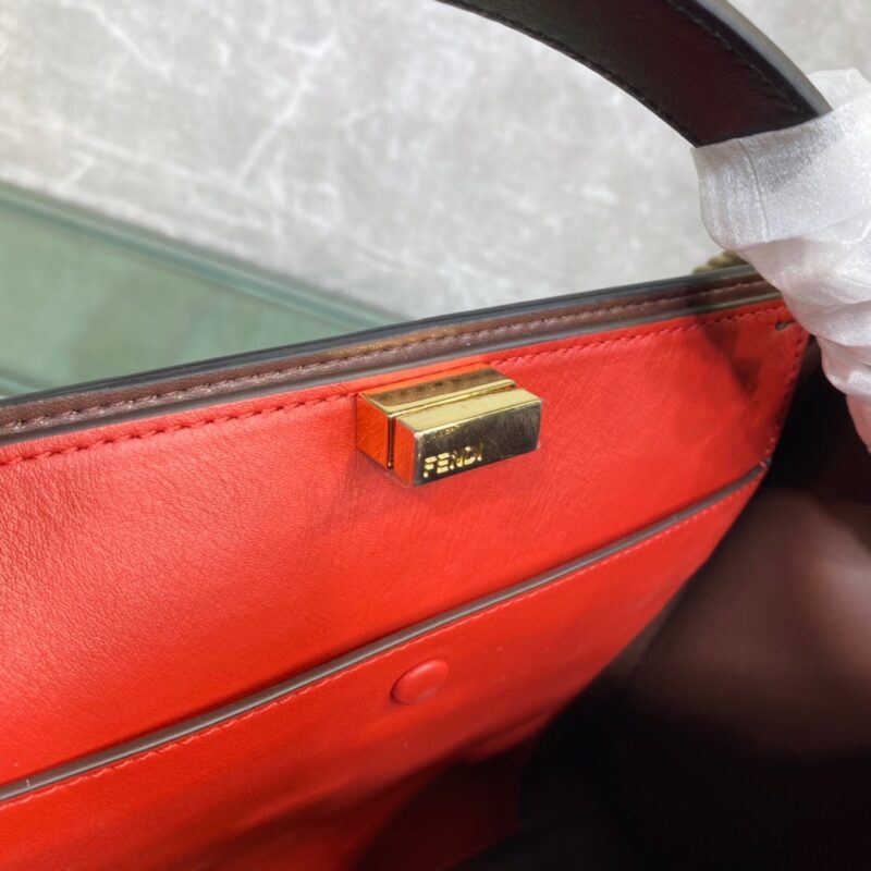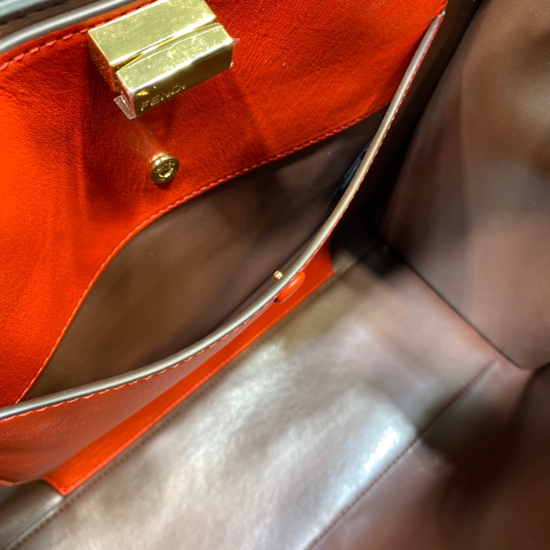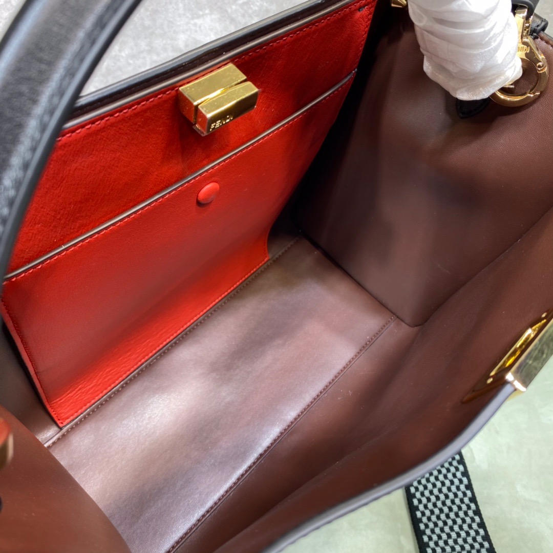 Fendi Peekaboo X-Lite small size with shoulder strap Features interior pockets and signature twist lock. Single handle and detachable shoulder strap. Made of brown calfskin. Inner pocket in glazed fabric with jacquard FF motif. Canvas shoulder straps. Gold-tone hardware. Size 30cm