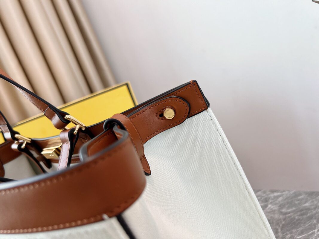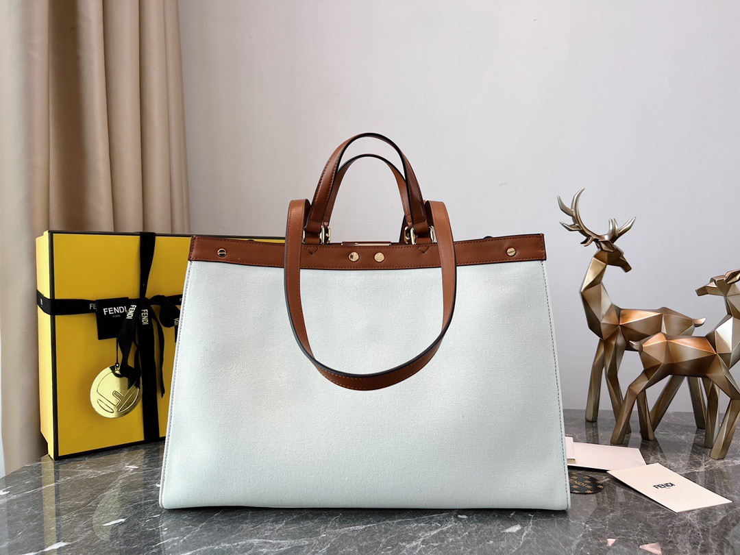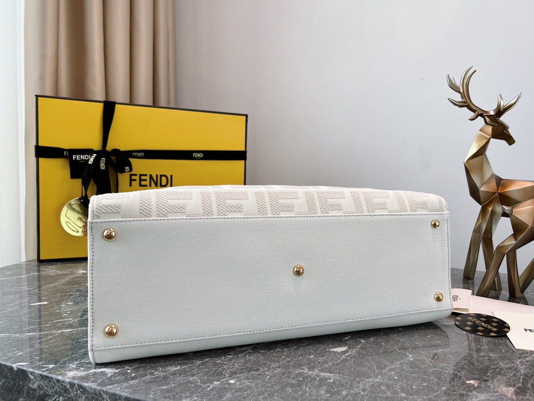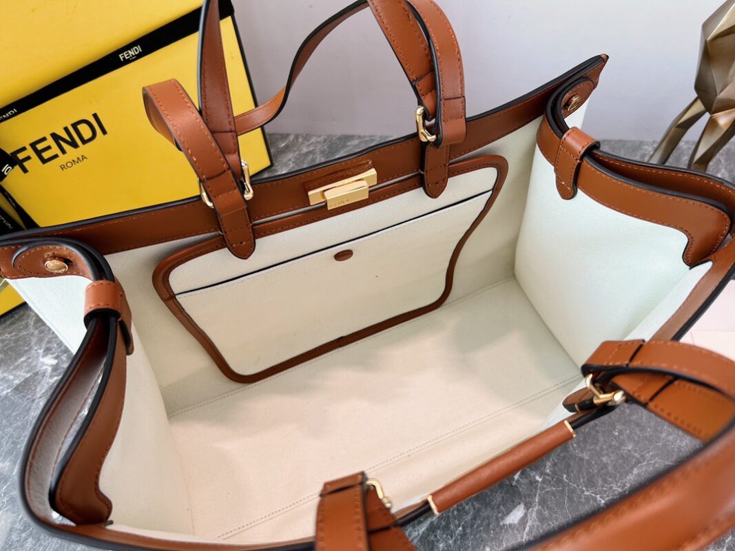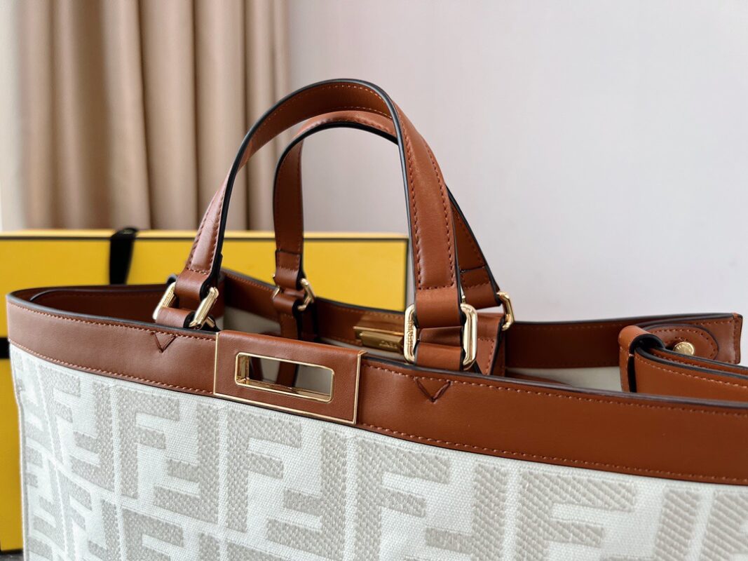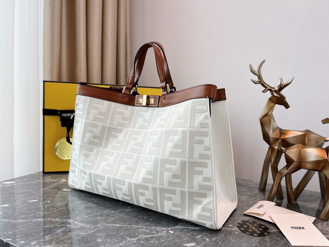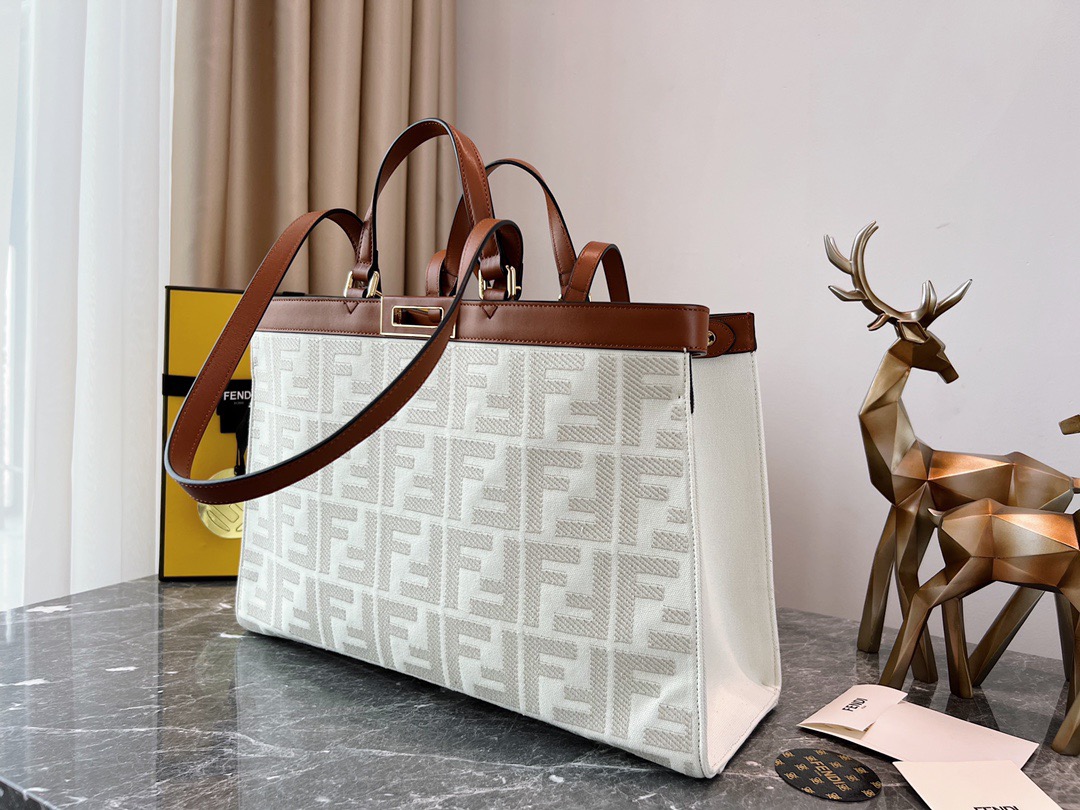 Fendi latest double FF embroidery Peekaboo X-tote The classic embroidered double F canvas is paired with Peekaboo’s classic swivel buckle. The whole is high-end and retro. It is especially suitable for light and familiar wear. The bag is very light in weight, and it is also a good choice for daily commuting. Size 41x16x30cm Style No. 374