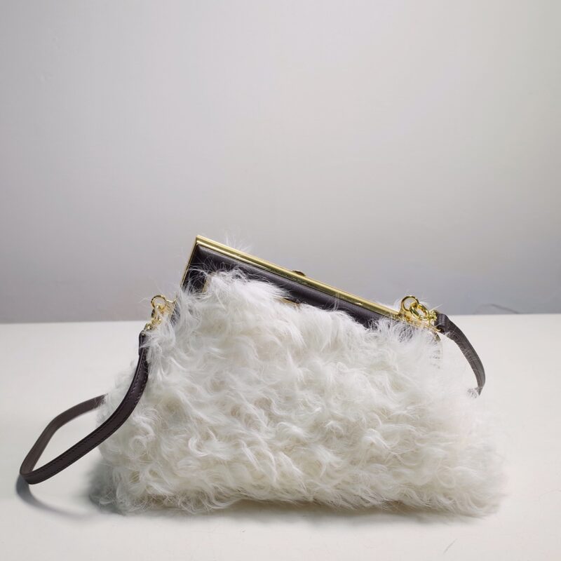 Small Fendi First bag in mohair wool, fur-effect texture, dark brown navy Oversized metal F buckle on par leather. Internal compartment with signature FF pattern fabric inside. Lined with removable inner hook and gold-tone hardware. Comes with a detachable shoulder strap, can be carried by hand or on the shoulder. Size: 26*9.5*18cm. 6050