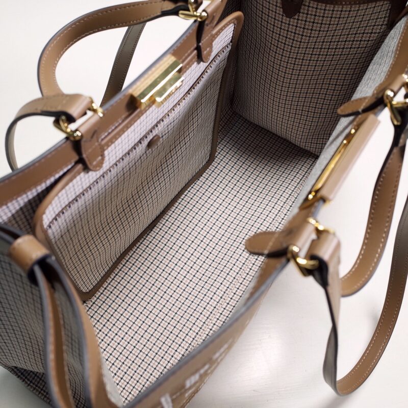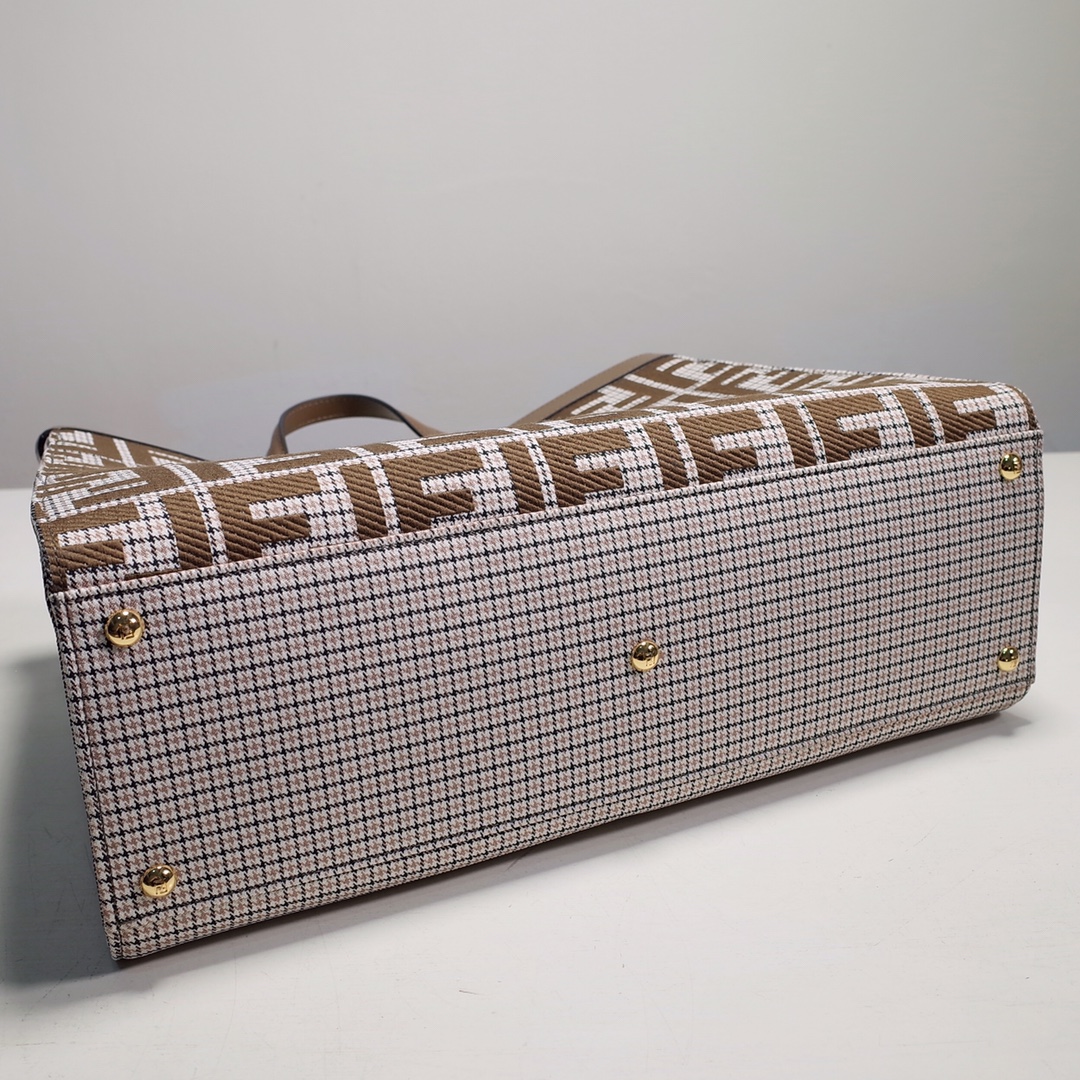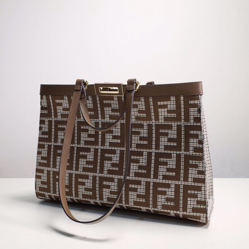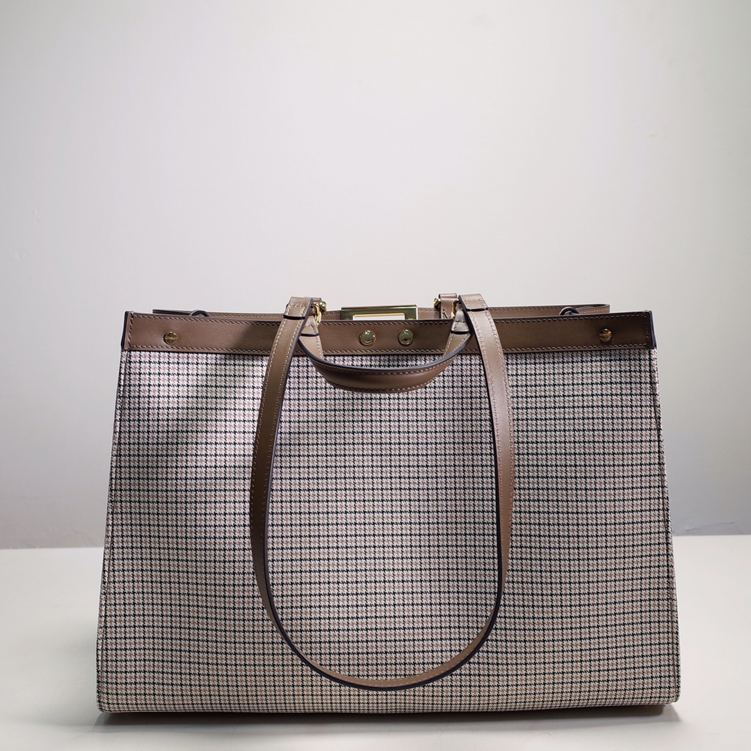 Fendi X-Tote medium bag in brown houndstooth wool with embroidered FF pattern. Featuring tonal leather trim and a classic twist lock. Unlined and fastened with a snap button, pockets and hardware in grey and gold finishes with two short hand-held handles and two long handles that can be carried over the shoulder. Size: 41*16*29.5.8374