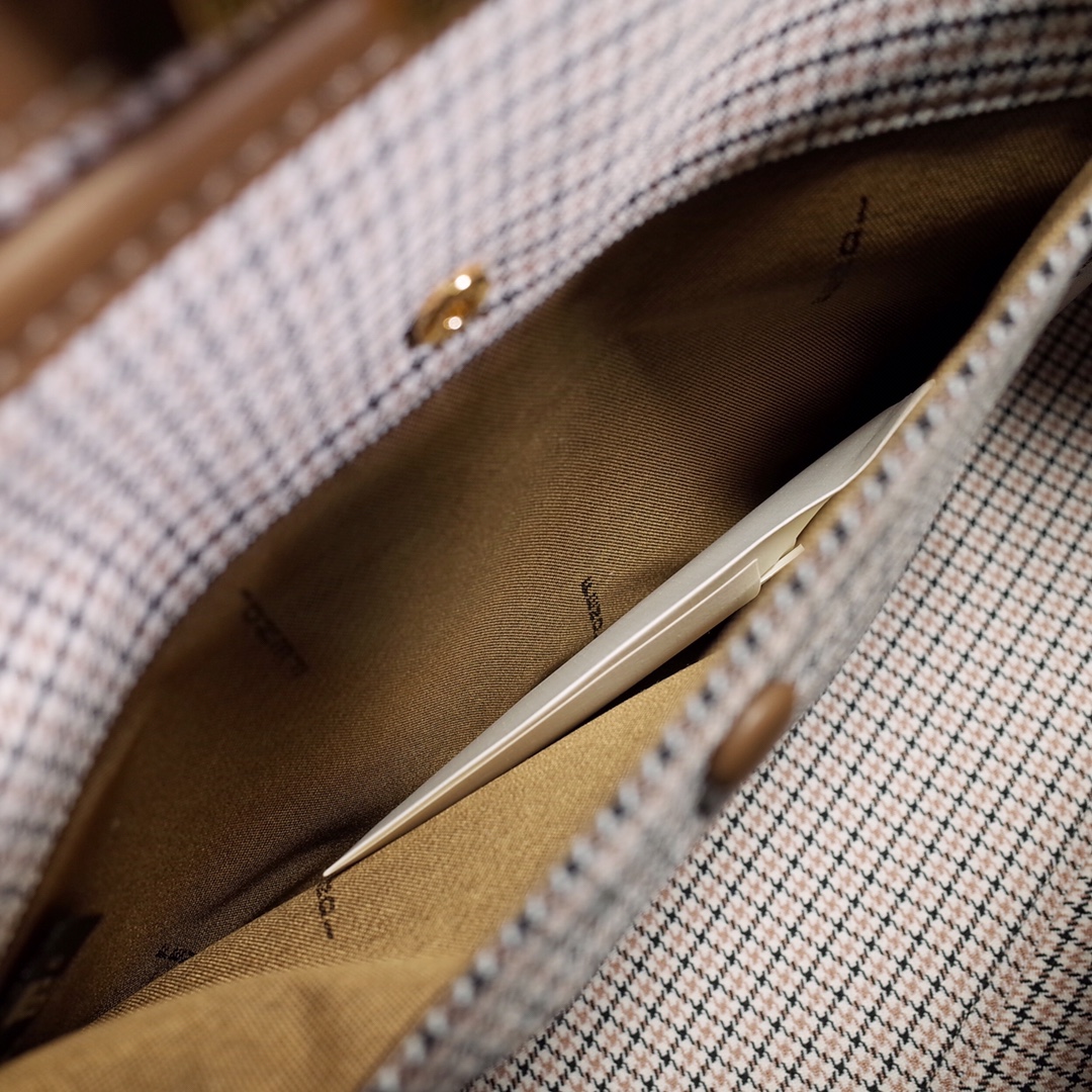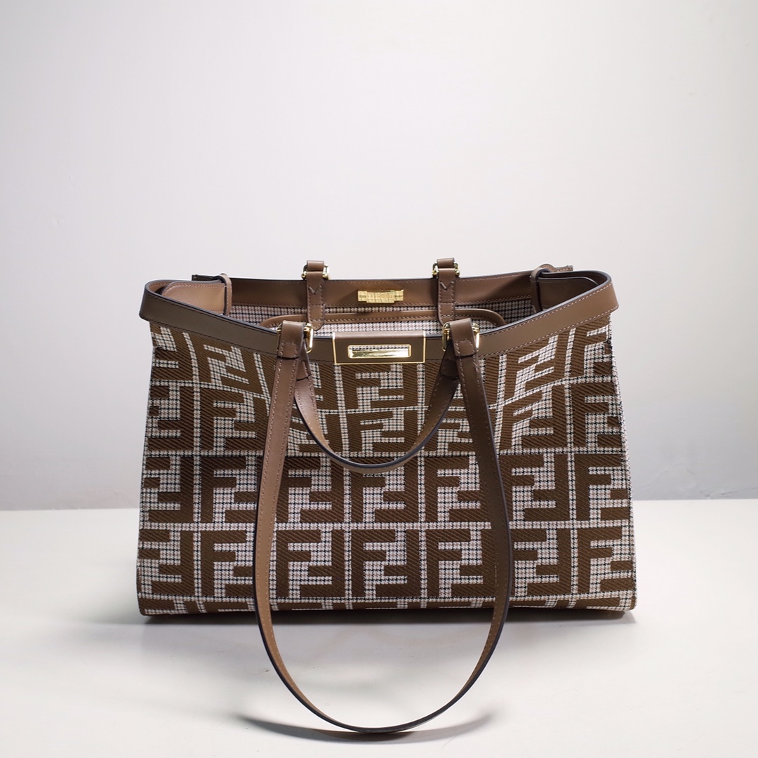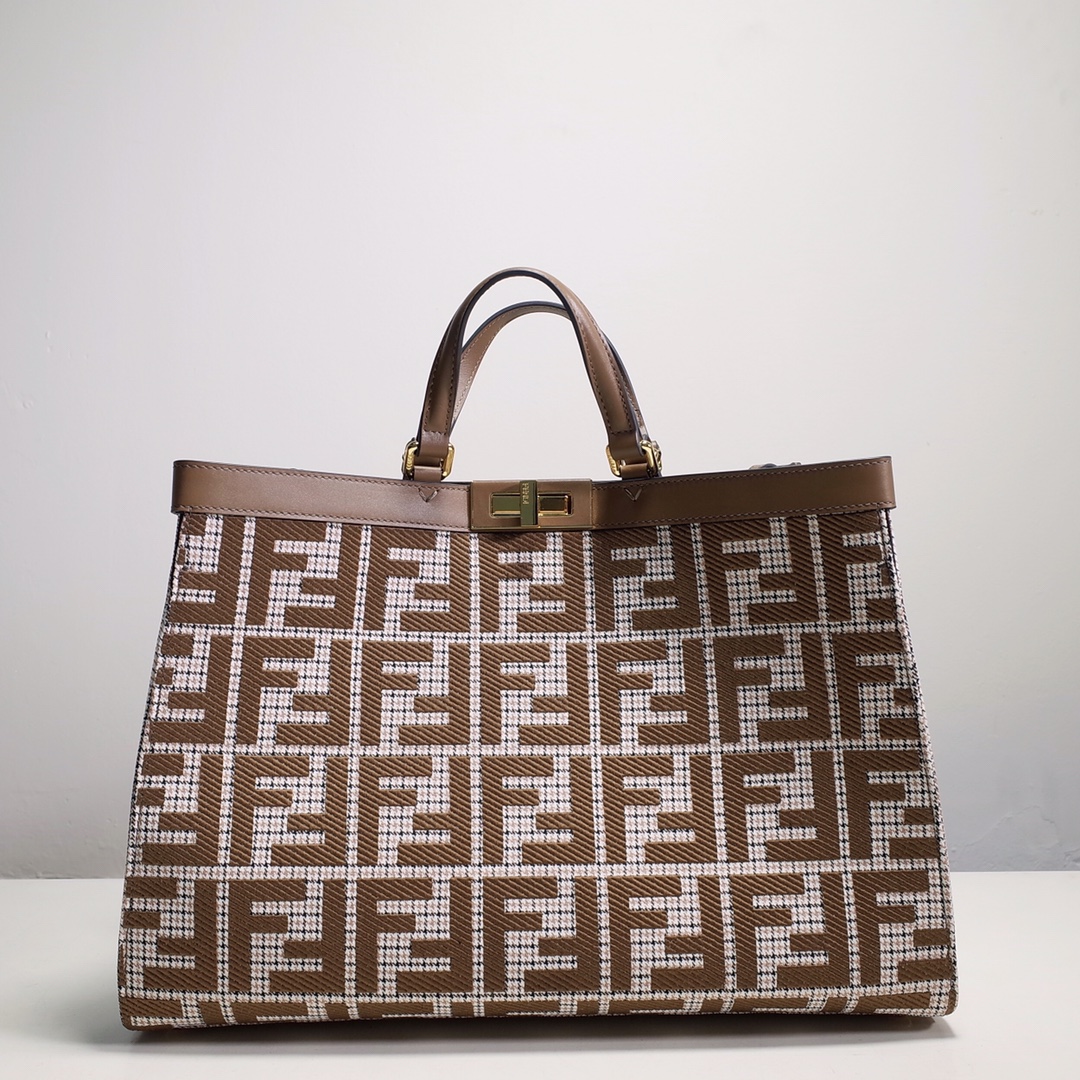 Fendi X-Tote medium bag in brown houndstooth wool with embroidered FF pattern. Featuring tonal leather trim and a classic twist lock. Unlined and fastened with a snap button, pockets and hardware in grey and gold finishes with two short hand-held handles and two long handles that can be carried over the shoulder. Size: 41*16*29.5.8374