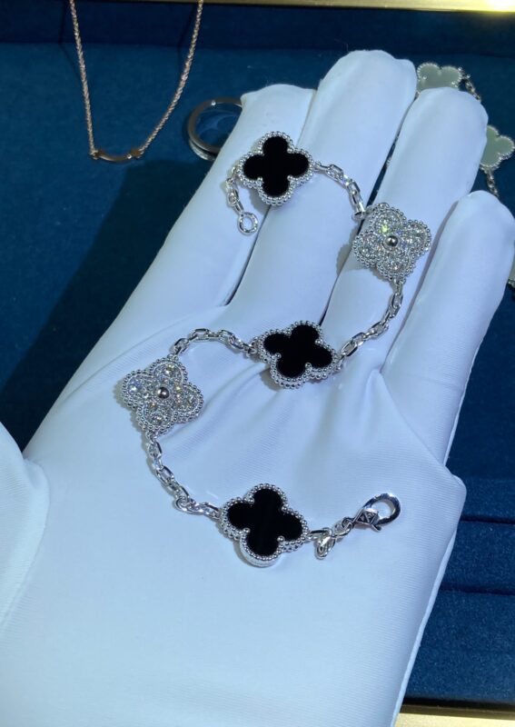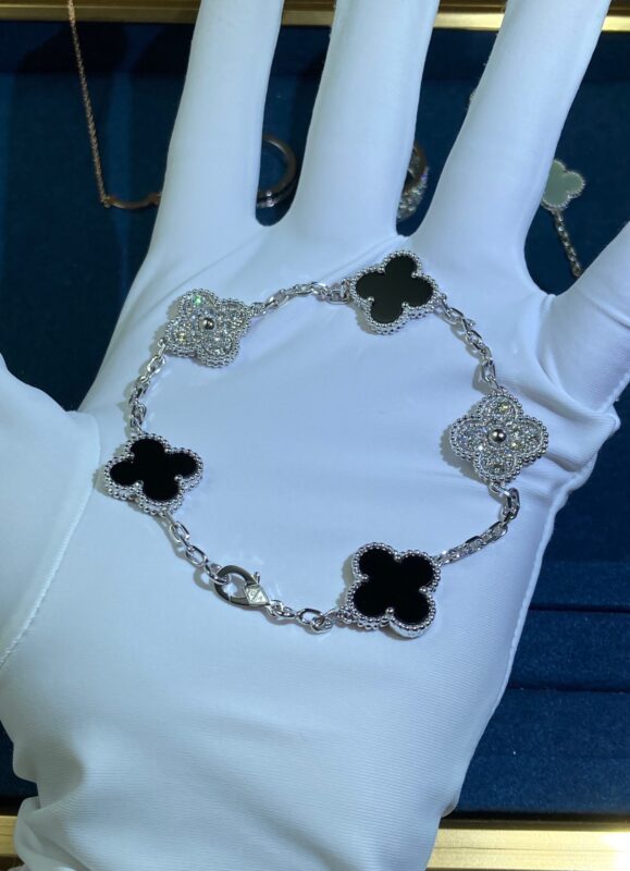 Five-Flower Black Onyx Diamond Clover Bracelet, White Gold