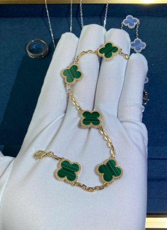Five-Flower Malachite Clover Bracelet, Yellow Gold